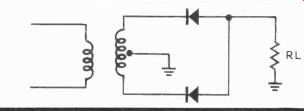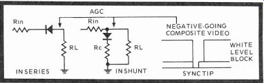 ... receiver cathode ray tube to go white to the point of blooming with no incoming signal because of negative carrier modulation, and the absence of carrier means "whiter than white." Black level clamping, therefore, is normally used in most systems, along with some slight capacitor coupling, at least in the luminance channels. With no incoming signal, then, the CRT is dark and excessive current isn't drawn. To translate, getting undistorted television signals to the chroma and luminance amplifiers has always been a problem because of the characteristics of the video detector diode. And although the old faithful germanium diode in most systems works fairly well, it is basically nonlinear. Any uses unidirectional characteristics of doping and crystalline structure to produce an output voltage proportional to the level of detected modulation-less a 0.2-volt drop. The operation equation may be set forth in terms of current: i = {g/(1+9R1)} ei where g is diode conductivity, R1 the terminating impedance, and ei, the input voltage. Diodes may be connected in series or shunt, depending on biasing and the source and load impedances (Fig. 6-2). Both diodes, in these examples pass only the negative half on the demodulated waveform. If an effective 2-diode arrangement, such as outlined in Fig. 6-3, were designed, there would be considerably less harmonic distortion because of full-wave rectification, and the carrier frequency would be doubled, cutting most distortion in half. DIODE DETECTORS AND VACUUM TUBE VIDEO AMPLIFIERS