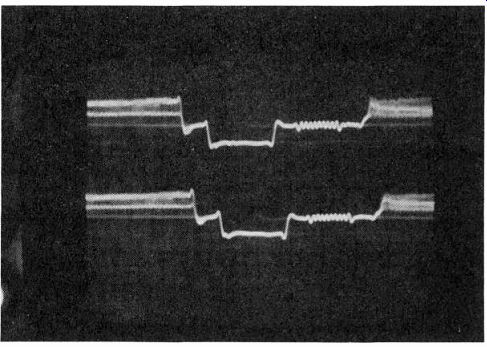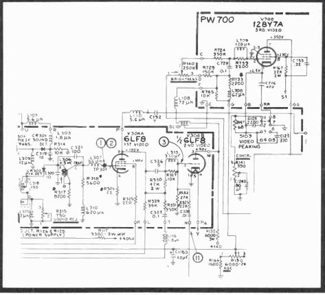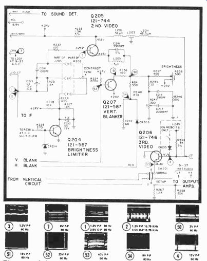 In tube receivers, only half wave diode detectors have been used for sound and video detectors as illustrated in Fig. 6-4. Here, both diodes pick off positive or negative modulation for the respective circuits, and video passes over the 4.5-MHz carrier sound trap as described in Section 5. First video amplifier V304A is de-generatively biased with a 22-ohm cathode resistor. There is a series peaking coil in the plate circuit, along with additional peaking and LC resonant circuits in the coupling and grid circuits of the second and third video amplifiers. The plate and screen grids of the first video amplifier supply signals to the AGC and sync circuits, plus chroma signals to the bandpass amplifier grid (not shown). The second video amplifier grid circuit is rather heavily endowed with both noise cutoff and vertical interval blanking inputs, plus sync-stripped video from the first video amplifier. V304B passes the luminance signal through 0.8-microsecond delay line DL101 (Fig. 6-5), and into the grid of the AC-coupled third video amplifier, the driver for the CRT cathodes. Notice in the photograph that the trailing edge of the lower trace is delayed exactly the 0.8-microsecond interval, since the oscilloscope's time base was set for 2 microseconds per div. Squiggles (9 of them) following the horizontal sync pedestal are the 9 cycles of color sync burst. The scope's vertical amplifiers were set to alternating since this frequency is much too fast for a chopped input. Actually, we put the scope on 10 microseconds per division and used a X5 extender (now 2 microseconds per division) to precisely show these two signals across the delay line. Another very useful application for a good oscilloscope-and the only simple way to discover if a delay line is good or not. High-frequency compensation is normally provided by shunt peaking with a coil, but series coil peaking isolates the effects of input and output capacitances, and so offers an advantage. Combined, shunt and series peaking permits higher gain than either used singly. Low-frequency compensation is usually added with an RC combination filter somewhere in the plate circuit of the video amplifier. Also, the value of the cathode (or emitter) bypass capacitor largely determines the low-frequency response of an amplifier. BRIGHTNESS LIMITERS, BLANKERS & VIDEO AMPLIFIERS In Zenith's C4030 video circuits (Fig. 6-6) composite video is coupled into second video Q205 principally through capacitors C213, C214, and partially through the contrast control. DC is applied through contrast R230 from the 24-volt line as forward bias, shown as 3.25 volts on the base of the transistor. Q205 has a 1.3K load resistor connected to the 24-volt supply line on one side of the collector, and series peaking coils L202, L204, and the L203 0.8-microsecond delay line in between. Signals out of Q205 go directly to the base of the Q206, the third video amplifier. The normal-setup switch in the emitter circuit removes video in the setup position. Out of the emitter of Q205 is an RLC network that includes the brightness control and vertical blanker. The base circuit of Q205 contains the brightness limiter. This latter circuit senses excessive beam current by monitoring the current out the high-voltage tripler. The brightness limiter input is clamped by Zener CR214 and thus is protected against excessive high-voltage arcs. If the HV current flow rises above normal, Q204 acts as a partial or complete switch and drops the voltage from the 24-volt supply across 10K R228 so that the contrast control and, therefore, the base of Q205 receives less positive voltage or forward bias. The lower bias reduces the conduction of the second video amplifier and its signal current output and so controls the CRT beam current. The vertical blanking circuit receives a positive pulse from a winding on the vertical output transformer. Emitter-follower Q207 applies the pulse to the emitter of second video amplifier Q205. At the end of each 15.2-millisecond vertical trace interval, the vertical output transformer furnishes an inductive kick of 23 volts p-p, turns on the Q207 vertical blanker, and the 18-volt pulse as its emitter firmly back-biases the emitter of the second video amplifier, thus cutting off the transistor. Across the 470-ohm resistor, also at the emitter, an 11.1-microsecond horizontal blanking pulse arrives following the 52.4-microsecond forward line scan. This pulse also turns off Q205 by back biasing.