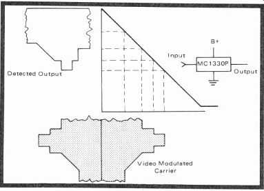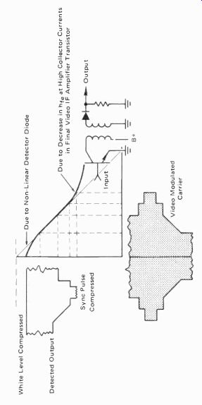 Very simply, both horizontal and vertical blanking are achieved in a single stage with a minimum effect on the second video amplifier, since there is no overstressing caused by the simple cutoff bias. Video circuits must always be blanked at the horizontal interval, you may recall, because that is the time the horizontal sync pulse is transmitted as well as the 3.58-MHz color sync burst. The vertical interval of 1.4 milliseconds per field is used for reception of vertical, horizontal, and equalizing pulses. Notice, also, the voltage dividers among the various transistors, the direct (DC) coupling, and the relatively few peaking and choke coils that are designed into the circuits. In dealing with transistorized receivers, you will find this is a normal condition rather than an unusual one. Once you understand transistor operation and have a good grasp of biasing and gain, such circuits should be considerably easier to troubleshoot. In our investigations, we have always found that in solid-state work a DC amplifier, triggered oscilloscope is indispensable. Sincerely, we doubt if you can get along without it. For instance, do you really have a meter that will measure 3.25 and 3.45 volts at the base-emitter of Q205? And if you can measure the voltage with a meter, is Q205 being blanked during the horizontal and vertical intervals at the proper times, and is its video output adequate? Worthwhile questions for, we hope, receptive minds. As we have stated, germanium diodes used as video detectors have served useful purposes throughout the years, but are fundamentally nonlinear. And when current gain in any third or fourth-stage video IF amplifier reaches a certain point and begins to decline, the amplified output will be somewhat nonlinear. This is illustrated in Fig. 6-7 and is taken from Application Note AN-545, authored by Terry Kiteley, Motorola, Phoenix. Additionally, forward impedance characteristics of the detector diode's germanium material add to this nonlinearity. These dual nonlinearities produce sum and difference beats called "tweets," which can always combine with the video signal or radiate back into the IFs and even to the receiving antenna, causing sync and video instability as well as external interference. TV manufacturers, Kiteley says, use various types of filters and shields to minimize these effects. But he also points out that a good low-level detection system without the traditional germanium diode would do away with these problems more easily. In Fig. 6-7, the modulated video carrier is outlined and shaded at the bottom, while the output is strongly influenced by the curving dark line between diode and transistor hfe, and is shown both as white level compression and sync pulse distortion.
