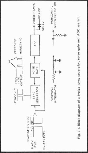 All television receivers have sync separators, most have AGC, but many do not have noise gates. The principle of the sync separator (Fig. 7-1) is simply to strip the video from the composite waveform and amplify sync pulses above the black level. Out of this action is derived the serrated vertical integrated (slowly and successively charging capacitive) pulses that time the vertical oscillator when it is not freewheeling or "fly-wheeling." These charging pulses come from the trans mitted six vertical pulses that are surrounded by horizontal and equalizing pulses, but the relatively long duration of the vertical pulses allows the integrator to charge in steps, while filtering the shorter pulses to AC ground. The horizontal pulses, of course, appear during each line scan at the 52.4-microsecond rate, while the repetition rate of the vertical pulses transmitted during field times is 31,500 per second or inversely in time at about 32 microseconds. All horizontal, equalizing, and vertical pulses are completed in a single field of 1.4 milliseconds, half the frame rate of 30 complete pictures per second. Horizontal pulses are merely RC differentiated to potentially sharpen the leading edge and filter out vertical frequencies. They become rather sharp rectangular pulses and provide precision timing for the horizontal oscillator. You can well imagine what happens when vertical pulses find their way into the horizontal sweep circuits, or horizontal pulses into the vertical sweep. Here is a pointed instance where a recurrent sweep oscilloscope is utterly useless, since there is no calibrated time base to determine the interfering frequency. There's really not much more to a sync separator. Usually, it's a single-stage tube or transistor circuit that is biased sufficiently to clip the video, and the dual outputs (vertical and horizontal sync) are sent on the way. When troubleshooting vertical or horizontal circuits, it is a good idea (if you have a dual-trace oscilloscope) to hang one probe on the output of the sync separator and work through the defective sync circuit with the second vertical input. This way you can tell if there's any frequency deviation and always have a ready reference in case something peculiar turns up, such as the vertical or horizontal starting up all by itself. It's happened! AGC is something else. The whole principle began with simple diode rectification of video which produced a DC feedback to the IF and RF amplifiers. Naturally, this has changed radically since the 1950s, and there are a number of systems in use today, most of them what is called keyed AGC. Very simply put, a keyed system operates only during the horizontal retrace time and then only on the tips of the horizontal sync pulses. Although every keyed AGC amplifier is lightly biased by some DC voltage, pulses from the flyback transformer are usually rectified by a diode to supply the operating voltage for the keyer. As horizontal sync pulses are received, the flyback transformer keys the AGC stage on, resulting in an output. The larger the amplitude of the in coming sync pulses, the greater the keyed AGC output, and the more controlling effect it has on the receiver's IF and RF amplifiers. In this way, tuner and video IF stage conduction is easily managed and the system offers not only marked resistance to airplane flutter but also gives some protection against noise pulses. Possibly in the future, AGC systems will combine keyed operation and a system based on an average AC video. The two would complement one another where each is individually least effective. Noise gates are not always included in the less expensive receivers, and sometimes you're inclined to wonder if they really work or if they're just there for nuisance value. However, were it not for noise circuits, there'd be considerably more interference appearing on color television screens than there already is. Unfortunately, noise circuits can produce some rather tough troubles that seem to defy rapid detection.