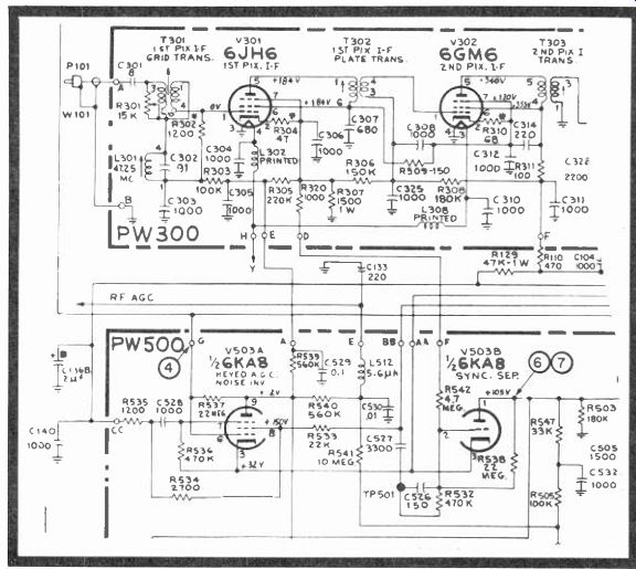 He calculates the difference in useful gain between the common-base and common-emitter configurations to be 13 db. In summary, Siwko remarks that the pole-shifting IF is relatively easy to design and suitable for mass production, with special importance attached to its use in integrated circuits. Obviously, such a stage or stages can easily be controlled by a well-designed AGC circuit, and probably will be, as developments continue in this very competitive consumer products race for bigger shares in the color television market. And automatic peak video gain under weak signal conditions, with the plus factor of noise reduction to boot, seems to make this type of IF-AGC approach quite attractive. This is another advanced circuit you will want to remember. QUESTIONS 1. Vertical and horizontal sync pulses have but one purpose. What is it? 2. What was the original AGC detector and how is AGC operated today? 3. What are the usual plate characteristics of a sync separator? 4. Can the noise-gate adjust in Zenith's AGC-sync module affect AGC? 5. What's the usual noise pulse duration in any receiver? 6. Noise pulses last milliseconds or microseconds and usually affect how many scanning lines? 7. What is the significance of the IF curves in Fig. 7-5? Next: Vertical Deflection System Also see: TV Antennas and Transmission lines Air Time--An Intro to Television Broadcasting TV and Radio Tube Troubles (1958)
