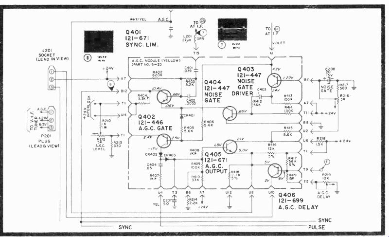 TUBE-TYPE AGC, NOISE, & SYNC SYSTEMS At first glance, these are puzzling circuits (Fig. 7-2), but basics still apply. An LC series circuit resonant at 376 kHz from the grid of the first video amplifier supplies positive sync pulses at a horizontal rate to the grid (pin 6) of the keyed AGC and noise inverter. Sync information included in the full video signal arrives at the screen grid (pin 8) through R533 and continues on to the sync separator through C526 and R532. Over regular variations in the amplitude of incoming video, the screen and control grids ride together and produce more negative voltage at the plate of V503A for larger incoming video. Keying from the flyback (with filtering) is applied to the plate circuit of V503A, where the tube is also biased from the resistive string on PW300 through terminal E. If a large spike of noise appears, the grid and suppressor work hard, the positive-going noise spike is inverted and this drives the AGC amplifier into non-conduction, cutting off the picture and possibly also the sync, although the screen grid of the keyed AGC tube would have to be driven heavily for that. It probably depends on the size of the disturbing spike. The AGC set control determines the bias of both cathodes of the keyed AGC tube and sync separator. The AGC IF negative control voltage finds it way to V301 through R302 and the grid circuit, again going into the board through terminal E. The RF AGC delay is accomplished by R540 and C530, with a charge delay of 5.6 milliseconds, and the usual drop through a 560K resistor. The sync separator bias comes through terminal D on PW300. The bias is probably slightly affected by the AGC action of V503A. Plate voltage is only 73 volts with respect to cathode, so there's not too much swing. Also, there's a 22-meg resistor between plate and grid for added bias control. The capacitors and resistors aid the grid-plate action of V503B, which strips the horizontal and vertical sync information from the overall video signal. Relatively pure horizontal and vertical sync pulses appear at the plate of the separator. The grid is fed through terminal BB, C527, C526, and R532. Bias on the grid of V503B also should be fairly high since R538 and R542 act as a grid bias voltage divider; R538 is connected to a potential of 105 volts. We would suspect bias to measure around 30 volts, since the grid normally has to be slightly more negative than the cathode for satisfactory tube operation. V503B produces a single output and separate vertical and horizontal sync pulses are derived by low-pass (integrator) and high-pass (differentiator) filters. SOLID-STATE SYNC, NOISE, & AGC SYSTEMS In the Zenith Duramodule (Fig. 7-3), negative horizontal sync pulse spikes are applied to the module at Al and the emitter of the noise gate driver, through R406 to the base of AGC gate Q402, driving this transistor into conduction which is proportional to the amplitude of the sync pulses. Pulses from the flyback transformer key CR402 on, supplying the collector operating potential for the AGC gate. CR403 rectifies the positive portion of the gate output and C207 filters out any AC so that the base of Q405 now sees a more positive DC in addition to the forward bias already applied from the +24-volt line. The AGC output stage has a certain amount of applied collector voltage also from the 24-volt line, which also supplies Q405's emitter with constant voltage and, at the same time, furnishes operating voltage for both the emitter and base of Q406 through R416 and divider R417 and R419. The AGC delay control completes the current path to ground and firmly divides the voltage drop at the base of Q406. In turn, the AGC level set controls the voltage and, consequently, the conduction point for the emitter of Q402, the AGC gate. With AGC gate Q402 operating, a positive voltage turns on AGC output Q405 and its emitter rises above 5 volts. When this occurs, a positive AGC voltage is transferred to the IFs for forward, current-limiting bias. At 6.7 volts, transistor Q406 now begins to conduct, affecting the RF amplifier after the more than one volt delay, since the Q406 emitter must be 0.7 volt more positive than the base for Q406 to conduct. The sync separator, meanwhile, takes positive video from terminal T15 through capacitors C401 and C402. Normally conducting diode CR401 is back biased by each negative in coming horizontal sync pulse tip. Video coming through C401 sets up a relatively negative voltage on the base of Q401 so that only the tops of the incoming positive sync tips overcome the bias and cause the sync limiter to conduct and pass sync in formation to the collector. During times of no signal input, CR401 supplies part of Q401's emitter bias. Noise gate and driver have a bias set control that obviously can affect both sync and AGC since the conduction point of Q402 will consume negative sync pulses, and the action of the Q404 noise gate will upset the sync limiter bias and produce distortion. In such circuits, beware of hasty adjustments. Noise gate control R216 is set so that the noise gate driver is back biased and will not conduct on normal signals. However, if a large negative transient appears at the emitter of Q403, the transistor will be forward biased and conduct, sending a signal through C403 and R412. This voltage is not inverted and so turns off the noise gate itself. Transistor Q404 then stops conducting, opening the emitter of Q401 so that it cuts off the sync limiter for the duration of the transient. Therefore, little or no AGC and no sync are generated during the nanosecond or microsecond interruption. In other words, you're missing only part of a line anyway, and the eye is normally too slow to follow any such transistory occurrence. SYLVANIA'S SPECIAL AGC CIRCUIT In the D12 Gibralta chassis (Fig. 7-4), collector supply voltages for the AGC gate are rectified pulses from the flyback transformer. Negative-going video from the first video amplifier dri