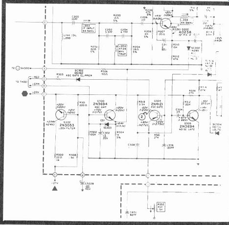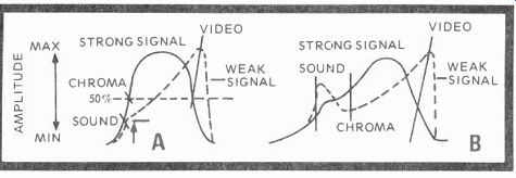 With no incoming video, the base of Q304 rises to 2.75 volts to limit AGC action. As sync tips arrive in varying amplitudes, Q304 conducts more or less and delivers pulses of proportional amplitudes back through SC302, across the D-B windings of the flyback transformer, and then to the base of AGC amplifier Q300. The large R302-C302 RC filter supplies a time constant of 1.5 seconds, sufficient to remove AC and permit only a varying positive DC drive for the unity gain emitter follower AGC amplifier. At maximum gain, Q304 develops no positive bias, so the AGC amplifier does not conduct. But first IF stage Q200 is now constant at about 4 volts, while the emitter of the IF draws about 3 milliamperes through AGC threshold diode SC200 and AGC amplifier emitter resistor R304. This current sets a level of some 3 volts at the emitter of AGC amplifier Q300 and establishes a bias for the base of the AGC-controlled RF amplifier in the tuner. With increasing signal input, the AGC gate develops a positive voltage and draws more emitter current through R304. This, in turn, reduces the current through IF amplifier Q200, and lessens the gain in the reverse AGC mode. At the same time, the voltage across R304 is constant; therefore, biasing the RF amplifier into maximum gain. With further increases of AGC voltage, current through the AGC amplifier increases and current ceases through Q200, so diode SC200 opens. Series resistors R210 and R212 become active and provide current control for the Q200 emitter with SC200 open and limit the maximum AGC gain reduction in the IF range, specifically determined for the best noise versus mixer overload. Further AGC increases will develop additional voltage across R304, delivering more forward bias to the RF amplifier. SEMICONDUCTOR AGC DESIGN CONSIDERATIONS The following discussion is based on material originated by Karol Siwko in Batavia, in which he analyzes IF response problems in semiconductor receivers and especially those coincident with automatic gain control. Pole shifting (changing the IF response with gain) has been the usual design goal in vacuum tube receivers, where changing the input impedance altered the gm in a pentode. When transistors arrived, IF amplitude, phase response, stability, and gain had to be further dealt with, plus predictable AGC performance. Bipolar small-signal transistor gain can be controlled through output and input resistance by forward AGC, regenerative feedback, and also external damping diodes for frequency and circuit Q response. Curves showing strong signal and weak signal responses are drawn in Fig. 7-5A for video IFs and at the intercarrier sound detector, Fig. 7-5B. The solid curve in each case demonstrates conventional response for strong signal reception, while the dashed curve is the signal response modified for weak signal reception. When faint signals are being received, the picture carrier is shifted to the peak of the response curve for the following advantages: 1. With the signal rise time reduced, the overall noise is down and, with most picture content in the lower frequencies, the bandwidth reduction attenuates the high-frequency noise. Also, only low energy in the picture is reduced, and this produces an improved signal-to-noise ratio. 2. Maximum gain appears at the best fine tuning point, and this extends the range of the automatic frequency control, while all traps maintain their design functions. 3. The chroma carrier is moved further down on the response curve relative to the video carrier, producing less chroma output through the color level circuits, which also attenuates color noise during weak signals. Also on feeble input signals, the sound intercarrier level is raised proportionally with that of the video carrier to maintain the sound limiting sensitivity, plus keep the center frequency amplitude response down so that the video sideband and intermodulation noise in the sound channel can be reduced. A good quality TV IF amplifier should use at least five poles in the bandpass for sufficient compromise among ...
