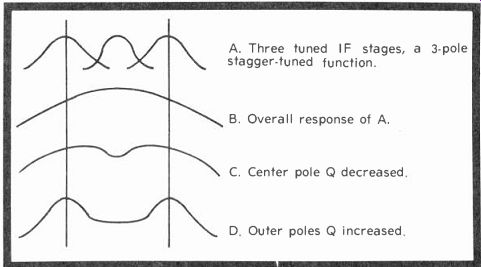 ... bandwidth, group delay, and response skirt selectivity. Fig. 7 6 illustrates a 3-pole function in its various stages, made up of three single-tuned circuits to produce the overall response illustrated in Fig. 7-6B. The curves at Fig. 7-6A represent three single-tuned circuits, such as a stagger-tuned IF system, with sound and video carriers at the top of each outside peak. The center pole Q is decreased at Fig. 7-6C and this causes the center dip, while the Q is increased among the outer poles at Fig. 7-6D, so the curve response expands at these points. Siwko then proceeds to illustrate video IF changes in gain by varying the input impedance of a common-base transistor (Fig. 7-7). He tells graphically, how the transistor beta changes relatively little with variations of emitter current, and that the emitter-to-base resistance increases almost linearly with rises in emitter current. So, he deduces, in the reverse bias operating range of this common-base transistor, its gm varies just about linearly with the emitter current. In an actual circuit, with a beta spread exceeding 4:1, the gm stays within 20 percent. The equation for gm is given by the simplified equality: A (gain) Z (load)