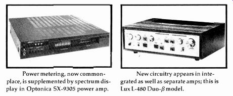 --------------- ![]() Power metering, now common place, is supplemented by spectrum display in Optonica SX-9305 power amp. New circuitry appears in integrated as well as separate amps; this is Lux L-480 Duo-Beta model. ---------------------- Once again, preamps are the object of much technical refinement and innovation. For several years, Harman Kardon has been promising that its association with Finnish audio engineer Matti Otala would result in some important new products. Its first Otala-inspired design is the Model 725 preamp ($270), in which it claims to have cut negative feedback (one factor associated with dynamic intermodulation phenomena, originally identified by Otala) by some 30 dB. Harman Kardon has opted not to use integrated circuits in its construction, claiming that they were made unacceptable by discrete components' higher resistance to thermal distortion. Lux, too, addresses the issue of negative feedback in its two new preamps, the C-500A and the C-120A. Priced at $1,400 and $445, respectively, they employ Lux's Duo-fl circuitry, which limits the negative feedback over most of the band and employs separate DC/infrasonic feedback. Maintaining correct RIAA equalization without compromising cartridge loading is one of the claims for Hegeman Audio Products' Model Hapi 2 preamp ($900), which relies on passive equalization. So does the $325 Sirius preamp from Dennesen Electrostatic, which now has a full line of electronics. A company that we reported on back in September 1979, JSH Laboratories, has been re formed under the name MTI, Inc. Its Model 500 is an all-Class A design said to provide enough output to allow use of the line amp section as a separate power amp independent of the preamp functions; it will supply up to 50 watts per channel into an 8-ohm load. Also ship ping their first preamps are Tandberg, with the $1,000 Model TCA-3002, and ADC, whose tube model was demonstrated in prototype last year. Audionics of Oregon incorporates a unique device into its RS-1 Class A preamp ($1,200): An AXIAL TILT knob makes electronic corrections for up to seven degrees of vertical misalignment of the phono pickup to improve stereo imaging. One of the most flexible preamps offered comes from Soundcraftsmen in the SP-4001, which com bines a 10-band dual-channel graphic equalizer with full preamp circuitry ($550). Finally, kit builders will appreciate the appearance of Audible Illusions. A spokesman told us that the new West Coast company plans to fill the void left when Dynaco stopped manufacturing high-quality tube amplifier kits. First offerings from Audible Illusions include a low-priced three-tube preamp, the Mini Mite I, the more sophisticated Dual Mono, and a solid-state model, the M-1. In amplifiers, integrated and otherwise, the emphasis appears to be on moderate power output combined with subtle circuit refinements. Akai's three integrated amps range in output from 37 watts (15 3/4 dBW) to 68 watts (18% dBW) per channel. The top-of-the-line Model AM-U06 ($350) features a pulsed power supply, three-step loudness contouring, and an independent recording-output defeat to prevent interference from unused decks. ReVox' integrated amp, the B-750 Mk. II ($1,000), has a rated out put of 75 watts (183/4 dBW) per channel with 1 dB of dynamic headroom. Lux has incorporated its Duo-,Blow-negative-feedback circuitry into its three integrateds, the L-580, L-480, and L-450. Kenwood has put a lot of thought and engineering expertise into its L-01A integrated amplifier ($1,500). Having determined that conventional amplifiers built on chassis formed of magnetic materials exhibit magnetically generated harmonic distortion, the company constructed this 100-watt model of non magnetic materials and separate from its power-supply module. Somewhat more conventional in construction is the Kenwood KA-500 integrated amp, rated at 43 watts (16% dBW). With the KT-500 tuner and RC-500 remote control, it constitutes a full remote-controlled system. Marantz' three new integrated amps range in power output from 38 watts (15 3/4 dBW) to 87 watts (19% dBW). The top-of-the-line PM-700 is packed with features, including a dual-channel, 5-band graphic equalizer and a Freon cooling system. Prices for the Marantz amps range from $225 to $420. Toshiba's entry is the SB-445 ($260), an integrated amp with a 45-watt (161/2 dBW) output. And Qysonic, now a division of-guess what!-Motown, has entered the electronics market with its M-1 integrated model. Rated at 85 watts per channel (19 1/4 dBW), the Qysonic is a high-speed, Class A design. Gone are the days of power amps with enough output to run a washing machine, it would seem, though some pretty hefty models continue to appear. An English company, Esoteric Audio Research, has a 500-watt (27 dBW) mono tube amp for $2,650. It also has one with an output of 100 watts (20 dBW) and a price tag of (just) $1,000. Another unusual entry is from Spectron Electronics in California, whose Class D switching amp is said to pump out 500 watts (27 dBW) per channel from its 18-pound chassis. And Infinity, which was the first to introduce a Class D amp some years back, is now offering a hybrid Class A power amp. The Model HCA ($4,000) employs tubes in the input stage and high-speed transistors in the output stage for a rated power output of 150 watts (21% dBW) per channel. SAE's three power amps range in output from 100 watts (20 dBW) to 250 watts (24 dBW) and in price from $550 to $1,000. Dubbed the SAE 01 Series, each of these amps combines two amplifiers per channel-one to handle the positive slope of a musical waveform and the other the negative slope. SAE claims that this design handles complex speaker loads-even 2-ohm loads-more easily than conventional amps. Harman Kardon's approach to low negative feedback is reflected in its Model 770 amp ($400). Though its output is a moderate 65 watts (18 dBW), the 770 employs separate toroidal power supplies for each channel. Two new Amp