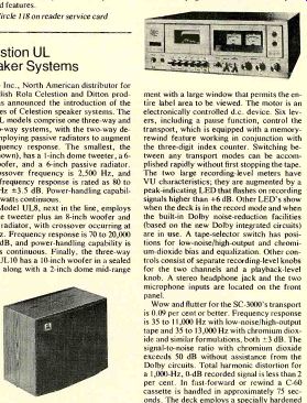The Model 200 features six front-panel LED's per channel to indicate instantaneous power output. They are marked-20,-12, -9,-6, and-3 dB, with a final LED designated PEAK (full output). The front panel is 19 x 51/2 inches and is suitable for rack mounting. The amplifier is 8 3/4 inches deep. Price: $398. An optional walnut cabinet costs $36. Yeaple "Stereopillow" The latest product to make use of the so called "near-phone" effect is the "Stereopillow" from the Yeaple Corp. The device (shown disassembled) consists of a full-size polyurethane decorator pillow containing a pair of 4-inch long-excursion cone drivers mounted on individual baffles, passive equalization networks for the drivers, and an integral 30-foot cable for connection to the amplifier or receiver. When in use, the pillow positions one driver close to each of the listener's ears (the actual distance to the ear is approximately 1 1/2 inches). The Stereopillow can be used while reclining, or it can easily be strapped to the headrest of a lounge chair according to instructions supplied. The "near-phone" effect on which the Stereopillow is based predicts that when a listener's ear is significantly closer to the front of a speaker cone than to the back, normal front-to-back acoustical cancellation of lower frequencies will be much less pronounced than for a remote listener. Therefore, satisfactory low-frequency response can be obtained with a simple flat baffle rather than a full enclosure for the driver. Frequency response for the Stereopillow is rated at 30 to 16,000 Hz, with a sound-pressure level of 95 dB achieved for a 1/2-watt input. Ordinary headphone jacks will not adequately drive the pillow, which should be connected to the speaker terminals of an amplifier or receiver. The nominal impedance of each driver plus network (which boosts low and high frequencies to provide flat response) is 28 ohms. Power-handling capability is 10 watts continuous per channel. The standard casing, for the pillow is gold velour fabric, which can be removed for washing. Custom-fabric cases can easily be substituted. Rough dimensions of the Stereopillow are 27 x 20 x 6 inches; weight is 8 pounds. Price: $79.95. Fons CQ 30 Turntable Audio Dimensions is importing the CQ 30 turntable from the Scottish firm of Fergus Fons, Ltd. It is a belt-driven unit with a servo-regulated d.c. motor that can continuously vary the platter speed over a range of 29 to 100 rpm. The three basic speeds of the turntable (331A, 45, and 78 rpm) are selected by means of pushbuttons on the motorboard. Fine-tuning controls for each speed achieve the variable settings. The turntable employs a 12-inch anodized aluminum platter supported by a precision bearing. A suspension system built into the base isolates the mechanism from external shock and vibration. Rumble is said to be less than-79 dB; wow and flutter are under 0.03 percent. The unit has a walnut base and a hinged dust cover. Dimensions are 17 1/2 x 13 3/4 x 6 1/3 inches. The basic turntable is supplied without a tone arm at a price of $300. With a factory-installed SME tone arm the CQ 30 costs $465. Pioneer SX-1050 AM/Stereo FM Receiver A new line of stereo receivers introduced recently by U.S. Pioneer includes the SX-1050 as an intermediate model. For the rated continuous power output of 120 watts per channel into 8 ohms from 20 to 20,000 Hz, harmonic and intermodulation distortion are 0.1 percent or less. Signal-to-noise ratios are 75 dB (phono) and 90 dB (high-level). The IHF FM sensitivity is 10.3 dBf (1.8 microvolts) in mono and 15.7 dBf (3.35 microvolts) in stereo, with 50-dB quieting specified at 14.5 dBf (2.9 microvolts) in mono and 36 dBf (34.5 microvolts) in stereo. The FM signal-to-noise ratios are 78 dB (mono) and 73 dB (stereo). The SX-1050 has a capture ratio of 1 dB, 80-dB alternate-channel selectivity, 100-dB spurious-response and i.f. rejection, 85-dB image rejection, and 55-dB AM suppression. Frequency response on FM is 30 to 15,000 Hz +0.3,-1 dB, and stereo separation is 30 dB across this frequency range. The program sources for the SX-1050 are pushbutton-selected and include two phono inputs (one pair of which is usable for micro phones) and one high-level Aux input. Push buttons also switch between up to three pairs of speakers, engage the low- and high-frequency filters (12 dB per octave below 30 and above 8,000 Hz) and the FM interstation noise muting, and activate an unusual circuit (intended to facilitate antenna orientation) that enables multipath distortion to be heard independent of the main broadcast signal. The SX-1050 has Pioneer's twin tone-control system, consisting of conventional bass and treble controls supplemented by an additional set that affects only the frequency extremes. The volume control is a precision step-type attenuator covering a range of 70 dB in various calibrated increments. Other controls include balance, an audio muting switch, loudness-compensation and tone-control de feat switches, stereo/mono mode, an in/out switch for any external signal processor that might be connected to the receiver, and complete tape-monitor and tape-duplication switching for two tape decks. The SX-1050 has tuning meters to indicate channel center and signal strength; illuminated legends identify program source and mode as they are selected. A stereo headphone jack and two microphone inputs are provided on the front panel. The receiver measures 20.33 x 6 3/4 x 17 7/8 inches and weighs 51 1/2 pounds. Its top and sides are enclosed by walnut-veneer panels. Approximate price: under $700. Two other models in the new Pioneer line, the SX-1250 and the SX-950, have rated power outputs of 160 and 85 watts per channel, respectively, and otherwise similar performance specifications and features. Celestion UL Speaker Systems: Rocelco Inc., North American distributor for the English Rola Celestion and Ditton products, has announced the introduction of the UL series of Celestion speaker systems. The 