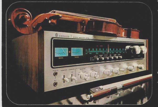 In the past few years, good specifications have become a relative commonplace in the consumer electronics industry. And, as the statistical gaps between comparably priced units lessened, other factors gained more importance. Most notably, design and the componentry that's used. Nothing could suit us better. For twenty-three years, the strength of our reputation has rested primarily on the excellence of our engineering. The new S7910 is a case in point. With a power output of 60 watts per channel [minimum FMS at 8 ohms from 20-20,000 Hz] with no more than 0.1% Total Harmonic Distortion, the S7910 is clearly equipped to serve as the center point of the most progressive music systems. More to the point, though, is the componentry that permits this capability. The output devices are paralleled OCL direct-coupled. This configuration, combined with the high voltage and current ratings of the output de vices, creates an extremely stable circuit. Additionally, the massive power transformer and twin 12,000 uf filter capacitors, backed by a zener regulated secondary power supply, ensure the S7910's ability to perform well beyond the demands of normal use. The S7910's IHF FM Sensitivity rating is 9.84 dBf [1.7 µV]. That's one of the finest ratings attain able-and it can only be achieved through the utilization of superior componentry. 4-ganged tuning capacitors. Dual-Gate MOS FET's. Phase Lock Loop MPX. Ceramic FM IF Phase Linear Filters. And Sherwood's newly-developed digital detector, which introduces virtually no distortion to the signal and never requires alignment. The front panel of the S7910 reflects every significant function of current hi-fidelity technology. And again, the componentry behind the faceplate is the finest available. [For example, the 3-stage Baxandall tone circuit employed for the Bass and Treble controls.] Other features, such as the Master Tone Defeat switch, switchable FM deemphasis and FM Stereo Only, and two front panel tape dubbing jacks, contribute to an operational versatility that is truly outstanding. In every respect, the S7910 demonstrates the attention to detail, the on-going effort to refine existing solutions and discover better ones, that has characterized Sherwood throughout the years. You might be able to find another receiver in this price range that offers similar specifications-on paper. But you won't find a receiver that's been more meticulously designed, or more carefully produced. At Sherwood, we approach the business of creating receivers like an art. Because no approach brings you closer to reality. Sherwood Electronic Laboratories, Inc. 4300 North California Avenue Chicago, Illinois 60618 USA. For a more complete description of Sherwood's unique approach to audio equipment engineering, write to the address above. We'll mail you a copy of our new brochure, "The. anatomy of high performance design," along with detailed information about the new S7910. SHERWOOD--Everything you hear is true. --The value shown is for informational purposes only. The actual resale price will be set by the individual Sherwood Dealer at his option. The cabinet shown is constructed of select plywood with a walnut veneer covering. ---Model 58910 offers identical specifications and features, but is FM only. ![]() Also see: |