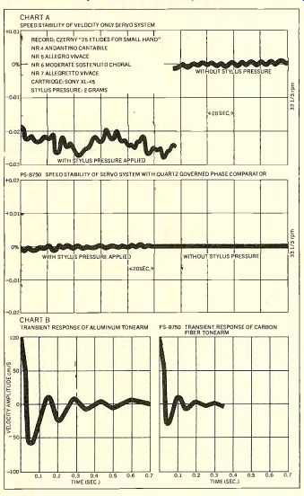 It would be a shame. People responding to something because it costs $900. Not because it's worth $900. People captivated by price, not performance. We at Sony don't want anyone spending good money for a great turntable for a bad reason like an impressive price tag. Especially because there's so much technology in the PS-8750 for you to fall back on. After you spring for the $900. So before you spend a lot of money on us, spend at least a little time with us. Total speed accuracy is our speed. Speed accuracy can be a problem for turntables because the stylus continually puts pressure on the record (and, in turn, on our engineers.) In fact, as little as one gram of stylus pressure can cause a slow down in record speed. A slow-down that is particularly noticeable in loud passages. Up till now, most good turn tables achieved accuracy with a direct drive motor and a servo-system to control speed variations. It was fine for most people. And it still is. But for those with more elegantly attuned hearing, it's just not good enough. That's because the servo-system will not serve when it comes to small, low-frequency speed variations. It is not sensitive enough, and the result is there to be heard- if you have the discernment to hear it. To get around this, Sony took the conventional servo-system and revolutionized it by adding a quartz reference and a phase lock circuitry. That mouthful is really easy to digest. The stable quartz generator emits a constant frequency. Any variations in speed monitored by the magnetic head are converted to changes in the phase of the signal. This is, then compared against the quartz generator's phase signal. If they do not match, our Xtal-Lock correct the speed variation instantly. A conventional servo-system has to wait for the error to appear as a change in frequency, and then it takes time to correct it. Sony can make the corrections 10 times faster. And within one cycle. All because Sony uses the phase difference as a source of information on speed error, rather than using the angular velocity. Chart A dramatically illustrates the dramatic difference. Cartridge sold separately. ----------- Why our tone-arm costs an arm and a leg. After conquering the drive system, Sony sped along to the tone-arm. The problem: constructing a light, strong tone-arm that has a Now resonance quality. A high resonance quality means the tone-arm vibrates-performing a duet with whatever record is playing. Sony wrestled with the arm problem and came up with a different material: a carbon fiber of enormous strength and equally enormous lightness. Moreover, it has a much smaller resonance peak than the aluminum alloy commonly used. (See Chart B, where the difference is demonstrated:) The carbon fiber worked so well that it was even incorporated into the head shell of the PS-8750. But Sony didn't stop at the tonearm's construction. Next came the actual operation of it. Mast turntables have one motor, operating both the drive system and the return mechanism. Meaning that the turntable is linked to the tone-arm. And very often, this linkage produces a drag on the arm. The PS-8750, however, proves that two motors are better than one. The motor that runs the tone-arm is totally isolated from the other motor that runs the turntable. This eliminates the drag, particularly the drag at the very end of the record. This drag is really a drag, because the return mechanism is preparing to activate itself, and the friction is therefore increased. Sony further innovates by designing pick-up and return cues that are optically activated. Like the doors in a supermarket, if you will. With the PS-8750, you get the best of the direct drive manual and the best of the semi-automatic. With none of the worst of either. Does your turntable give you bad vibrations? The same sound waves that travel from your speakers to your ears also travel to your turntable. This transference excites the equipment. Becoming acoustic feedback, or IM distortion. And the louder you play your record, the more of it you get. There's cabinet resonance. Caused by sound waves. ![]() And there's something called record resonance. Caused by the friction of the stylus in the groove of a warped record. Sony, however, deals resonance a resounding blow. We have built the PS-8750's turntable base of an inorganic material that is acoustically dead. We have also undercoated the platter with an absorbing material that prevents it from transferring any bad vibrations to the good vibrations on the record. And we cut down on record resonance by pumping a silicone damping material into the record mat itself. By having contact with the entire record surface, it offers more support. Not for people who want the latest. But the greatest. The PS-8750 represents a tonnage of innovation and a couple of real breakthroughs. It is not for those who want to spend $900 so they can say they spent it. It is for those who want to spend $900 so they can hear they spent it.