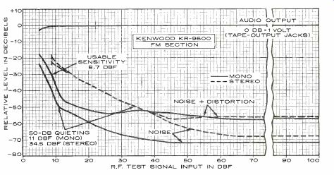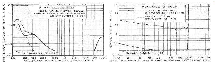 The output stages, featuring fully complementary-symmetry transistors, are directly coupled to the speakers. A fast-acting relay protects both the output devices and the speakers from damage, as well as providing a time delay that eliminates thumps when turning the receiver on or off. At its input, the KR-9600 is unique in having separate preamplifiers for each of the two phono in puts. The PHONO 1 input, which has a 2.5-millivolt sensitivity and a 250-millivolt overload rating, uses an FET input; the PHONO 2 preamplifier, rated at 5 millivolts sensitivity with a 500-millivolt overload rating, uses a bi polar-transistor input. The KR-9600's tone controls consist of knobs for bass, mid-range, and treble frequencies. They can be bypassed by a DEFEAT switch. The tone controls, like the volume control, are lightly but positively detented in steps. The receiver can control two tape decks, with front-panel switching for recording on either machine or dubbing from either one to the other, while monitoring the play back from either one or listening to the source signal. A novel feature is the receiver's "sound injection" circuit, a variant of the microphone injection system found on some other receivers. Kenwood's system provides a fading and mixing action as the mrc LEVEL knob on the panel is rotated. It smoothly fades out the signal from the selected program source and inserts the signal from a microphone plugged into the front-panel jack. This injection action takes place only at the tape-recording outputs and does not appear in the receiver's audio outputs. The FM tuner section of the receiver is of comparable quality, featuring two r.f. stages, a five-gang tuning capacitor, an eight-element linear-phase filter, and a phase-locked-loop multiplex demodulator. A switch on the front panel converts the de-emphasis time constant from 75 to 25 microseconds for use with an external Dolby adapter. The two tuning meters read channel center and signal strength for FM (the latter is also the AM tuning indicator). A button on the front panel converts the signal-strength meter to read FM modulation strength, from 0 to 100 percent. In this mode, the meter has a fast response with little overshoot, and it can be used to set up recording levels on a tape deck for most effective use of the machine's dynamic range. Two other meters monitor the audio-output levels. Their logarithmic scales read from 0.1 to 200 watts, and a nearby but ton increases the meter sensitivity to cover a 0.01- to 3-watt range. The Kenwood KR-9600, as might be expected, is large and heavy. Its satin-finish front panel is 22-Th inches wide and 6 3/8 inches high; the receiver extends about 16 1/2 inches behind the panel. All rear connectors are recessed and do not protrude beyond the case limits. A pair of rugged and attractive handles are supplied for mounting on the panel if de sired (the 53-pound weight of the receiver makes this very desirable), and the overall depth of the receiver including handles is 18 1/8 inches. The front panel has pushbutton switches for low- and high-cut filters, 20-dB audio muting, power-meter range selection, FM meter mode, 25-microsecond de-emphasis, and FM muting. The large tuning knob, which operates a very smooth flywheel mechanism, is to the right of the dial. Across the bottom of the panel are knobs for the tone controls, volume (with a concentric ring for balance), the input selector (AM, FM, PHONO 1, PHONO 2, Aux), and speaker switching for three pairs of speakers or one combination of two pairs. Lever switches control on/off, loudness (with two degrees of compensation), tone-control defeat, mode (MONO, STEREO, REVERSE), tape monitoring from either deck or the source, dubbing from either deck to the other, and the SOUND INJECTION circuit. There is also a headphone jack on the panel. In the rear of the receiver are the many in put and output jacks, including preamplifier outputs and main-amplifier inputs, joined by removable jumper links. There are outputs for connection to an oscilloscope for multipath indication; the horizontal output is also intended to drive any future discrete four-channel FM decoder when and if it becomes available. There is a hinged AM ferrite-rod antenna, and terminals are provided for 75- and 300-ohm FM antennas as well as an AM wire antenna. Insulated spring clips are used for the speaker outputs, and there are DIN sockets as well as phono jacks for the tape-recorder connections. One of the three a.c. sockets is switched. Price: $750. Laboratory Measurements. Following the standard preconditioning period, during which the receiver became only moderately warm, the amplifier outputs clipped at 189 watts into 8 ohms, 264 watts into 4 ohms, and 115.5 watts into 16 ohms (both channels driven at 1,000 Hz). At most power levels and frequencies, the distortion was below our residual measurement level of about 0.003 percent. With a 1,000-Hz test signal, total harmonic distortion (THD) was less than 0.003 percent at all levels from 10 watts up to 180 watts, reaching 0.006 percent at 190 watts just before clipping occurred. The intermodulation distortion (IM) was between 0.015 and 0.03 percent from 1 watt to over 190 watts. It rose somewhat at very low power levels-about 0.2 percent at 16 milliwatts. At the rated power output and at levels of-3 and-10 dB, the THD was about 0.02 percent at 20 Hz and less than 0.003 percent from a couple of hundred Hz to 10,000 Hz, climbing to 0.008 percent at 20,000 Hz.
