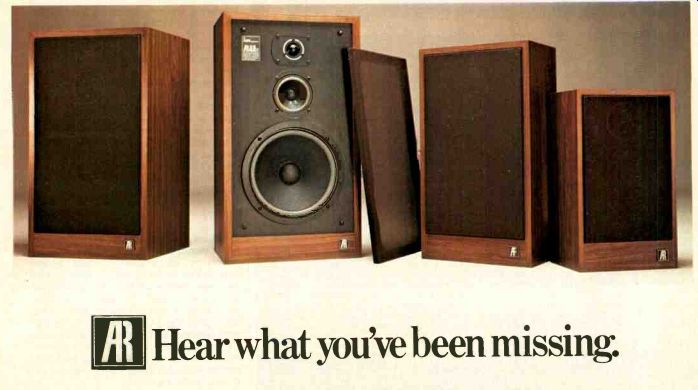 Except the sound. We invented the acoustic-suspension woofer, and they copied that. We invented the hemispheric dome tweeter, and they copied that. What they can't copy is the sound whose bass Stereo Review calls "deeper, flatter and cleaner than that of any other we have tested." The sound High Fidelity says "will satisfy the discriminating listener long after others have lost their charm." See your local AR dealer and hear for yourself. Stereo Review on the AR 9 July 1978 High Fidility. In the AR 28s, July, 1981. AR -- Hear what you've been missing Teledyne ACOUSTIC RESEARCH, Write for information and authorized dealer locations. 10 American Drive, Norwood, MA 02062 USA Also see: