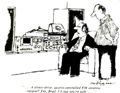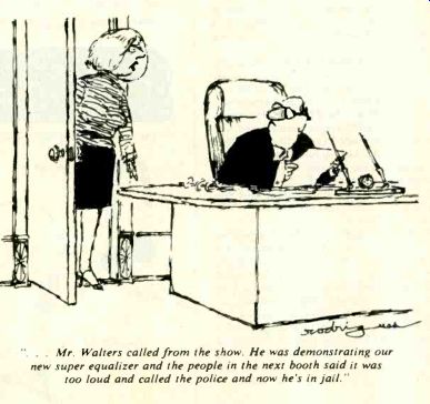 ![]() ![]() Cartoon: ... Mr. Walters called from the show. lie was demonstrating our new super equalizer and the people in the next booth said it was too loud and called the police and now he's in jail." Headphones. The impact on head phones of the Walkman-type personal portables was fairly evident. Audio-Technica announced that its Point One, Point Three, and Point Five headphones will all now come with 3.5-mm stereo pugs to fit the mini-portables' jacks and that the phones will be packaged with adaptors (also avail able separately) for the 1/4-inch jacks in most home equipment. The adaptor packed with the Point Five models will be combined with an extension cord, while the cord attached to the phones themselves will be shortened to prevent tangling. Since these small portables and their phones may be used outside in any weather, A-T offers ear muff-like Eskimo Winter Pad covers for small phones ($8). Koss' Sound Partner phones, introduced at the winter CES last January, paid even more attention to portability: they come equipped with adaptors for 3.5-mm mono earphone jacks as well as 1/4-inch stereo ones, and they fold for easy carrying. Stanton's Model XII Micro Wafer phones come with similar adaptors, but only one per phone-mono with the XI Im, stereo with the X I Is. Kenwood introduced three Light 'N Easy phones, the KH-7, K H-5, and KH-3. Mura added the Model HS (S15) to its ultralight "Red Set" line plus the new "standard" lightweight HV- 190 ($30). Sony. which started it all, expanded its miniature MDR headphone line with six new models, for a total of eight. Five of the six, ranging from the MDR-1T ($30) to the MDR-80T ($85), come with Unimatch adaptors for 1/4-inch stereo jacks. The sixth is (ES 81 the MDR-E33 ($35), lightest of the light, whose drivers hang directly from the ears without a headband. Koss has created a new two-way studio design, the Pro/4x, employing both a piezoelectric tweeter and a moving-coil element for lower frequencies. The two appear to be coaxially mounted within circumaural cushioned, closed-back earcups. Pioneer has brought out three new models, with the Master-IS being a comparatively conventional design and the SE-L5 and SE L3 ultra lightweight types. AKG's single new headset, the K-130 ($49), employs supra-aural earcups and transduction elements that are derived from moving-coil microphone elements. Beyer is using similar technology in a new line of three lightweight phones, the DT 330, DT 550, and DT 880. Tape Accessories. The most common tape accessories were head cleaners. The new Allsop 3 Ultraline has dual cleaning pads for auto-reverse cassette decks and comes with replacement cleaning pads; it's $15 in a soft case with a large bottle of cleaning solution, $10 in a smoked-plastic box. Broughton's Clean-n-Check ($7) not only cleans the heads but measures on a built-in gauge how well the tape transport is working. Discwasher's first tape product, the Perfect Path head cleaner, uses a dry, non-abrasive approach. Sony announced a slew of new tape accessories. For general use, there's a high speed tape eraser/winder, the BE-100 ($70), which rewinds and erases a C-60 tape in less than three minutes, and a $40 illuminated head demagnetizer. Another new entry, the RM-65 Synchro remote-control unit ($25), can be used to synchronize many of Sony's new cassette decks and turntables with each other for easier taping from records. Sony also introduced two new timers, the PT-77 and PT-55. The PT-55 ($95) can be programmed to start and stop a tape recorder at one preset time up to twenty-four hours in advance. The PT-77 ($195) can be set for up to eight events over a seven-day period. Sansui added the $150 AT-15 timer, a one-event, twenty-four-hour model, to its Super Compo systems line. Onkyo too showed a new timer, for $125, with convenient forward/reverse time setting, and Pioneer's DT 510 timer ($120) was also on display at the show. Disc Cleaners and Other Accessories. For record care, Audio-Technica announced the Techni-Clean Audiophile Record Maintenance System ($25), a brush with a unidirectional plush pad and a conductive body to drain away static charges. The kit includes a brush for cleaning the pad and a storage base to keep dust off it between uses. Hitachi had an automatic record cleaner that spun itself around the disc. Robins was the first I know of to pro mote the same accessories for audio and videodisc care: a forty-disc, L-shaped folding record rack and the Rob-o-Stat II anti static gun. One could confuse the Mobile Fidelity Geo-Disc with a specialized turntable mat since it's round and black and is meant to sit on a turntable. But there the resemblance stops. Molded into its upper surface are bars and grids whose purpose is to help align phono-cartridge offset, overhang, and tracking angle. Osawa also offered a new alignment protractor, the OS-60P, a calibrated grid with spindle hole and a mirror top ($6.29). Goldring showed a new accessory line: a balance-type stylus gauge; a stylus-care kit with mirror, brush, and 20X magnifier; and an ultrasonic stylus cleaner. The cleaner actually made its debut at the winter CES, as did Signet's ultrasonic model. And Osawa had a new stylus microscope on view. Nautilus displayed Super-Sleeves ($3.50 for a pack of ten), already in use as inner sleeves for the company's Superdiscs. To help you keep track of your discs, MJ Weber introduced its Record Finder kit, a color-coded labeling and indexing system with numbered record identifiers that can be placed to indicate where discs are misfiled or missing; it's $8.95 for a 120-record kit, $5.95 for a 90-record add-on. And Monster Cable announced that it will now distribute Cramolin, a contact preservative and cleaner made by Caig Laboratories. The $12 Cramolin kit includes both cleaner and preservative solutions. New signal switchers showed up too. Phase Linear rounded out its new accessory line with the Model 190 speaker-switching module ($95) designed 