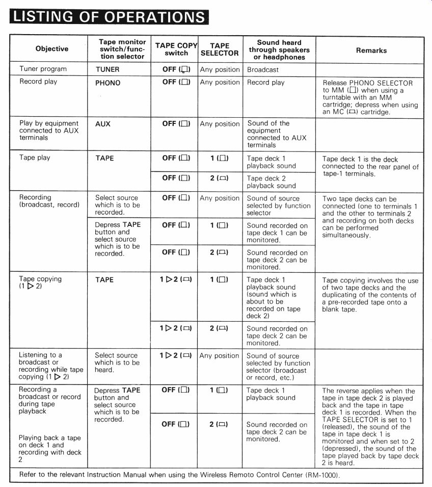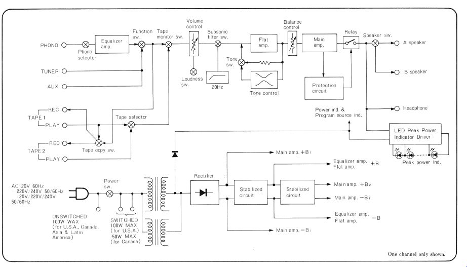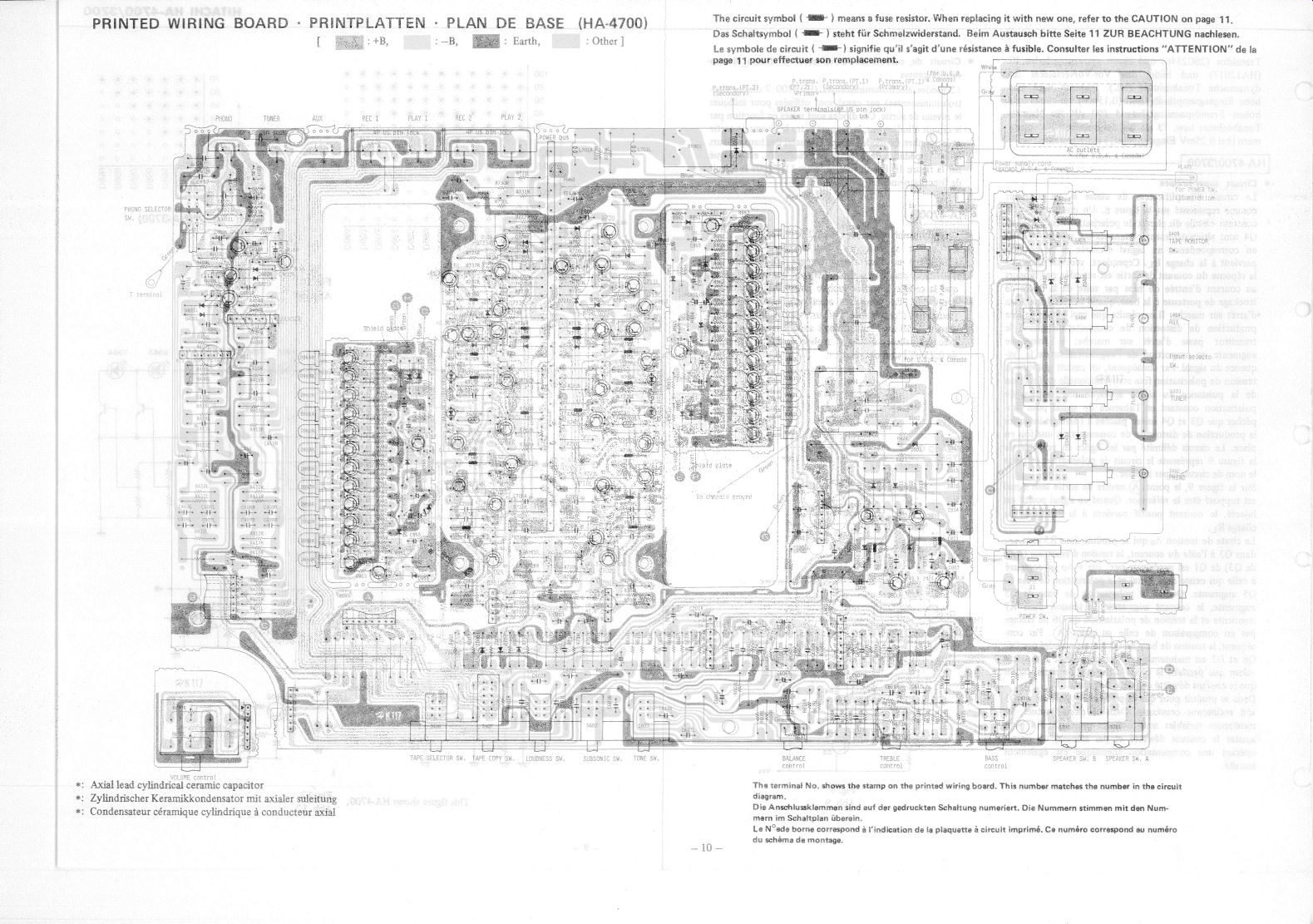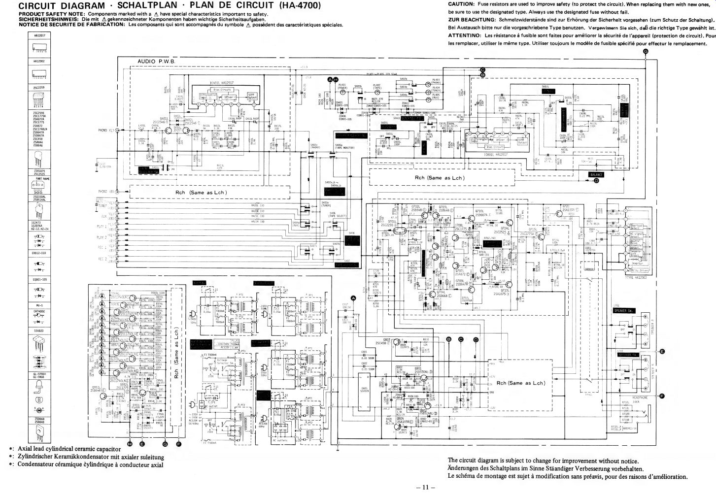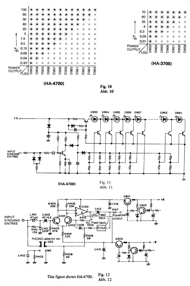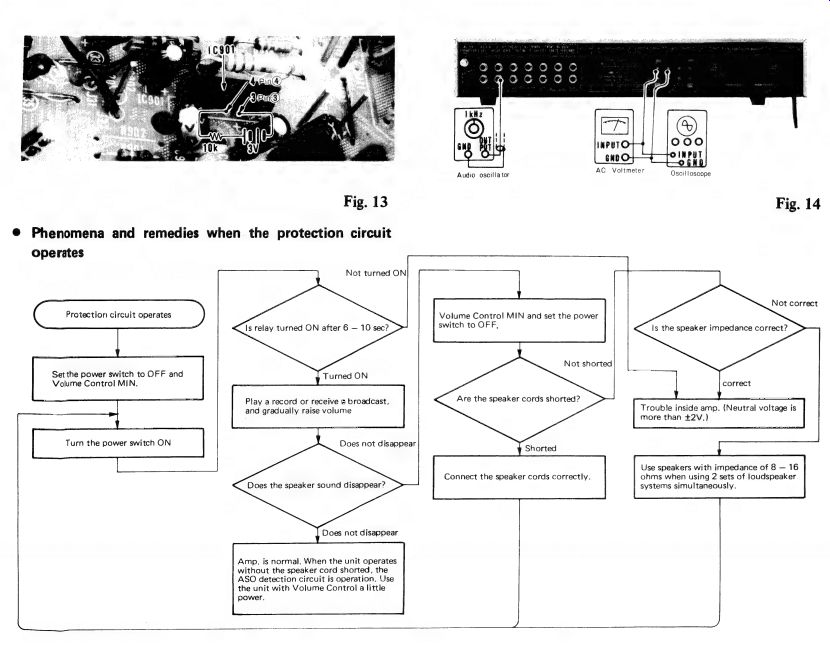 Adjust R751L(R) so that the voltage is 7.7mV. Next, adjust R750L(R) so that the voltage is mini mum (7.7mV *2mV). When this is impossible, When this is impossible, repeat items (1) and (2). (Fig. 7) Checking the super linear circuit When the balance adjustment becomes impossible (when R762 <~HA4700 or R750 «<HA-3700 is adjusted, the minimum point of current disappears and only increase or attenuation is possible) during the idle current adjustment, this indicates trouble in the super linear circuit transistors (Q705-708) so check it. (HA-3700) R719R R750R DC voltmeter R761L R723L (idle current adj.) ( Output DC adj.) R724L Fig. 6 Abb. 6 Cautions on repairing and replacing parts A4700/3700 Be careful that the measuring instrument does not touch he parts around the part to be adjusted by mistake when adjusting the idle current, etc. Carefully adjust idle current, etc. using an adjusting screwdriver insulated with tape, etc. Care has been taken in use of such parts as using fuse resistors, floating installation, etc. to improve safety. Be sure to use specified parts when replacing parts and install in the original condition. if a measuring instrument with low impedance such as the tester is used when measuring the voltage of the first-stage transistors (Q701 - 703) of the main amp, ES DC voltmeter (Idle current adj.) R719L Fig. 7 Abb.7 ![]() ![]() ![]() ![]() ![]() ![]() ![]() (1) The output DC adjustment may be changed when the parts of the stabilized power circuit or the main amp. are replaced. Be sure to check the output DC voltage. (2) Check Q803 and Q804 when the +B voltage is not present. This circuit operates to accelerate the decay characteristics to the stabilized power circuit of the +B power supply when the power is switched OFF. (3) 2 power transformers are used in this unit. When the thermal fuse of the power transformer or the primary fuse is blown, the bias of the transistors Q701 - 703 disappears and the amp. does not operate. HA-4700 /3700 Caution on assembly Be careful in layout during installation of the switch PW before. installing the switch PW Board. Board to the sub panel so that the 8-core jumper leads (3) Match the marking side (colored side) of the lead and does not touch the input selector switch. ~ mark wv stamped on the PW Board when installing the Install the PHONO selector switch to the sub panel 7-core/8-core jumper leads to the jumper socket. HITACHI HA-4700/3700 DESCRIPTION OF THE NEW CIRCUIT HA-4700/3700 Super linear circuit The class B amplifier circuit is constructed as shown in Fig. 8. A constant idle current flows from the fixed bias circuit, Q3 and Q4 are alternately switched ON/ OFF corresponding to the input signal, and current flows to Load Ry. However, with this transistor, the response of the output current is delayed with respect to the base input current due to the time of the carrier storage at the base when this transistor changed from OFF to ON. As a result, it causes generation of switching distortion when the transistor changes from OFF to ON; the frequency increases as the signal frequency is higher. So, a circuit which varies the conventionally fixed bias voltage according to the signal strength applies a constant bias voltage when there is no signal to prevent Q3 and Q4 from being set to OFF and prevent the generation of switching distortion has been installed. The circuit surrounded by broken lines in Fig. 9 shows this bias circuit; this is called the super linear circuit. In Fig. 9, the output neutral point (A) with non-signal is assumed to be the reference. When a positive signal is input, positive current flows to the load resistor Ry. Voltage drop Ay occurs in RS and Ay gg, in Q3 by means of this current, the emitter (Base of Q3) voltage of Q1 becomes higher by Av + Ay gg compared with that during no signal and the base bias of Q5 becomes higher. When the base bias of Q5 becomes higher, the current increases, the voltage across R7 becomes higher, and the bias voltage of Q6 does not change compared with that of point (A). Accordingly, the base voltage of Q2 which is biased by Q6, Q8 and D2 is kept approximately the same as that during no signal, and the idle current continues to flow. In the case of a negative signal, the reverse operation is performed keeping the base bias of Q1 constant. In the actual circuit, variable resistors are used for R2, R4 to adjust idle current, and in addition, a circuit which performs thermal compensation is installed. LED power meter drive circuit 12 LEDs (HA-3700 7LEDs) per channel are used to indicate output level. These LEDs and driven by meter circuit; the relationship between the output level and the number of LEDs lit when 82 speakers are connected is as shown in Fig. 10. Incidentally, Fig. 11 shows the operation circuit. HA-4700 Equalizer amp. circuit (Fig. 12) This circuit is composed of a low noise transistor (2S8C2546) and low noise IC (HA12017) combined, to directly connect an MC cartridge. By this, high sensitivity (input sensitivity: 0.15mV), high S/N ratio (90dB with an MM cartridge, 73dB with an MC cartridge [converted to 0.25mV input] ) are obtained. +++++++++++++ ![]() ![]() ![]() ![]() ![]() CHECKING THE OPERATION OF THE PROTECTION CIRCUIT When the output circuit is repaired by replacing the power transistors, etc., perform an operation check on the ASO (Area of Safe Operation) detection circuit and the speaker protection circuit. 1. Operation check of the ASO detection circuit for the output transistors Connect the audio oscillator to the TUNER IN terminals with the speaker terminals unloaded (speaker: disconnect). Set the frequency of the audio oscillator at 1kHz and adjust the level of the input signal so that the voltage at the speaker terminals is approx. 5V rms. Under these conditions, short-circuit the speaker terminals of the channel to which the input signal is applied using a lead wire, etc. If this short-circuit makes the ASO detection circuit operate, no output appears a
