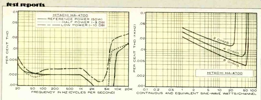 ![]() THE Hitachi HA-4700 integrated amplifier is rated to deliver 50 watts per channel to 8-ohm loads from 20 to 20,000 Hz with no more than 0.02 percent total harmonic distortion. It employs a "super-linear" output circuit similar to those used in some other amplifiers to reduce crossover distortion without sacrificing the efficiency of class-AB amplification. The bias on the output transistors is varied dynamically ac cording to the signal level to shift their operating characteristics from class-A at low levels to class-AB at higher outputs. The HA-4700's phono preamplifier can be switched for use with either moving-magnet (MM) or moving-coil (MC) cartridges. The program source is selected by a row of flat buttons with colored lights below them showing which has been selected. The inputs are identified as PHONO, AUX, TUNER, and TAPE (the last can be operated independently of the others for listening to a tax recorder's playback regardless of the regular program source). On the same horizontal line with the input-source lights are two horizontal rows of LEDs that display the instantaneous power output of each channel (based on 8-ohm loads). The lights are calibrated from 0.04 to 100 watts (- 31 to +3 dB referred to the rated 50 watts output). Green LEDs are used up to 50 watts, red ones at higher power levels. Below the power indicators are three knobs, protruding only slightly from the panel, for the bass, treble, and balance controls. There is a large volume knob at the right of the panel, and all the other controls are pushbuttons. The illuminated power switch and the headphone jack are at the left of the panel near the two speaker switches. Below the input selectors are narrow rectangular buttons for the TONE DE FEAT. SUBSONIC FIL (filter), LOUDNESS. TAPE COPY (from deck 1 to deck 2 only), TAPE SELECTOR (for playback from either deck when the input tape button is engaged), and PHONO SELECTOR for MM or MC phono cartridges. On the rear of the Hitachi HA-4700 are the usual phono-jack inputs and outputs, insulated spring connectors for the speaker outputs, and three a.c. outlets, two of them switched. The amplifier is finished in satin silver and measures 17 1/4 inches wide, 12 7/8 inches deep, and 3 1/4 inches high. Weight is about 133/4 pounds. Price: $299.95. Laboratory Measurements. After an hour's operation at one-third rated power the top of the HA-4700 (over the enclosed power-transistor heat-dissipating fins) was uncomfortably hot to the touch, but it never became more than mildly warm in normal operation.