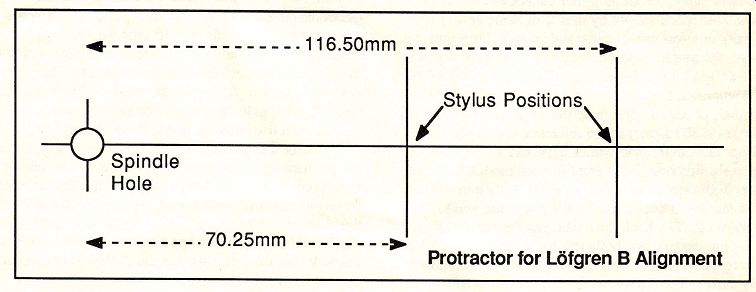 Phonography: Lateral Tracking Alignment Revisited (Maybe Your Overhang Is Wrong After All); Bonus Filler: Diagram of Protractor for "Lofgren B" Alignment; Metric Table of Optimum Overhang and Offset Angle Alignments for Pivoted Tonearms ------- ![]() above: This is a bonus filler for those who may be a little bewildered by the article on the "Lofgren B" alignment for optimum lateral tracking geometry and are wondering where to begin the fabrication of a protractor. The above diagram is drawn to scale but not printed accurately enough to be used as a cutout. Make it from scratch out of reasonably stiff cardboard and lay out very accurately the two null radii marked by the "cross hairs." Dimensions are rounded off to the nearest 0.25 mm. -------- A re-examination of the key papers published so far on lateral tracking geometry in pivoted tonearms reveals total consensus and consistency, but the granddaddy of all the researchers also suggested an alternative optimization that tends to rock the boat, as it may well be superior to what everybody is blithely using today. As the tuned-in element in the audio world is well aware, The Audio Critic exerted considerable influence in its early years (especially 1977 and 1978) over the unofficial but almost universal standardization of tonearm geometry that later became more or less taken for granted. We were not the only ones who tried io bring order to the chaos of conflicting practices prevailing at the time; others who were quite vocal on the subject included Mitchell Cotter, Sao Win, Dave Hadaway, Frank Dennesen and Mike Goldstein, the last three of whom even devised and sold various ready made alignment gauges. What made our own contribution unique, however, was an unintended development we were never really comfortable with. It seems that the alignment tables and instructions we published in Volume 1, Numbers 4 and 6 were so handy and comprehensive that they soon became widely accepted as the gospel on the subject and the starting point for all sorts of new designs in tonearms, gauges, protractors, record players, etc. Now, it is true that we had researched the situation rather thoroughly and gave our readers the best information obtainable anywhere, at least until the present moment. Even so, our intention was to help audiophiles at home and dealers in their stores, not to provide a free R-and-D package to equipment manufacturers. If it had been our plan to de sign and manufacture expensive phono products, we would have immersed ourselves even more deeply in the subject and hopefully come up with the findings we are only now reporting. (If you wanted to make reflecting telescopes for astronomers, you would not go to the science section of The New York Times for your prime reference, marvelous as it is.) Enter Graeme Dennes, the elucidator. While we were planning and writing the Winter 1982 83 issue that was never published, we had the good fortune to become acquainted with a remarkable Australian named Grzme F. Dennes, who at the time was working in the American Aerospace industry in California and Georgia. (Meanwhile he is back in Australia, to the best of our knowledge.) As an avocation, Graeme had delved into the theory, mathematical fundamentals, literature, history and implementations of lateral tracking alignment more thoroughly than any human before or since; his mission was, like Captain Kirk's, to go where no man had gone before- in that particular universe of investigation. He brought to this recreational obsession a scientific impartiality and mathematical savvy that provided desperately needed relief from the effusions of untutored techno-hysterics collecting in our mailbox. His massive thesis, "An Analysis of Six Major Articles on Tone Arm Alignment Optimization and a Summary of Optimum Design Equations," dated March 1983, is a minor masterpiece of comparative elucidation, even if it contains no previously unknown material and has not been printed anywhere, as far as we know. Originally, Graeme wanted us to publish this heavily mathematical paper in The Audio Critic, but we told him that it would be understood and appreciated only by a small minority of our readership, since it really belonged in the journal of an engineering society. Intent on exposing his work to a broader segment of the audio community, he then wrote a clear and nonmathematical overview of his findings and sent it to us in the form of a letter to the Editor. When he found out that our Winter 1982-83 issue was not happening and that we would not be able to print his letter, he sent it to Audio magazine, where it appeared in the May 1983 issue with a postscript by Barney Pisha, another recognized student of the subject. Dr. Pisha's otherwise thoughtful and receptive comments included the astonishing observation that "with the advent of the compact digital audio disc and the laser beam stylus, all this, of course, becomes moot as it is relegated to the pages of history"-as if new phono cartridges and tonearms were not being sold anymore and mounted on new turntables every day with a need for correct alignment. There can be no doubt that we are witnessing the waning days of the phono arts and that the century-old technology of a hinged stylus mechanically driven by a rotating spiral groove has a limited future. That does not mean, however, that the millions and millions of music lovers who continue to depend on that technology for their home listening pleasure cannot benefit here and now from the work of a Graeme Dennes. The fact is that the very reason for this article arises from a little-known alternative approach to lateral tracking optimization that nobody but Graeme has ever analyzed comparatively, let alone discussed in print, since its publication 49 years ago and that even he tended to treat only in passing until we started pestering him for more information. It is anything but "moot," as you will see, but first let us summarize the overall thrust of his w