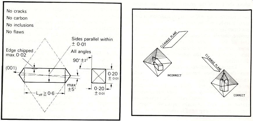 Figure 5: Stylus in correct orientation with respect to groove walls. Figure 8: The tangential area of the stylus in relation to the groove wall. -------------- Figure 1 also shows a Shibata stylus patented by the Victor Company of Japan (see stylus XKD). The shape is very close to that of the cutting stylus; the parabolic front side is created by two facets intersecting a polished cone, and the blending in of the sharp corners creates a small uniform radius over the whole contact area. But, the major radius being large, this stylus profile extends too dangerously close to the bottom of the groove; hence the possibility of mistracking as a result of the tip bottoming and getting pinched out of the groove under high modulation. In principle, all these cuts-the Shibata, the Bang & Olufsen Pramanik, Ortofon's Fine Line, Shure's Hyperelliptical and ADC's Aliptic-stem from the tip shape that was patented for Pathe Marconi in 1954, the only differences being that, to create this shape in the contact area, different methods are applied by using flat facets, rounded facets, cones, etc. (See Figure 1, stylus PMKD.) From all of the above explanations it now follows that an ideal version of the stylus must be cut or generated without facets. It could be described as an intersection of two cones with blended corners. While close to all of the above styli in configuration and design, this ideal version must also have smaller contact radii of 50 microns and 6 microns, ensuring not only that the contact area will be extended beyond what is normally attained by other designs but also that the small groove modulations will be tracked successfully. By also extending the area of contact upwards, so that the greater part of the stylus below the nominal disc surface is actually in full contact with the groove wall, this configuration applies less pressure and at the same time avoids the major problem common to all CD-4 styli, which have tips extending dangerously close to the bottom of the groove. Such an ideal stylus tip configuration actually exists and is called Paroc by Weinz of Germany and Vital by Ogura of Japan. This type of cut has only one disadvantage: since the oval cross section cannot be detected under low magnification in a microscope such as is needed to handle the stylus, mounting on the cantilever becomes very expensive and difficult. Special provisions and tooling have to be made. Diamond selection and fabrication. Diamond styli are produced in three different qualities, which depend upon the size and nature of the natural diamonds. Three diamond sizes are used: (1) well-formed, flaw less octahedrons; (2) small, 500-per-carat stones selected from grit; and for the cheapest styli (3) tiny, 1000-per-carat diamonds. (A carat is a unit of weight for precious stones equal to 200 milligrams.) The highest-quality styli are manufactured from octahedrons whose size depends upon the length of the stylus shank required. The initial stage is to prepare a rectangular rod of diamond from an octahedron. The orientation of the rod to the crystal symmetry is of extreme importance. The long axis of the rod must be within 3° of the cube axis, as seen in Figure 2, and the flat sides of the rod must be parallel to the octahedral edge (i.e., the 45° plane joining the two cube axes), as indicated in Figure 3. Square-section blanks are produced in sizes ranging from 0.14 x 0.14 mm cross section by 0.50 mm length, up to 6 x 6 mm cross section by 8 mm length. The larger blanks are produced by sawing a rectangular rod from a well-formed, flawless octahedron. The starting point for the best styli consists of extra fine-quality selected natural crystals of size 100 to 400 per carat, with no chips, flaws, carbon or other inclusions. (See Figure 4.) Orientation of the longitudinal axis is normally parallel to one main axis of the diamond crystal, in other words from 4 point to 4 point or in the (001) plane in crystallographic terms. The orientation can be done by means of X rays; however, on the smallest stones of about 0.2 mm diameter, the process takes several hours because of the low mass of the diamond to be penetrated by the X-rays and the low reflection density. This expensive orientation process ensures that the 4 point of the diamond will be well within the radius and that the 2 point (i.e., the 2-fold axis) will be normal to the groove wall when the record is played, thus presenting the hardest and most wear resistant section to make contact. (See Figure 5.) The orientation of the 500-per-carat size is less easy, as these stones are so small that they cannot be processed into rods. Some orientation can be obtained, but it is not al ways possible to arrange that the point of the tip will be within 3° of the cube axis. The smallest crystals (1000 per carat), used in the cheapest styli, are simply tumbled to a usable size; since orientation is impossible, it is a matter of chance whether the hardest part of the tip will be in contact with the groove walls. ------------------