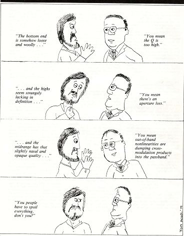 A Challenge to All Critics of The Audio CriticAny audio journalist, equipment designer, manufacturer or other audio practitioner who delights in bad-mouthing us, or maybe just automatically contradicts us at every turn, is hereby given the chance to destroy our credibility in front of all our readers. Or forever hold his peace. We continue, for indexing purposes, to number our editorial topics sequentially, picking up where we left off in the previous issue; this is not to be construed as any suggestion of a serial story. What follows is complete and independent of prior index numbers. Uninhibited criticism of other people's 28 professional efforts, no matter how scrupulous the critic, is bound to be met with hostility in certain quarters. There are always those whom the truth hurts for one reason or another; some devious minds don't even understand the elementary mechanics of truthfulness and will never believe that the child wasn't bribed to call the emperor naked. We now realize that we should have discounted such hostility and suspicion from the very beginning, as soon as we published the first issue of The Audio Critic, instead of responding to every irresponsible attack with indignation and factual arguments, as our charter subscribers will remember. Harry S. Truman, in his admiring reminiscences of General Marshall, observed that the latter had never bothered to answer his detractors. “He wouldn't take the time.” We're just beginning to appreciate the full wisdom and integrity of that stance, even if we can't exactly equate ourselves to George C. Marshall in importance. But then our bad-mouthers aren't senators, either, so the ratio remains about the same. The fact is, in any event, that our ill wishers have been quite ineffective; our subscriptions show a healthy growth pattern, and the best brains of the audio world appear to be solidly in our camp, as witnessed among others by the distinguished roster of participants in our State of the Art seminar. Every indication is that the teeny-weeny minority of audio hysterics who have inside information about our venality or know a hitherto unsuspected law of physics with which to refute us should from here on be editorially ignored, instead of being elevated from the obscurity they so richly deserve. That will indeed be our basic policy in the future, but from the point of view of our average subscriber there remains a general credibility issue that needs to be addressed. Suppose we report that preamp A is 29 vastly superior to preamp B or assert, say, that a certain nonnegotiable mathematical truth governs the limitations of subwoofer C. And suppose, no matter how carefully we qualify and document our statements, an underground reviewer or an audio store owner or a manufacturer's chief engineer then declares to all comers that we are 100% wrong, that in fact we are a certain sphincter-bound bodily orifice. How is a busy music-loving doc tor or stockbroker to determine at that point who is right? Well, of course, he can't-not without soliciting third and fourth opinions of the highest quality. But we have devised at least a first step toward clearing the air in such cases. We hereby offer all these critics of The Audio Critic the privilege of a tape-recorded debate with the Editor, the uncut transcript of which will be published in our pages. That should separate the mindlessly hostile know nothings from the responsible objectors, since we don't expect the former to want their lack of substantive arguments documented and publicized. It should also create some lively reading for our subscribers, of possibly even broader credibility than our editorial correspondence (“Box 392”), from which our detractors have been known to cop out because “you can't win when the Editor has the last word.” Well, in these transcribed debates anybody can have the last word. All he needs is the courage of his convictions. Here are the rules we propose. The 30 debate must be restricted in subject matter to assertions already made in The Audio Critic. The “challenger” must be an active and recognized practitioner of some sort in the field of audio, a person who has something to lose if it turns out he doesn't know what he is talking about; in other words, not a college sophomore majoring in literature and looking for a lark. The debate can take place in person, at a mutually convenient location, or by telephone. It will be tape-recorded from beginning to end. Either side is allowed to bring consultants, expert witnesses or any other outside support, as long as their number is mutually agreed on in advance. (One or two should be sufficient.) If necessary, a conference call will be arranged. The debate will be limited to 30 minutes, with an overrun of another 15 minutes if absolutely unavoidable. No more than that; we can't allow this feature to take over our entire publication. The exact transcript of the tape will be printed uncut and unedited, in 9-point type. Once the debate has begun, neither side can withdraw; the transcript will be printed no matter what. The whole idea is to drive the snipers out of their blinds and into the open. Other than this standing offer, we propose to take no further notice of potshots taken at us by anyone, anywhere. (Of course, we shall continue to comment on published letters to the Editor, if comments are called for.) So there's the challenge, fellas. If you're so sure you're right and we're wrong, you can now have a field day showing us up before the very eyes of our readers. It's the chance you've been waiting for. Put up or shut up. Other Misc StuffPublisher's Note Here we go again. We're late. Not as late as we were with Volume 1, Number 6, but late enough to get some of our subscribers upset all over again. We're well aware of it. In fact, we have a feeling as we bring you this unprecedentedly fat 80-page issue that these subscribers might have been happier if we had split it into two 40-page issues publi