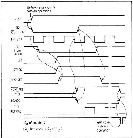 by Alan Clements, Ph.D, Teesside Polytechnic The three parts of this article are based on part of a book 'The 68000: software, hardware and interfacing' to be published next spring by PWS Boston, who are represented in the UK by Wadsworth International. ---- MEX68KECB, referred to in September's article, is Motorola's 68000 educational computer board, requiring power supply and v.d.u. terminal. The ECB has powerful monitor called Tutor which enables 68000 programs to be entered, debugged and executed. Although now somewhat dated its monitor is the basis of most educational and training systems on the market. ----------- Large memory arrays can be produced economically with dynamic ram provided care is taken over timing requirements, refreshing and the supply rail. Part 3 concludes the series. The simplified circuit diagram of the dynamic refresh generator on the 68000 board is given in Fig. 20, and its timing diagram in Fig. 21. A refresh clock operating at 7.54kHz signals the need for a burst of refresh cycles every 1/(7.54 x 103) = 0.133 ms. This design does not carry out all refreshes in one burst-it performs eight cycles every 0.133ms, completing all 128 row refreshes in 0.133 x 16 = 2.128ms. By distributing the refresh operation over 16 bursts of eight cycles, the processor is not held up for any appreciable length of time. The refresh control circuitry on the board uses the 68000 bus arbitration signals, ßR (bus request, Bc (bus grant) and BGACK (bus grant acknowledge). When 1. is asserted by a device wishing to control the system bus, the 68000 responds by asserting its BG out put. The requesting device recognizes Bc and then waits until the end of the current bus cycle before asserting BGACK to claim ownership of the bus. Once BGACK has been asserted, the requester may release BR and the old master releases B i. The new master owns the bus until it releases BGACK. A power-up, POR (power-on-reset from the processor control circuitry) goes low, clearing FF1 setting FF2. Any well-designed circuit should be similarly initialized and placed in a "safe state". In this state, Q 1 (i.e. BO is negated and Q2 (i.e. NORM/RE) is low, signifying normal operation. When the refresh clock, a simple RC oscillator, generates a rising edge, FF1 is set and BR asserted. The 68000 detects the bus request and asserts bus grant sG and-gate G1 detects the condition Bc = 0, As = 1 DTACK = 1, which occurs when the 68000 has relinquished the bus and forces input D2 of FF2 low. Note that the other two inputs to nor-gate G3 (at this time) are both low-one because we will assume HALT is negated and the other because Q2 (NORM/ RRF) is low after FF2 has been preset. When D2 is low, FF2 is cleared on the falling edge of the 1MHz clock. Output Q2 is connected to the 68000 bus BGACK input and, while low, stops the processor from regaining control of the bus. At the same time, it forces the output of and-gate, G5 low, clearing FF1 and negating 13R. Thus FF1 has done its job in this burst of refresh cycles and is once more in its initial state. When FF2 is cleared, its Q2 output goes high; it is also the NORM/REF line controlling the address multiplexer to the ram array. When high, NORM/REF selects the address from the refresh column-counter (i.c’s C1 and C2). The output Q2 is also fed back to the D2 input of FF2 via or-gate G3, so that once Q2 is high the flip-flop is held in this state and no longer depends on the state of Bc from the processor, as BG is automatically cleared following the negation of BR. Flop-flop 2 is now "locked up", Q2 high, and can only be released by the assertion of its PRE (preset) input. The final role played by Q2 is to gate the 1MHz clock in and-gate G4, the output of which is the pulsed Rñs needed in the refresh cycle. Because Q2, when low, allows counter C1 to operate, three bits of the refresh address appear on REFA01 to REFA02 Which form part of the dynamic ram's row refresh address. This counter is clocked at the refresh rate-1MHz. A second-state counter, C2, is clocked by C 1 after eight cycles and provides the remaining four row refresh addresses-REFA03 to REFA07. After the three-bit counter C1 has produced eight pulses, its Qd output rises and disables and-gate G5. This presets FF2, causing Q2 (i.e. BGACK) to be negated, freeing the processor by releasing BGACK and Q2 (i.e. NORM/REF) to go low, disabling and-gate G4 and removing the refresh clock (REFRAS). The system is now in its normal state, with BR, BG and BGACK all negated. The only change since the start of the cycle is that counter C2 has been advanced by one, so that the next time the refresh clock generates a pulse, the following eight row addresses will be refreshed. TMS4500A dynamic ram controller I have always been surprised that the semiconductor manufacturers have done so little to make it easy to interface drams to microprocessors. Some d-ram controller chips have appeared, but most of' them perform little more than address multiplexing and the generation of a refresh address. The designer still has to generate the RAS, CAT and multiplexer timing signals. To be fair, it is not easy to design a d-ram controller because the timing requirements of d-ram chips are very stringent if they are to be operated at their limits. Several controllers have been designed which include all timing and control functions on one chip and which can make a d-ram array look almost like a static ram array. One such device is the Texas Instruments TMS4500A. I am going to briefly overview the chip, but I do not intend to wade through the data sheet and applications manual in any detail here. Figure 22 illustrates its structure. A 16-bit address from the microprocessor is applied to RA0-RA7 and CAo-CA7 and is latched into the controller by the address latch enable input, ALE. If the cs input is active-low when it is latched by ALE, a memory access begins. The 4500 places the row address on its MAo-MA7 outputs and awaits a negative-going 