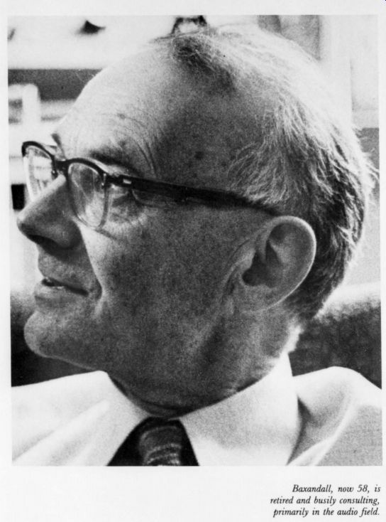 Baxandall, now 58, is retired and busily consulting, primarily in the audio field. TAA: When do you reckon your interest in audio began? PJB: Well I have a photograph taken in 1926 when I was five years old, and I can still remember being extremely fascinated by this wireless set which was then quite a new thing to me. I spent hours glued to it. I suppose that's a beginning of interest. TAA: You experienced the electronic age before you could read and write, then? PJB: Well, yes, I suppose that could be said. I had an early fascination with electric motors and things. TAA: Dud you get into model railways at all? PJB: Yes, I had a Hornby Gauge O electric model railway which used to get put out both indoors and in the garden. The boy who lived next door at that time was also interested in model railways, and we used to connect our systems together through a hole that went under the fence. The first serious interest in anything that one could consider to be hi fi occurred about 1934 when I went to stay in Cardiff with my brother, who is a good deal older than I am. He had a great friend named Hugh Ryan who had been a keen amateur radio enthusiast just after the First World War. This chap was very musical and early took an interest in what one might call hi-fi's beginnings. When my brother married in 1933 Ryan made for him what I used to describe as a local station, high quality receiver. The loudspeaker was a large baffle box with a 10" BTH RK loudspeaker in it. This sounded far better than the sort of radio set I was us ed to hearing, and I became fascinated with it. I was then beginning to be intrigued with radio principles. TAA: At what age was this? PJB: I'd be 13 or so at that time, and I was beginning to make simple little valve sets at home, so I look ed up to Hugh Ryan as being the great authority on these things, who'd made something incomparably better than anything I could ever envisage myself making. By 1937, however, I had made a device which was intended to be a high quality local station receiver. It was exceedingly crude, of course, but it had resistance/capacitance coupling which I had read was a superior thing to use instead of the transformers used in most sets at the time, and it had a triode output valve. It was an attempt to do one or two of the things that I'd read in the elementary books. It was just a reactive leaky grid detector and two RC coupled triode stages, and gave about half a watt output. Unlike most sets at the time--but like my brother's--it had tuning for two stations and gramophone. It operated off a battery eliminator with extra smoothing, so there was no hum. Well, original ly it had a moving iron loudspeaker, but it wasn't long before I acquired moving coil type. At one time I was rather proud of it-it's a museum exhibit by now! TAA: But that's how you began. PJB: Well, yes, that's the way one learns, isn't it? That was 1937 when I was still at school. TAA: School was where? PJB: King's College School, Wimbledon. By 1939 I had made all arrangements to go to City and Guilds College in South Kensington, London, to do a degree in communications engineering-I was pretty sure I wanted to go in for radio or something of that kind-but that went wrong, unfortunately, because this was the summer vacation during which war was declared, and the City and Guilds College hadn't got around in time to building sufficient air-raid shelter accommodation. At that stage everybody thought London was going to get bombed intensively right from the beginning. It didn't happen but City and Guilds decided to close down their first year engineering course. This happened two or three weeks before the beginning, so I was suddenly in a rather difficult position. My father had died about a year before; my mother wasn't capable of doing much about problems of this sort, so I talked to one or two people, particularly my brother, and sent off applications to various other possible places. I fixed up at Cardiff Technical College, really because my brother was, at that time, head of the art department in the National Museum of Wales at Car diff, and he knew some of the staff at the college. As technical colleges went, Cardiff was rather a superior one. But they didn't do a communications course, so I took a course in electrical power engineering-I just had to accept that. I didn't really expect to be allowed to go straight through: I thought I would probably have my studies terminated after a year and get put in the forces. I feel I was one of the very fortunate peo ple, I was allowed to go through and I got my B.Sc. Engineering degree there in 1942. I lived in a little village called Rhiwbina about four miles from Cardiff, and though I cycled to college most of the time, occasionally in wet weather I'd go in the bus and sometimes sat next to Mr. Vernon, head of the college physics department . As we talked he found out I was fascinated with radio and had made myself a short-wave transmitter before the war, you know, which meant I had an amateur radio license. He had undertaken to run a war-time radio and radar training course for service personnel. One of his problems was finding the staff to teach the course and also people who could quickly build up various bits of demonstration apparatus. He said to me, 'You know, it looks to me as though you ought to be able to help me quite effectively with your hobby interest in the field."" So while a student I used to go during vacations and help them a bit making bridge circuits, model aerials, an oscillator or two, for use in this training course. So when I got my degree in 1942 I was expecting I would be called into one of the forces, but Vernon managed to get me exempted from that and I became a temporary instructor in this Fleet Air Arm wartime radio training scheme. I stayed there until 1944 when it was closed down. I came straight from there to what is now called the Royal Signals and Radar Establishment (R.S.R.E.) in Malvern, though it