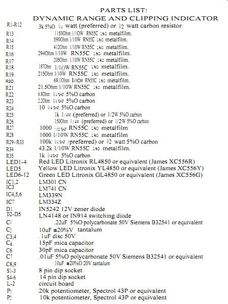 ... resistance increases to 231k. The cur rent source keeps the -60dB LED shutoff at a reasonable time. HOW TO USE IT A few comments on uses for the readout other than as a peak reading meter in your system. A pair is light and portable for tape recordists' on location use to set record levels or measure ambient room noise. If you make R34 switchable and use two readouts (one fixed and one switch able) you can measure reverberation time (approximately) by matching the readouts' - 60dB decay times. In the eight months that I have been using my readouts I have learn ed quite a bit about my system. Record surface noise is clearly measurable, as are the outputs of ticks, pops, and scratches on records. The phono preamp and cartridge out put noise are clearly measurable with gain full up. You can also measure the hum going into the amp if that is the predominant noise in your system. The dynamic range of various types of music and/or FM radio stations becomes evident. Some sources (FM rock stations) have only 3-6dB dynamic range, while one of the Boston PBS stations strains my tuner's abilities. On direct disc the peak-to-average readings will vary with the type of music and the way recordings are miked. On jazz records, e.g., Sheffield's Lab 3 The King James Version, some of the peaks are 30dB higher than the average level; the same company's classical direct disc recording of Prokofiev's Romeo and Juliet has mainly 10dB peak-to-average levels. I think you will find the dynamic range and clipping indicator a very worthwhile and informative addition to your system. ---- Also see: A Family of Power Amplifier Power Supplies -- A versatile circuit for regulated DC in quantity, by James E. Boak A High Accuracy Inverse RIAA Network -- New light and hardware for the phono curve's basic shape, by Stanley P. Lipshitz and Walt Jung |