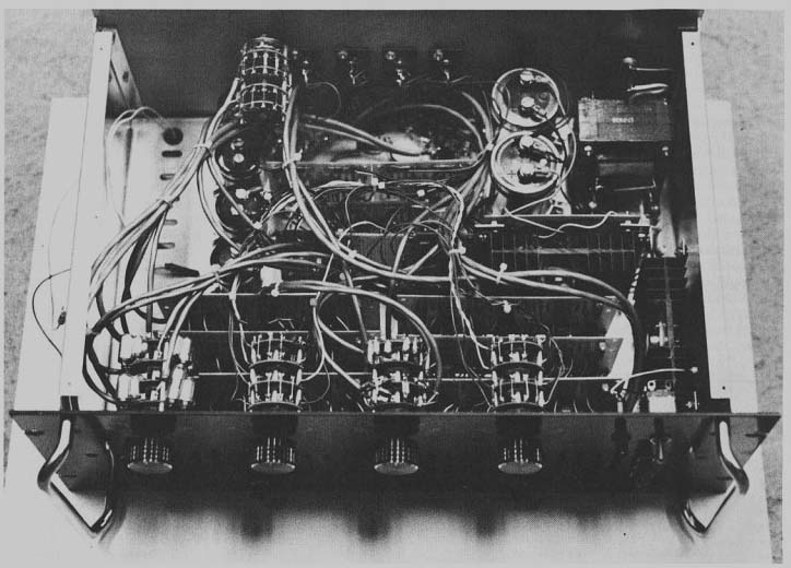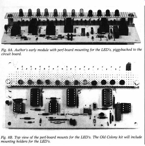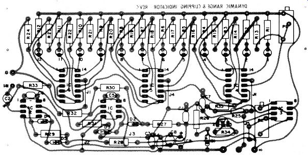 Fig. 2. Top, full sized negative of the etched circuit card the indicator. ------- ![]() Fig. 1 ... but they also allow you to measure surface noise on records and tape hiss. The - 6dB and - 3dB LEDs tell you when you are close to clipping. The + 3and + 6dB levels are valuable to tape recordists, while the + 10dB level is useful for measuring output and distortion ahead of the power amps. If you decide to change the voltage divider values be sure to take leakage currents and turn-on points into consideration. The display block consists of the 12 LEDs and their current limiting resistors, R1 - 12 . I set their value at 3k to minimize current requirements. Six boards monitor the inputs to my six amplifier channels. If I were using 20mA in each I would need a 1.5 amp supply. A 3k resistor will allow 4.3mA of current through the LED, as the LED has a forward voltage drop of about 2V. Do not use a resistor of less than 650Ohm for current limiting. Increasing the current in the LED only seems to increase the brightness off-axis. I chose green LEDs for -60dB to -6dB, yellow for -3dB, and red for 0dB to -10-dB. The power supply block consists of capacitors C3 , 4 , 8 , and 9 . C3 and C4 are 0.1uF disc for high frequency bypass while C8 and C9 are high quality tantalums to eliminate the LM339 turn on oscillations which make IC3 to run rail to rail and cause a 1MHz power supply oscillation. ASSEMBLY AND SET UP Assembling the unit is straight forward. Refer to Fig. 4 for component layout, pinouts, and orientations. I laid out the board so you can use 1 /4 or 1 /2 watt resistors in most places and .3" or .4" capacitors. If you wish, you can, use vector board to space your LEDs out from the board and use the same holes to mount the unit to a front panel (see Fig. 00). The board also has mounting holes top and bottom to allow LED orientation in either direction into a panel. The board is single-sided to keep costs down and yet maintain simplicity and performance. Maximum power supply requirements are 13mA @ -15VDC and 63mA @ + 15VDC. I strongly recommend using a separate supply for this indicator to avoid signal supply modulation. Please note the current requirements are for one channel only. The power supply in the Jung White PAT-5 modification is excellent for this use (see TAA 1/78, p. 7). Whatever you use, it should be fairly well regulated. Set up and adjust are also simple and straight-forward. Connect an AC signal generator to the input terminals, set it to 1kHz, connect a sensitive AC VTVM and adjust the signal generator to the 0-dB input of your power amplifier. Most power amps need 1.5VRMS to drive them to full output, although some go as low as 0.75VRMS and as high as 2.25VRMS. Turn pot P1 in the correct direction until the 0-dB LED stops flickering (i.e., just barely on). You will see flashes as the noise reaches the 0-dB point. You'll be surprised how much of the time you clip. Reset the signal generator to -60dB (i.e., 0-dB level divided by 1000). This is the critical and difficult part of the adjustment. Adjust Pot P2 until the -60dB LED goes out. Change directions, turning the pot until the -60dB LED flickers on. On one of the nine boards I built, one of the 301s had such high output voltage (due to offset bias) I could not null it out. Replacing the 301 cured this problem. On another board the - 60, - 50, and - 40dB LEDs all used to light up at the same time: swapping 339s cured this problem, and I added several bypass capacitors so you should have no trouble. I mention it, however, to prevent some poor reader from pulling out his hair trying to correct it. Repeat the adjustments to tweak the board into perfect adjustment. CAVEATS AND COMMENTS A few caveats about using the unit. If ... ----------- PARTS LIST: DYNAMIC RANGE AND CLIPPING INDICATOR ![]() ------------------------------ ![]() Fig. 6. Inside view of the author's unit which combines two three-way electronic crossovers with ±6dB adjustable gain adapted from Walt Jung's versatile 30Hz filter (TAA, 4/75, p. 14), and modified Old Colony crossovers, a Jung ±15V power supply (TAA, 4/74, p. 14), a PAT 51WJ-IA power supply (TAA, 3, 79, p. 24), and six dynamic range/clipping indicators. The six monitor the outputs of the two three-way crossovers. The Jung power supply feeds the six indicator circuits while the PAT-5/WJ-1A supply powers the crossovers and a pair of30Hz high pass filters. ... your preamp does not have a sub sonic rumble filter be sure to use one; otherwise you will measure the warp output of your cartridge-arm combination instead of the dynamic range of your records. The Jung 30Hz filter ( TAA 4/75, p. 14) is excellent. An easy way to determine whether you need a filter is to look at the output of a warped record between cuts. The extended high frequency response will allow you to measure CD-4 carrier leakage and tape recorder bias leakage during rewind if you have these components in your system. This readout should also show if your system is oscillating anywhere. If you use "surplus" LED's from other than the listed sources you may get a great variation in brightness. In such a case, it may be necessary to ...