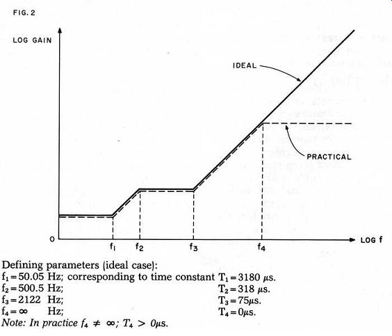 New light and hardware for the phono curve's basic shape. by STANLEY P. LIPSHITZ and WALT JUNG READERS WILL BE AWARE of the recent correspondence between the two authors regarding RIAA equalization in phono preamplifiers [1,2]. This has led to a re-examination of many familiar circuits, and has shown the need for changes and corrections to many of these in order to improve their accuracy. Extremely high accuracy can indeed be achieved by careful design, such as in the Jung-White modification of the Dynaco PAT-53 , and many readers may be interested in having available an inverse RIAA circuit of sufficient precision to enable them to measure the deviations of phono preamplifiers to a high order of accuracy, as well as to con duct critical listening tests. TAA published in 1971 [4] an inverse RIAA design by Reg Williamson, shown in Fig. 1. In original form this circuit is fairly accurate, and indeed is suitable for many requirements. However, it can be improved by changing R1 from 910k to the theoretically ideal 883.333k, or 887k ( nearest 1% value). But, even then the termination resistor R3 slightly displaces the middle RIAA time constant T2 (ideally 318-uS) from its desired value, because of the way in which the component values interact in determining the circuit's overall time constants. For a complete theoretical analysis of this see "On RIAA Equalization Networks", copies of which are available, free of charge (while the supply lasts), from the first author at Dept. of Applied Mathematics, University of Waterloo, Waterloo, Ontario, N2L 3G1, Canada. Ideally the frequency response of an in verse RIAA network should be as in Fig. 2. The corner at f4 should not occur at all (i.e. f4 = infinity Hz); in practice it is unavoidable. In general it should be placed as high in frequency as possible, so as to minimize deviations occurring in the audio frequency range of interest, namely to above 20kHz. In considering an improved inverse RIAA circuit, taking into account all significant interactions (e.g., the effect of R3 and driving source impedance), we originally felt that an active pre-emphasis circuit might be necessary. Such a design, unfortunately, introduces as many problems as it circumvents. It was then decided that a slight modification to the Williamson circuit would be most practical. The circuit is shown in Fig. 3. Pre sent owners of previously purchased Old Colony Williamson networks can easily adapt them to the new values, if they so desire.