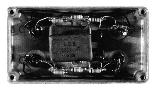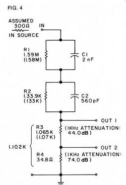 The frequency response of your oscillator can also be a limitation, as its error is equivalent to either a network error or preamp error. Therefore, unless you go to the trouble to validate your own individual network and have a more sophisticated oscillator/detector system, you should not expect much below ± 0.2dB in terms of believable error measurements. In all cases keep the capacitive loading on the output of the network to a minimum (by using short lengths of low capacitance cable and defeating any preamp loading capacitors, if switchable) for greatest hf response accuracy. Table 1 ![]() Fig. 4. An alternative inverse network suggested in the Lipshitz JAES articles. Values shown are ideal; closest 1 % values are in parentheses. Output 1 is for a moving magnet cartridge; Output 2: moving coil. The measured data listed in Table 1 were derived from a sophisticated wide band comparator system, which measures only input-output deviations and uses a DVM for readout of relative dB. It is not a true absolute measuring system (in spite of the high resolution), so the data should be interpreted in relative terms only. An alternative inverse RIAA network as described ins is shown in Fig. 4. As you can see this design uses the same general network form but has a higher impedance and is thus easier to drive. It is designed to be driven from 300 ohm sources (as noted) with network values optimized for minimum error for such conditions. The circuit of Fig. 4 is the closest one can come to meeting these conditions with standard available capacitor values for C1 and C2 . With R3 and R4 connected as shown, a second output is available. This is suitable for equalized moving-coil phono preamplifiers, and will exhibit frequency response properties similar to the basic output. Both these networks can be driven adequately from most preamplifier outputs. A stereo version is thus suitable for con ducting listening tests on phono preamplifiers, by feeding them with a musical signal from your audio system via the network. This enables one to perform a bypass test on the phono stage of a preamplifier by comparing the input signal to the network with the output o£ the phono stage (after matching gain and polarity). However, if you want to do this, take some special precautions. You must use network components appropriate for listening use. Mica capacitors, while entirely adequate for steady state bench ... -------------------- WHAT IS AN INVERSE RIAA NETWORK? THE PHONOGRAPH DISC as a reproduction medium has physical limitations which are off set by altering the bass and treble portions of the spectrum in material to be recorded. In short, the frequencies below 500Hz are cut so they will not take excessive room, and those above 1-kHz are boosted because they are too small to make a good groove. This cut/boost pattern is standardized into what is known as the RIAA curve, fostered by The Recording Industries Association of America. The material on your records is supposedly cut to this curve. If you wish to test how well your preamp does the job of restoring the recorded signal to normal and don't have anything but an oscillator which puts out signals in volts, you will have a hard time deciding just how much less bass you should be putting into the preamp at 30Hz to correspond to what the RIAA curve calls for. What you need is a device that does to your oscillator's output what the record maker's RIAA networks do to the signals going onto his recordings. The inverse RIAA network goes between your oscillator and your phono preamp. If the oscillator puts out the same level at all frequencies (they do not, usually) then if your preamp is correctly equalized, you should get the same output at all frequencies-adding the amplification which the phono preamp sup plies, of course. The inverse network supplied by Old Colony is passive and has the advantage of not distorting, but it also uses up quite a lot of the energy put out by your oscillator (see Figs. 3, 4), which is a very good thing. The signal your phono preamp wants is very small indeed and your oscillator will do a better job putting out a larger signal, too. THE EDITOR -------- ... tests, have some dielectric absorption which is undesirable for auditioning tests. Polystyrene capacitors are preferable for listening, as are metal film resistors. Input-output connections should be of the highest quality, as should be the cabling used. Finally, you must provide some means of level matching if you intend to use a direct A-B switch. Do not adjust R3 for this purpose, as it will alter frequency response! Of course all of this assumes a top quality line level source, such as a master tape. Fig. 5 shows a suggested physical construction method for either network. Leave the shields of the input and output jacks floating within the case. The box is best grounded via a flying lead to its case, which gives maximum flexibility in avoiding noise pickup. Such an enclosure will easily accommodate two networks for stereo use, as you can see from the photos in Figs. 6 and 7.