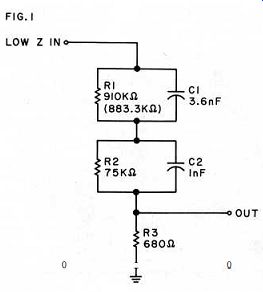 You will appreciate just how good this network really is if you examine the data in Table 1, which lists the relative ac curacy of two of these networks for various test conditions. For some time Old Colony has been supplying the Williamson network with an ideal R 1 value of 883.3k and all 1% circuit components, as shown here. In the first column shown (listed as stock), this version of the network can be seen to offer better than ±0.1dB accuracy, with sample number 1 being appreciably better (due to values which fall closer to theoretical). These measurements were taken with a 600 ohm load resistor, the kit value sup plied for R3. However, as noted above, the presence of R3 not only places f [4] at 338kHz: it also alters mid-band response. Fortunately, the mid-band error can be compensated for rather easily by minor adjustment of two network values, R2 and C2 being convenient for this purpose (as described ins). With an R3 termination resistance of 600 ohms, R2 and C2 should be altered by shunting with the R2 ' and C2' values ( noted as dotted). This yields the (compensated) responses shown in the R2 ', C2 ' columns for the two sample networks. As you can easily note, this version is much better for either case over the entire band. In both, the response drops above 20kHz, due to R3 . Network #1's accuracy is notable, and network #2 is just in excess of + 0.05dB. The result of a source resistance Rs of 300 ohms is shown in the third columns, and results in some deterioration. Notice that here the high frequency (hf) rolloff begins at a lower frequency (as expected), and also that mid-band response is not as even. The latter problem is because R2 ' and C2 ' are not the optimum value for this source resistance, having been calculated for only the R3 = 600 ohm resistance. The corresponding values of R2 ' and C2 ' for a 300 ohm source resistance should be 7.5 meg and 1 0pF, respectively. You will also note that the most serious error which occurs with the additional source resistance is in the hf rolloff, as for example in network #2. Therefore the net work's best performance will be realized when it is driven from a low impedance ( 100 ohms or less) source, with the 600 ohm termination used, and R2' and C2 ' added. If you must use a 300 ohm source resistance; you can then employ the alternate R2 ' /C2 ' values. Naturally, the degree to which you really need to observe these ground rules depends upon your final intended use of the network. If you are measuring by
