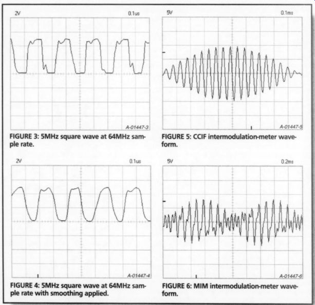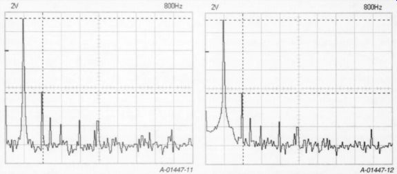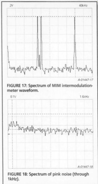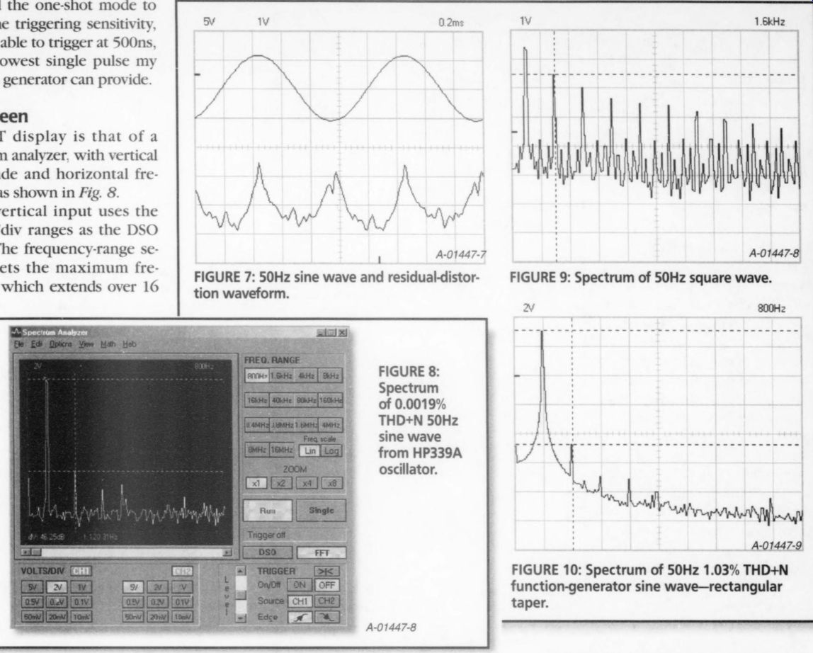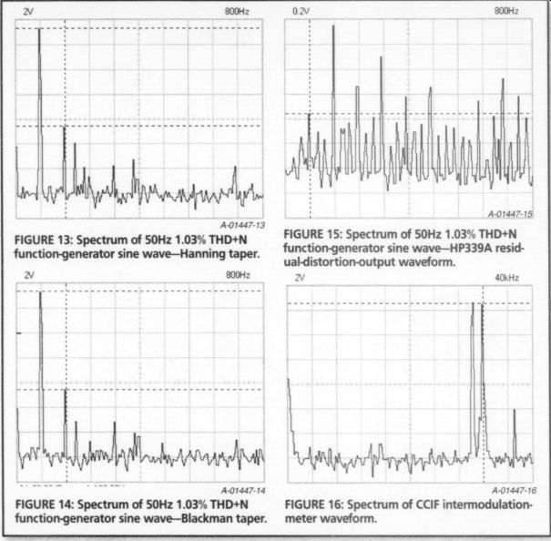 Three measurement markers are provided, one less than DSO mode. The horizontal markers measure V or dV, reading out in dBV (0dBV = 1V), and the vertical marker reads frequency. The Velleman manual says to use AC-coupling in the FFT mode, probably in order to eliminate any false even-order harmonics. The triggering circuit works on signal amplitude just like the DSO mode. The FFT display screen has a range of 80dBV, which changes with the V/div range. At the 10mV/di of the V/div range. At 10mV/div the range is from -114dBV to -34dBV, and at 5V/div the range is from -60dBV to +20dBV. I decided to use the 2V/div range where possible, with 3V RMS input signals, which gave me a theoretical range of -68dBV to +12dBV. You must be careful that the V/div range you select does not clip in the DSO mode. Otherwise, you will introduce the harmonics that result from the clipping into the spectrum. I ran a baseline of the 2V/div noise floor by selecting GND on the input switch in the 800Hz range. The peaks of the noise floor proved to be -58dBV for CH 1 and -60dBV for CH 2. The unit's DAC is rated for -55dB harmonics, all components, and 7.1 effective bits, so this unit is certainly in the ballpark. In addition, there are power-supply artifacts at 120Hz (-45dBV) and 240Hz (-52dBV), which may be caused by the plug-in power supply, given the modest --25dB supply-voltage ripple-rejection rating of the DAC, and may disappear when you're using the optional battery power pack. ![]() FIGURE 11: Spectrum of 50Hz 1.03% THD+N function-generator sine wave-Bartlett taper. FIGURE 12: Spectrum of 50Hz 1.03% THD+N function sine wave-Hamming taper. FFT Testing You can use only one channel at a time for FFT, so I chose CH 1 for the tests. I applied a 3V RMS 50Hz sine wave from the HP339A test oscillator function (0.0019% THD+N). I set the upper V marker on the 50Hz peak and used the lower V marker to measure dV in dB (actually dBr, or relative dB). While there were no apparent 50Hz harmonics, which is as it should be, the noise floor was ~63dB, which is far above the actual -94dB for this frequency. As you can see in Fig. 8, the predominant frequencies on the display are the 120Hz, 240Hz, and 480Hz signals, rep resenting harmonics from the PCS64i's own power supply. The next test was an easy one, applying a 50Hz square wave to the FFT. Since a square wave is an infinite series of odd harmonics whose amplitude is the fundamental peak times the inverse of the order of the harmonic (5 of the third, 5 of the fifth, and so on) the THD+N for a square wave is 33%. The results using the 1.6kHz range were perfect down through the 13th harmonic. After that, the measured data was one or two dB lower than the ideal until it hit the noise floor at the 23rd harmonic. Figure 9 shows the first nine harmonics. There is also some evidence of even order harmonics, which should not exist in a pure square wave. They may result from nonlinear amplification in the analog input circuit, sampling jitter, or non-symmetry in the function-generator output. I don't consider them to be a problem. Next I set the function generator for a 3V RMS 50Hz sine wave. This pseudo sine wave is derived from the triangle wave by using a diode-resistor sine shaper network, and it measures 1.03% THD+N on the HP339A. I recorded the FFT spectrum with each of the five weighting tapers (also called filters or windows), the purpose of which is to ensure that the time-domain data starts and stops at the same data value, and that the function in between is smooth. Recall that amplitude clipping can cause false harmonics to appear in the spectrum display. This can also happen if the data is not periodic in time, that is, if it does not start and stop at zero. The taper is designed to act as a frequency-domain filter, and its width and attenuation characteristics trade off the three variables of accuracy, selectivity, and noise floor. Taper Measurements Figure 10 is Rectangular, Fig. 11 is Bartlett, Fig. 12 is Hamming, Fig. 13 is Hanning, and Fig. 714 is Blackman (Black man-Harris). The Rectangular taper pass band is steep and narrow, but has significant side-lobe ripple in the reject bands. This manifests itself as a widening of the "skirt" around the center frequency, which could "hide" low-level nearby frequency components, but it has good amplitude accuracy. The Hanning taper is not as steep in the passband, but has less ripple in the reject bands, with a narrower skirt, and may be less accurate in depicting a very pure waveform or transient events. The Hanning is also commonly used to mea sure random noise. The Blackman taper is more accurate than the Hanning, and has the fastest rolloff. It is very selective, at the expense of amplitude accuracy. I applied two equal-magnitude 250Hz sine waves that were combined in a low distortion, unity-gain, inverting, summing op-amp circuit. This placed the spectrum peak at mid-screen on the 800Hz range. I then increased one of the frequencies until two distinct peaks were just visible. All five tapers separated the two signals with a AF of only 5Hz. I continued to in crease one frequency until the separation extended fully down to the noise floor. The Blackman taper AF for this condition was only 6Hz, with the Hanning close behind at 8Hz. The Bartlett taper required 20Hz, and the Hamming taper 40Hz. The Rectangular taper was not fully separated at the base of each skirt until the two sine frequencies were 110Hz apart. ![]() FIGURE 13: Spectrum of 50Hz 1.03% THD+N function-generator sine wave-Hanning taper. FIGURE 14: Spectrum of 50Hz 1.03% THD+N function-generator sine wave-Blackman taper. FIGURE 16: Spectrum of CCIF intermodulation meter waveform. ![]() FIGURE 17: Spectrum of MIM intermodulation meter waveform. Since the Hanning taper is the most common among FFT instruments, I used it to measure the spectrum levels, using the FFT program markers (Fig 13). You must disregard the multiples of 120Hz, since they occur in response 