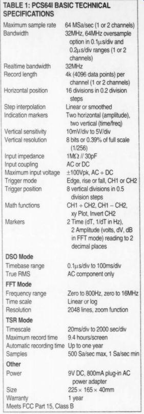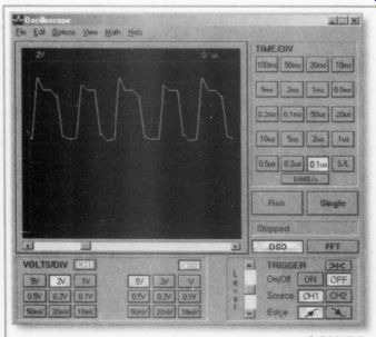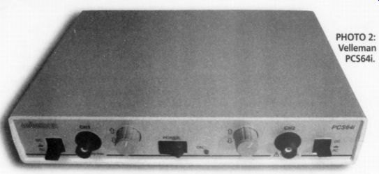 Reviewed by CH ![]() PHOTO 2: Velleman PCS64i. PCS64i Digital Storage Oscilloscope for PC; $400 US, Velleman, Legen Heirweg 33, 9890 Gavere, Belgium; US Distributor, Velleman-Kit, 7415 Whitehall St., Suite 119, Ft. Worth, TX 76118, (817) 284-7758, www. Velleman.be. The Velleman PCS64i, an 8-bit PC-based DSO, uses an interface unit that contains analog signal-conditioning circuitry and a dedicated analog-digital converter (ADC) for each of its two analog channels. The software provides both DSO and FFT functions, as well as a separate transient signal recorder (TSR). The Interface The interface unit, shown in Photo 2, is 8.75"W x 1.75"H x 6.5"D. The front panel has two BNC jacks for independent two-channel operation, as well as a power switch and LED indicator. Each channel has an input switch to select AC or DC coupling or GND, and a vertical position pot. The box connects to the LPT1 printer port with a supplied data cable. No other LPT port address is available, so you will need a switch box to access your printer if you don't wish to keep switching cables. A 9V DC plug-in adapter powers the PCS64i. You must power up the box before you start the program or connect scope probes to a live signal. Software communicates with the box to enable the computer to act as a two-channel oscilloscope display. The PCS64i is designed to use 1x or 10x scope probes (an available option that was not provided with the test unit). Other options are a rechargeable battery pack and a carrying case. Both DOS and Windows 3.1/95 soft ware are provided. I did not evaluate the DOS version since its capabilities are limited, including the lack of 64 Msample/ sec oversampling. The WinDSO software installation is simple and straightforward, requiring only 1MB of free hard-disk space. The installation program makes an additional subdirectory for data and graphics files. An uninstall program is also provided. Since Velleman makes three other PC based instruments, you must enable the PSC64i from the Option menu before you can access the PCS64i box. The four-language owners' manual is well-written, with numerous diagrams to aid in learning the PCS64i. Circuit schematics, the PC-board layout, and ser vice-calibration information are provided in the back. Circuit Description The PCS64i was the only one of the three DSO units I reviewed that was furnished with a schematic. The entire unit is contained on a multilayer PC board with surface-mount components. The 9V DC power input is converted to +5V DC. A constant-current regulator is provided to charge the optional Ni-Cad battery pack. Two identical input channels are provided, so I will I describe one channel of the I ยง analog input circuit. The input switch selects AC or DC coupling. An additional GND position opens the BNC connector and also grounds the scope-input amplifier. Each analog input signal is connected across a conventional 11 M ohm (in parallel with) 30pF R-C attenuator, as in any scope. Reed relays under software control select one of three taps at 1M, 100k, or 10k. The tapped signal is input through 100k to a cascoded JFET circuit whose gate is protected by clamp diodes (the maximum input voltage is 100V peak, AC + DC). The output from the JFET is sent to an AD811 high-performance, current-feedback, video op amp whose gain is selected by two more reed relays under software control. The vertical position pot introduces a DC offset into the inverting input circuit of the op amp. The output from the AD811 goes to an emitter-follower that drives the analog input of a TDA8703 8-bit DAC. Data is stored in an 8K x 8 SRAM. The digital portion of the unit is controlled by a pair of programmable logic devices and some high-speed CMOS glue logic. The PCS64i interfaces with the computer LPT1 port by means of 15 optoisolators with 3000V isolation. (For some reason the optoisolator devices are not shown on the schematic, but do appear on the PC-board layout drawing.) ![]() FIGURE 2: 5SMHz square wave at 32MHz sample rate. DSO Screen The program boots in the DSO mode and presents the familiar oscilloscope format with 8 x 10 graticule (see Fig. 2). I found the scope didn't quite fit in my display, so I reduced the VGA-display's vertical dimension. This left a 2" black border around the desktop when I exited WinDSO. You can set the vertical input for each channel from 10mV/div to 5V/div. If any part of the input signal exceeds +4 divisions, the display clips and shows a horizontal line until the signal level comes back into display range. The time base can be set from 0.1us/div to 100ms/div. The selected time/div and volts/div for each channel appear just above the scope display. Operation of the DSO is completely intuitive. You select the time base and volt age buttons using the mouse. The screen update is quite fast, although, like most 8 bit DSOs, the waveforms have a rather jagged appearance. You can improve this by selecting the S/L smoothing function, which is most effective for frequencies below 5MHz. The S/L button works only on the 0.5, 0.2, and 0.1us time bases. You can select the reticule grid to be bright or dim. You can save any waveform on the screen in bitmap (bmp) format, or copy and paste it to another document (the DOS software saves in TIFF format). There is no way to print directly from the DSO, FFT, or TSR modes. You must save the data or screen-graphic images, and run them in their separate programs. The data format is an ASCII table that lists the 4096 data points and the time- and volt age-step scaling factors for the data. A bitmap image opens the PC Paint pro gram, where you can print it. I was able to cut and paste images into a number of Windows programs, such as Word, Power Point, and Excel. The manual states that "if after leaving the program the stored pictures and/or ASCII text are not to be lost, they must be transferred from the Data directory to another directory. If this is not done, the next set of measurements will overwrite these