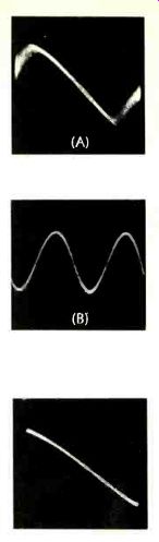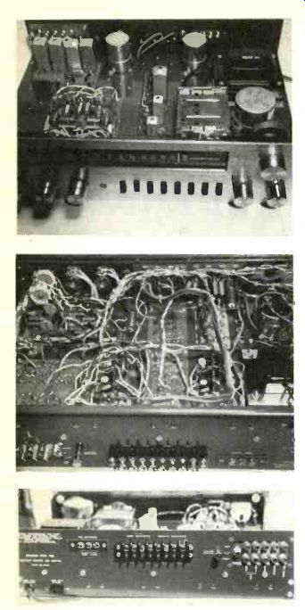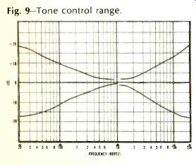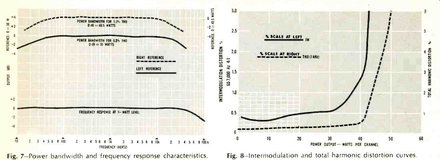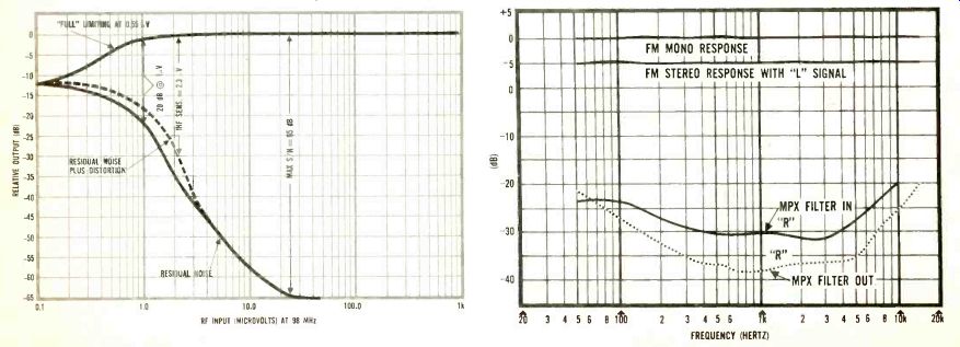 The bridge rectifier power supplymakes available voltages ranging from +56 volts (for the power output transistors) all the way down to +9 and -9 volts. The latter two voltages are zener regulated and are used to power the r.f. section and the i.f. strip. Five-percent tolerance resistors and capacitors are used in abundance throughout this receiver, particularly in the low level preamplifier stages. This accounts for the unit's extrefnely accurate equalization and gain between channels. Very low hum levels can be attributed to relatively high values of capacitance used in primary filtering circuits (5000 uF. For 56-volt filtering) and coupling to the loudspeakers (4000 uF) . Performance The Studio Pro receiver exceeded its published specifications, often by a wide margin, in nearly every measurement made. Figs. 3 through 6 tell much about the FM performance. While a measured IHF FM sensitivity of 2.3 uV (exactly equal to the manufacturer's rating) tells part of the story, one should recognize that this rating encompasses both residual noise and distortion. As the Studio Pro's r.f. input signal was increased to 5 microvolts or so, however, the FM detector's linear response proved to be so good (Fig. 3A) and so broad (over 400 kHz even at this low signal input) that the recovered audio tone (Fig. 3B), representing full modulation at 400 Hz, exhibited just a touch of residual noise, but virtually no distortion. This is far better (from a listening point of view), than so many cases in which the residual "3%" (or-30 dB) component of the IHF sensitivity measurement consists primarily of distortion. As for "limiting," the receiver may be said to limit on incoming noise, since "full" (3 dB) limiting is achieved at an incredibly low input of only 0.55 uV! The muting circuit does an effective job on muting interstation noise. At the same time, signal inputs as low as 3 microvolts overcome the muting feature. It should be noted (From Fig. 5) that ordinary 20 dB quieting (without regard to the newer IHF specification) is achieved with an input of 1.0 microvolt (bettering the 1.6 microvolts claimed by University Sound). Total harmonic distortion for 75 kHz modulation is less than 0.5%, at all signal levels exceeding 25 microvolts, thanks in part to a wide-band detector response (shown in Fig. 4) which is almost perfectly linear for about 800 kHz. As for FM stereo separation, the unit tested missed the 40 dB spec by only 2 dB, but this is a moot point. More important than this reading, which in itself is excellent, is the fact that at least 25 dB of separation is maintained at all frequencies from 20 to 10,000 Hz (see curve of Fig. 6). Mono and stereo FM frequency response held to the 0.5 dB claimed by the manufacturer. In high quality FM stereo units, circuit design to reduce reception of SCA broadcasts (background music via multiplex, on a station simultaneously engaged in stereo transmission) often leads to some degradation of separation capability, particularly at high frequencies. University Sound has wisely elected to reject SCA minimally, under normal conditions, since only a few stations engage in this additional, private subscriber service. When a station broadcasting SCA is encountered, however, some interference is noted. But this can then be attenuated by activating the MPX filter mentioned earlier. In this way, optimum separation is maintained for all stations broadcasting only stereo, while minimal reduction in separation is introduced by the filter to reject SCA interference properly for the few stations engaged in this form of broadcasting. Additional FM specifications that were confirmed by measurement include a capture ratio of 1 dB and an alternate channel selectivity of 58 dB (the manufacturer boasts only 55 db) and FM cross-modulation rejection of better than 95 dB. Curves and measurements tell much about equipment, but for the evergrowing number of FM-DX'ers, suffice to say that the Studio Pro 120 pulled in 38 perfectly listenable FM stations in the New York City area (of which 13 were broadcasting in FM stereo) on a simple, home-made dipole antenna tossed casually behind the receiver. This means that many of the stations were separated by only one channel width (200 kHz); yet there was no difficulty in isolating one station from the next, nor was there the slightest audible evidence of co-channel interference. Amplifier measurements Though University Sound rates the continuous power per channel at 30 watts and 0.3% distortion, instrument readings obtained were 30 watts at 0.2% THD into an 8-ohm load. Not surprising, the stereo amplifier section is capable of a good deal more power out, so in plotting power bandwidth (Fig. 7), two curves are given. The lower curve is taken for 0.3% THD and corresponds almost precisely with the specifications listed earlier. Since less-conservative manufacturers usually specify a 1.0% THD figure, a second bandwidth plot was made based on this higher distortion figure. The results indicate a power bandwidth of 15 to 35,000 Hz, at 40.5 watts per channel. Curves of IM distortion and THD (for 1 kHz) are shown in Fig. 8. Tone control range is shown in Fig. 9. Mechanical centering of the tone controls corresponded accurately with uniform or flat electrical response. Loudness compensation is so arranged that, with the loudness circuit in, a boost of approximately 10 dB at 100 Hz is provided at 1/4 rotation, whereas at 1/2 rotation of the gain control, compensation is about 6 dB at 100 Hz. Under actual listening conditions, the loudness action here seemed a bit exaggerated. But many listeners do like enhanced bass and, in the final analysis, the loudness control can be turned off and the individual bass controls used for any degree of compensation. Using a medium-output phono cartridge to check phonograph performance, levels corresponded nicely with the internal FM audio output, obviating the need to juggle the gain control every time the selector is swi