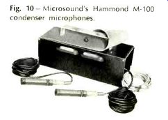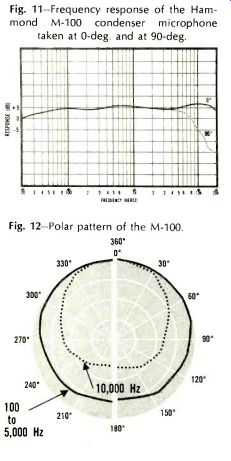 Here is a condenser microphone at a price which makes it possible for the average individual to own one, not just the professionals. Or even to own two, since the price of a pair of Hammond M-100's, together with the power supply, is $229.50. Single, the microphone costs $149.50 with the power supply. Considering the relatively low price of these microphones, one might be doubtful of the quality. But an inspection should relieve that doubt. The microphones are small and neat, and attach to their Cannon connectors with hardly any noticeable difference in diameter. (Now if the plugs were only black....) The grille is a part of a machined aluminum housing, with the slots covered by a mesh to keep dust out of the diaphragm area. The power supply is built into the carrying case, and all cables can be accommodated in spaces at the ends of the case. These cables consist of two 15-ft. microphone cables, two 9-ft. shielded audio output cables, and the a.c. line cord, also 9 ft. long. The case is a single piece of aluminum bent in the form of a U, with the housing for the power supply in another U which occupies the center portion of the case. Two aluminum tubes are attached to the second U to hold the microphone bodies, thus serving to protect them, store them, or to provide a carrying compartment for them when going out in the "field" for a recording session. We ran our usual comparison tests with a calibrated condenser mike of another make to determine the frequency response, and found it to be very close to the specifications-as close as such measurements can usually produce in other than an anechoic chamber. The comparative curves are shown in Figs. 1 and 2, the latter being the polar characteristic. Aside from the human voice, crackling cellophane, jingling keys, and such other "live" sounds, we were not able to do much live recording with the M-100's. However, using reproduced music over a good system, we found that they would take a 95 dB SPL without overloading, and upon playing back, the reproduction was scarcely indistinguishable from the source. Putting the microphones outdoors simply brought the outside sounds right into the house, with birds and automobiles flying by right in the living room. Children playing on the street might as well have been inside as far as the sound was concerned. The power supply is neatly made, employing a sturdy transformer, three transistors, and a VR tube on a generously sized etched circuit panel. Our major criticism was the arrangement of the power switch. In the usual British fashion it pushed down to turn on. American users might well want to rotate it 180 deg. so it turned the power on when it was pushed up (we did). Several interesting ideas were employed in making the power supply/ carrying case, all of which serve to reduce costs, and the savings are passed along to the user. The frame of the case, as described previously, consists of the 4" x 4" x 12" U-shaped structure, with the power supply occupying the center 7-in. compartment. A sturdy strip of aluminum is attached to the power supply housing and serves as a handle and as protection for the pilot light which is located underneath it. A 20-in. strip of rubberized cloth material is held in place by the pilot light mounting and extends over the top of the case and down the open ends of the U-shaped structure. Metal ends are pressed onto the rubber material and catch under notches on the ends of the housing, eliminating a built-up case, fasteners, hinges, and the like, and yet performing like a proper case for the entire assembly.