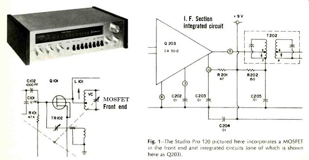 University Sound "Studio Pro 120" FM Stereo Receiver MANUFACTURER'S SPECIFICATIONS Total Music Power (IHF): 120 watts at 4 ohms, at 0.8% THD. Continuous Power (RMS): 30 watts per channel at 8 ohms, 0.3°/o THD. Power Bandwidth: 10 Hz to 40 kHz, at 0.3°/o THD. IM Distortion: Less than 0.5°/o to rated output. Frequency Response, 1 Watt: 10 Hz to 100 kHz +0, -3 dB. Noise and Hum: Tape monitor, -83 dB; AUX,-80 dB; Phono, -60 dB; Tape Head, -63 dB; all below full output. Input Sensitivities: Tape Monitor and AUX, 0.4 volts; Tape Head, 1 mV; Phono, 4 mV. Damping Factor: 50:1. FM Sensitivity (IHF): 2.3 microvolts. IF Image Rejection 90 dB. Alt. Channel Selectivity: 55 dB. FM Frequency Response: 20 Hz to 20,000 Hz ± 0.5 dB. FM Stereo Separation: 40 dB at 1 kHz. FM Distortion: Less than 0.5°/o for 75 kHz deviation. Dimensions: 16 3/8 in. x 4 1/2-in. x 12-in. deep. Weight: 17 lbs. University Sound has been quietly engaged in manufacturing of electronic equipment for military purposes for some years now, but has restricted its consumer activities to transducers until now! With the introduction of its "Studio Pro 120" FM stereo solid-state receiver, the company embarks on a new road. It has done so with a receiver which, through its excellent performance, functional design, company wherewith all, and price ($379.50), is destined to be a formidable competitor to other receivers. The Studio Pro 120 does not feature any design breakthroughs in the sense of a radically new device or circuit. Rather, it incorporates good design philosophy that takes advantage of the state-of-the-art devices and circuits available to engineers. The unit includes 31 silicon transistors (including a front-end MOSFET), 21 diodes, and two of the latest integrated circuits, for example. And starting from scratch, the company was not locked into designs that would be costly to change in one fell swoop. The result is a sensibly arranged front and rear panel layout, a refreshingly handsome appearance, and some extra comforts that will be noted later. Operated by gold anodized, solid aluminum knobs, primary control functions include the usual selector switch, dual bass and dual treble controls (clutch operated for individual settings of left and right tonal response), balance control, gain control and tuning control. The smooth mechanical action of all of these, including the flywheel action of the station selector, rivals that found in some professional equipment. The front itself is a tasteful, gold anodized, brushed aluminum panel, complemented by a matching anodized dust cover (supplied at no additional cost). As shown in Fig. 1, two walnut side panels (optional at extra cost) may be affixed to "dress up" the unit for open-shelf installation. Secondary controls are actuated by eight "rocker" switches. These include a speaker-remote switch, MPX, high frequency and low frequency filters, tape monitor switch, loudness contour switch, stereo mono switch, and FM mute switch. All of these switches are arranged so that, in their often-used position, they are similarly depressed. A stereo headphone jack completes the front panel layout.