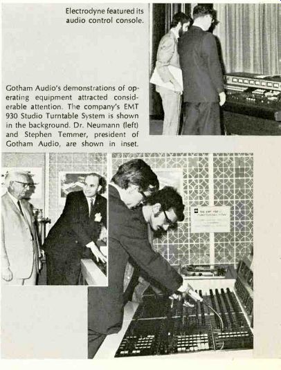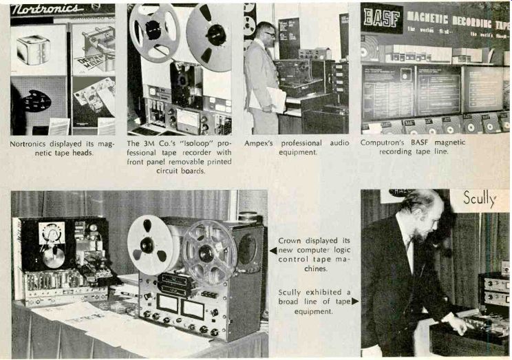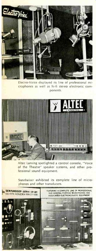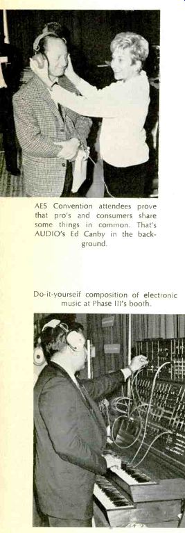Among other interesting developments shown at the AES show were: Altec Lansing's solid-state condenser microphone system; Ampex' 24-track, 1-in. tape recorder; Bozak's line of commercial amplifiers; Capps' models of styli, 50X normal size; Computron's (BASF) impressive display of different magnetic tape formulations; Crown's new computer logic control tape transport; Gauss' 120 ips (who says tape speed is getting slower?) tape machine for duplicating purposes; Electro-Voice's long line of microphones, including "shotgun" types; Fairchild Recording's thin-line series of speech input equipment; Lang's custom studio equipment; Nagra's miniature, portable, battery-operated tape recorders; Norelco's line of AKG microphones; Nortronic's broad line of magnetic tape recorder heads; Phase III's electronic music equipment, with Robert Moog showing 'em how; Scully's new professional tape recorders; Sennheiser's wall of mikes of various types; 3M's "Isoloop" tape machine, as well as its magnetic recording tape and "tape-on" speaker wiring system; Universal Audio debuted its battery-operated, three frequency test generator; Vega exhibited its wireless microphone system. Shown here are some exhibit scenes captured at the show.