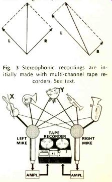 Next, the sound output of the speakers should be balanced. This can be accomplished by standing several feet in front of the speakers, midway between them (location X, Fig. 4 is recommended) and, listening to a mono record, manipulate the balance control until the sound appears to come from a point directly in front of you. Next, try the speakers in different locations. They should be spaced between six and ten feet apart, depending upon the size of, the room and the distance from the listening area. Placing the speakers in the corners of a long narrow room may be found to stimulate room resonances, producing a booming sound. Placing them away from the corners of a long wall may result in an undesirable loss of bass. The location of the speakers which is judged to produce the most natural sound is the one to use, ' assuming that it does not create havoc with room decor. After the speakers have been located, the tone controls may be touched up to compensate for less than-ideal room acoustics. ![]() Fig. 2--A stereo cartridge's stylus cannot be in two places at the same moment, of course. The stylus makes one resultant motion. The drawing at left shows the sum of equal left and right signals as a vertical motion line; at right, a strong left signal added to a weak right signal produces a diagonal stylus motion. Fig. 3--Stereophonic recordings are initially made with multi-channel tape recorders. See text. (Audio magazine, Jan. 1968) Also see: Stereo Discs: 10 Years Old Stereo Disc Cutting, by Albert B. Grundy = = = = |