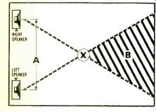 Some basic stereo system setup pointers are recapitulated here for new readers. Figure 3 shows the principle of stereo reproduction. In this mode of operation the sounds are picked up by a microphone on the left and a microphone on the right of the musicians. More than two microphones are often used to feature certain instruments, but the principle is the same. The violin on the left, marked X, is nearest to the left microphone. The left microphone will therefore pick up more sound energy from the violin than the right microphone. In the case of the drum, marked Y, equal sound intensity will be picked up by both the left and right microphones as it is located midway between them. The sounds picked up by the left and right microphones are passed through separate amplifiers and recorded on magnetic tape. At a subsequent time the tape data is transferred to a master disc. By ingenious use of a combination of lateral and vertical motions, the master disc cutting stylus engraves both information channels in the side walls of a single V-shaped groove. Each groove wall is engraved at a 45 degree angle with respect to the disc surface. When the finished records are played, the stereo cartridge stylus will respond by producing two independent outputs which are identical to the sounds heard by the left and right microphones during the recording session. These sounds are amplified (by separate amplifiers) and fed to left and right speaker systems, the combined output of which produces the stereo effect. Violin X will be heard on the left and drum Y will be heard midway between the two speakers. Other instruments will assume their relative positions due to the difference in sound intensities picked up by the left and right microphones during the recording session. The result will be a sound pattern emitted by speakers which is identical to the sound field picked up by the microphones. The mere fact that a stereo record is being played on stereo equipment does not necessarily mean that one is getting the full impact of its potentialities. (Nor does it imply that it is high fidelity sound.) Certain rules must be followed to obtain the best reproduction, as follows: Speakers are potentially one of the most important units in a high fidelity stereo sound system. They must be installed properly if best results are to be obtained. Before trying speakers in various positions in the room to determine the location where they sound best, they should be phased so that their cones will move in and out in unison. A good check on proper phase is to position the speakers a few feet apart, facing toward you, and play a passage from a mono organ record containing low pedal notes. Controls should be set to "MONO" or "A+B." Note the intensity of the low notes and then reverse the two connecting wires to one of the speakers and play the same passage a second time. The wiring arrangement which produces the loudest low note is the in-phase condition. Once established, these connections should remain the same for the tests to follow and thereafter. The wires should be marked to insure that they can be reconnected to the proper terminals of the amplifiers and speakers at any future time.