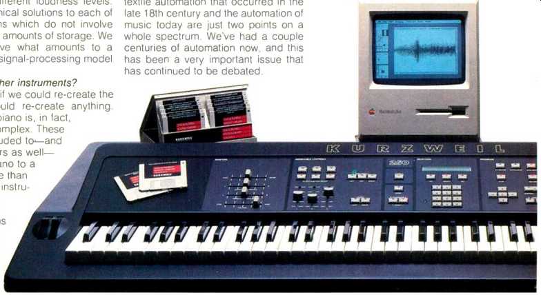 You were involved in pioneering work in the field of artificial intelligence when Stevie Wonder got you back into music. Tell us how that came about. I had known Steve for a number of , years, since he was a fan of the Kurzweil reading machine and one of its earliest users. We had a number of occasions to talk about technology in general and, in particular, technology applied to the creation of musical sounds. He's quite knowledgeable about electronics, computers, synthesizers, and other elements of music technology, and at one point he was lamenting the fact that there were two worlds of musical instruments without any viable bridge between them. There was the world of acoustic instruments, which at that time-and this is still the case today-provided the musical sounds of choice, sounds which are complex, rich, and musically relevant. But it did not provide very effective means for controlling those sounds. Most instruments, such as the saxophone or violin, cannot even be played polyphonically. You can only play one note at a time; there are limited means for sound modification. You can do vibrato on a violin and not much else. In fact, most musicians can't even play most instruments, since most don't have a wide variety of playing techniques. You've contrasted this with the world of electronic musical instruments. The electronic world was the total converse of this. All the things you could not do in the acoustic world, you could do in the electronic world. All sounds could be played polyphonically, and you could layer any sound with any other sound. You could apply virtually any sound modification technique to any sound source. However, at that time, the sounds that you could apply all these techniques to were very thin. These sounds had found their place in popular and classical music, but they were of limited complexity and could not capture the complexity and musical depth of acoustic sounds. So basically, Steve's challenge was, "Wouldn't it be neat if we could apply all of these control and sound modification techniques that the electronic world provides to acoustic sounds." You could create a whole new class of sounds which would have the complexity of acoustic sounds, because they would start acoustically but would be so modified that they would not be recognizable as the original instruments. There would be a whole new class of sounds that would have equal relevance to music but would be sounds no acoustic instrument could produce. This occurred around 1982, when you were headed in a different direction. What impelled you to actually go to work on a synthesizer that could do this? Shortly before my father died, he began to get excited about the application of computers to music, which at that time was not a very popular concept. He felt that someday I would combine these two interests. And I've always had in the back of my mind that there was some linkage between computers and music. I became excited about what Steve was talking about and understood the potential it would have. I began to explore the concept and began to believe that it was feasible. With that realization, I examined the market potential, which seemed explosive. The whole marketplace seemed poised for an historic transformation from what, at that time, was almost entirely acoustic technology to digital electronic technology. And indeed that is now taking place. What advantages do digital electronics have over analog in the creation of musical sounds? You have very precise control over sounds-you can create sounds of arbitrary complexity. You can very precisely apply several dozen sound modification techniques, and you can use techniques that are theoretically well grounded. Analog electronics is a bit of a black art. It's not always predictable what the techniques will do, and there's no way of taking a sound, analyzing it, and then re-synthesizing it-it's a bit of hit and miss With digital techniques, we can really understand how the sounds are constructed, analyze them in the frequency domain (which is the way in which our brains understand them), make any modifications we wish, and reconstruct them. In the digital domain, you can emulate all of the techniques that analog synthesis provides, but you also can do a lot more, and you can deal with much more complex phenomena. Using analog techniques, it's really not possible to accurately re-create, for example, a grand piano. But it is possible in the digital domain.
