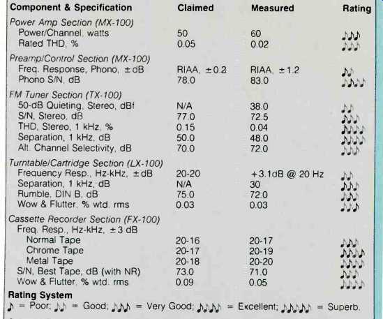 The initials in this system's name stand for "Synchro Performance Audio Network," a unique inter connection method which lets the V 1000G's components act together like a single unit. However, you must use only the components offered, with the possible exception of the turntable and the definite exception of the optional speakers. (In my tests, I did not use Aiwa's speakers and recommend using something larger and of higher quality for best sound.) Interconnection is extremely simple: With the glass rack accompanying the "G" system or the wood rack of the less expensive V-1000X, one just places the components in position and plugs them into prewired connectors in the rack's back plate. Additional cables are supplied for those who do not wish to use a rack. Even without the rack, however, the lengths of the cables supplied are such that you must stack the components as shown in the owner's manual, unless you buy longer cables with the appropriate DIN plugs (not all identical). Ordinarily, however, the Model LX-100, linear-tracking turntable goes on top; the Model MX-100 amplifier (which also acts as the system's control center) goes just below it. Below that will be the Model TX-100 frequency-synthesized tuner, resting atop the Model FX-100 Dolby B/C-equipped cassette deck. (All components have "footprints" slightly larger than a re cord jacket's, just under 13 inches on each side.) Even the various a.c. power cords must be hooked up a specific way in order for the interactive features of the system to work properly. Once all the connections are made, the only "spare" inputs available are a pair of "AUX" terminals. There is no provision for tape monitoring or the addition of any sort of signal processing equipment (dbx decoder, equalizer, etc.). Neither is there any circuit interruption point between the preamp-control section of the integrated amplifier and the power amplifier section. There are, of course, operating ad vantages to this arrangement. The amplifier's program source selectors for "Phono," "AUX," and "Tuner" are paralleled on the cassette deck, so you can select a source for taping without reaching back up to the amp. If you go into "Record" mode when the system is set for "Phono," the tape deck goes into "Record Pause" mode, automatically starting the tape when the tonearm comes to rest on the first groove of the spinning record. These neat tricks, and more, are all made possible by those extra wires inside the supplied interconnecting cables. The MX-100 integrated amplifier has an accurate LED power-output indicator referenced to 8-ohm loads. Next to it is a corresponding volume-level indicator which is necessary because volume levels are altered by means of up/ down keypads rather than a rotary level control. Several other indicators in form the user about amplifier status, including a "Tone" indicator, since the bass and treble controls of this unit can be bypassed if desired. A DSL ("Dynamic Super Loudness") switch boosts bass below 100 Hz for rooms or speakers requiring it, but boost diminishes as the level control is advanced for speaker protection. The amplifier is equipped with a microphone input jack and an associated volume control, for mixing live mike sounds with other pro grain sources when listening or re cording. There is also a jack for a re mote control, as yet unavailable. The MX-100 delivered a full 60 watts per channel for its rated distortion, even at the audio frequency extremes of 20 Hz and 20 kHz. Aside from its excellent frequency synthesized tuning circuitry, the TX 100 tuner features a real-time digital clock display and timer which can be programmed to turn on the tuner and thereby the entire system. It is the tuner's line cord that is connected to a wall socket, with all other line cords connected to its convenience outlets or to convenience outlets on the amplifier. Power will switch off automatically, about 64 minutes after a timed start, or after a front-panel sleep-timer button is pressed. As for its operation as a tuner, sensitivity was just average (an out door antenna is recommended), but distortion was surprisingly low and stereo FM separation was excellent. There are memory presets for six FM and six AM stations. ============ ONE-BRAND SYSTEM RATINGS ![]() General Comments Power Amplifier: Sound quality very good, power output conservatively rated. Phono equalization slightly off in bass region. Good switching arrangement between components. Turntable & Cartridge: Properly matched to each other, but cartridge response further accentuates extra bass boost. If replacing, choose a high-output moving-magnet cartridge. Tuner: Well designed and easy to use, with special features not normally found on separate tuner components. Cassette Deck' Exhibited excellent frequency response and good Dolby C tracking. Excellent interface with the amplifier and with the rest of the system. Overall Comment: While this system makes good use of the fact that it is sold as a complete music system, it also sacrifices some features that are found in separate components, such as a tape monitor loop. On the whole, however, Aiwa manages to cram a great deal of audio performance into a very small space at a very attractive price. A fine system for small apartments, second homes, and the like. Overall Rating: ============ Perhaps the most outstanding component of this system is the turntable, Model LX-100. Its tangential-tracking tonearm is equipped with an Ortofon VMS-type cartridge of extremely low mass. Thanks to the front-loading system (records are slipped in from the front, after a "Load" button causes a drawer-like ejection of the entire turntable tray mechanism), no clearance for lifting the dust cover is needed. Such operations as lowering or raising the tonearm are controlled from the front panel. Record size is automatically detected by the tonearm. My only criticism of the system had to do with a slight rise in the cartridge's bass response which, combin