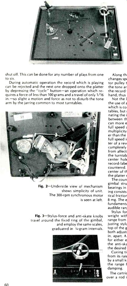 ![]() Akai Model AA-1050 AM/FM Stereo Receiver MANUFACTURER'S SPECIFICATIONS FM Tuner Section IHF Sensitivity: 1.8µV. S/N Ratio: Better than 75 dB, mono. Selectivity: Better than 100 dB. Capture Ratio: 1.0 dB. THD: Mono, less than 0.15%; stereo, less than 0.3°%o. Image Rejection: 95 dB. I.F. Rejection: 100 dB. Spurious Rejection: 90 dB. Stereo Separation: 1 kHz, better than 40 dB. Muting Threshold: Variable, from 3µV to 300 µV. AM Tuner Section IHF Sensitivity: 180 µV/M (internal antenna); 8µV (external antenna). Selectivity: 30 dB. Image Rejection: 55 dB. I.F. Rejection: 45 dB. S/N Ratio: Better than 50 dB. THD: Less than 0.6V0. Amplifier/Preamplifier Section Power Output: 50 watts per channel min. rms, at 8 ohms, from 20 Hz to 20 kHz. Rated THD: 0.15'ío. S/N Ratio, IHF: Phono, 80 dB; AUX, 90 dB. Input Sensitivity: Phono 1 & 2, 3 mV; AUX, Tape, 150 mV. Phono Equalization: RIAA ±1.0 dB. Tone Control Range: Bass, ±10 dB at 100 Hz; treble, 1-10 dB at 10 kHz. Filters: High cut,-10 dB at 10 kHz; low cut,-8 dB at 50 Hz. General Specifications Dimensions: 18.9 in. W x 6.1.in. H x 15.4 in. D. Weight: 28.6 lbs. Suggested Retail Price: $450.00. Akai Electric Company, Ltd. of Japan, whose products are sold by Akai America Ltd. in the U.S., is perhaps best known in this country for its fine line of stereo tape decks, both open reel and cassette. The fact is that the company also produces an extensive line of purely electronic products, including both stereophonic and quadraphonic receivers. Interestingly, at a recent industry trade show, Akai was one of the few companies (if not the only one) to introduce two new four-channel receivers at a time when other companies were backing away from this format. The Model AA-1050, tested for this report, is the company's top stereo receiver. Its styling follows the new format adopted by so many better known brands, in that the old, traditional blackout dial treatment has been replaced by a bright gold dial area, of narrow but extra long dimensions, which blends nicely with a brushed aluminum front panel. Numerals, screened in a contrasting dark color, are highly visible even when the unit is not powered and the only other items within the dial area are the familiar stereo indicator light and an AFC light just below it. FM calibration is linear, with markings evenly spaced at every half of a Megahertz. A good sized tuning knob, coupled to an effective flywheel is located to the right of the dial area. Separate cutouts in the panel below the left section of the dial disclose signal strength and center-of-channel tuning meters which are also well illuminated when power is applied. Adjacent to the meters are the low and high cut filter pushbuttons and an audio muting button which reduces overall listening level by a fixed 20 dB when depressed. Next come four tiny indicator lights which denote program source selected, the FM muting switch and an associated small rotary control which varies muting threshold. Along the lower edge of the panel are a Power on/off switch, headphone jack, speaker selector switch (with every possible combination of two out of three or one out of three pairs of speakers which may be connected to the receiver, plus an "off" position for headphone-only listening), Bass, Treble, Balance and Volume rotary controls, a Loudness switch, Mono/Stereo Mode switch, a Tape Monitor switch (with positions for dubbing as well as monitoring of either of two tape decks which may be connected to the unit) and a program selector switch. The selector switch includes positions for mono as well as automatic FM listening, and in the latter position the stereo multiplex circuits automatically are switched in which a stereo FM transmission is received. The rear panel of the Model AA-1050, pictured in Fig. 1, has separate terminals for 300-ohm FM and external AM antennas, as well as a coaxial connector and clamp for 75-ohm transmission lines. Dual phono input pairs, AUX inputs, and the two sets of Tape out and in jacks are neatly clustered together below the pivotable AM ferrite bar antenna, while the three sets of speaker connection terminals (of the spring-loaded type which require insertion of the stripped wire ends of speaker cables) are located at the opposite end of the rear panel, each set color coded for proper phasing of speaker wires. One switched and two unswitched a.c. convenience outlets are also located on the rear panel for connection of other components. A DIN multiple-pin connector parallels the Tape-1 input/output jacks for those tape decks that are equipped with that type of plug. Akai does not supply a schematic diagram with the Model AA-1050, so it was not possible for us to study the circuitry in detail. We did, however, remove the vinyl-clad wood cabinet supplied with the unit and examined internal construction and layout (see Fig. 2). A separate, sealed front-end, employing a four-section FM tuning capacitor and a three gang AM tuning capacitor, is used, and it is mounted directly above the tuner board, well towards the rear of the chassis and close to the antenna input terminals. Both the tape and selector switches are coupled via long shafts from their desirable rear-of-chassis locations to eliminate needlessly long shielded wire harnesses. Power supply parts, including a good-sized power transformer, are centrally located and well ventilated, as are the power amplifier p.c. module and vertically mounted output transistors and heat sink assembly at the opposite end of the chassis from the tuner board. Smaller, secondary p.c. modules up front take care of low-level tone control and voltage amplification circuits, and there is a minimum of inter-module wiring, all neatly dressed and properly tied down to prevent variations in performance from unit to unit. Rather surprisingly, the heat sink assembly is not black colored (as are so many others, for better heat transference), but this does not seem to bother the receiver thermally, a
