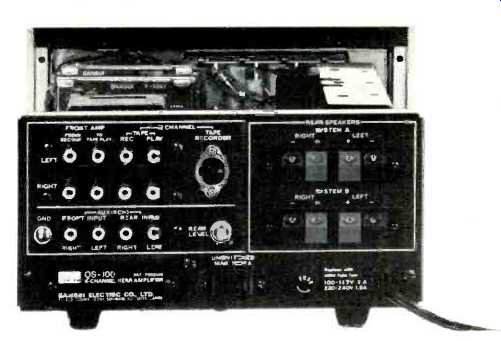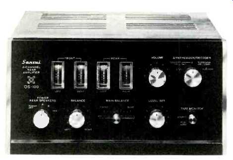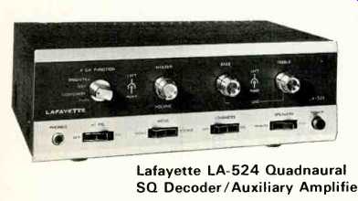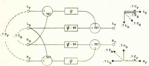 Logic Directed Decoder Our ultimate goal, however, was to provide matrix system performance which would be indistinguishable from that obtained with the discrete system. It is possible to achieve this goal by virtue of three remarkable psychoacoustics phenomena we have all experienced: … that in a normal living room there is …. that a source of a continuous steady- …with ease. 2. The finding that a varying source of sound, such as speech and music can be readily localized. 3. The precedence or Haas effect,' which teaches us that when two or more similar sources are present, the ear credits the one heard first with being the source of sound. Thus, if we can provide an electronic logic to instantaneously enhance the relative strengths of the dominant sources produced by the matrix, and similarly attenuate weaker sounds, we should be able to give the listener the complete experience of four discrete channels. The control function performed by the SQ logic is shown diagrammatically in Fig. 10. While the matrix portion is identical to that in Fig. 9, the output amplifiers have voltage controlled gain characteristics responding to pre-ordained amplitude and phase positions of the transferred signals, as sensed by the logic. For example, the existence of one of the front channel signals results in the generation of two signals transferred to the back channels which have identical amplitudes and which are in a precise quadrature orientation. The comparator senses this relationship and causes the front channel gains instantly to be enhanced, while the back channels are rapidly attenuated. Thus, the listener hears only the appropriate front channel signal regardless of his orientation in the room. By contrast, if one of the back channel signals is momentarily predominant, the reverse effect takes place; the front channels are attenuated and the back channels enhanced. The resulting quadraphonic field provides a total awareness of the four independent channels of the master tape. With single channel signals present, the logic maintains the appropriate channel constantly "open," and greatly attenuates the transferred signals relative to the main signal; thus, transmitting substantially discrete channels of information. Recording Procedures Every competent artist and producer learns how to obtain best results from a particular medium, and SQ is not an exception: Caution should be exercised to maintain phase integrity of common "panned" signals. Panning across the diagonals or splitting a signal four ways between the channels requires a special encoder connection (on newer encoders available with a switch). Ordinarily, signals panned to center-back will be heard only in the quadraphonic and stereophonic modes, and if they are to be present in a monophonic display special circuit arrangements are needed-so it is best to avoid the center-back soloists. Some producers, who strive for special effects, find it desirable to "mix" the SQ program using an encoder-decoder combination in the monitor circuit until they develop a "feel" of the system. However, with the vast majority of instrumental and orchestral performances, the original quadraphonic master tape is simply converted into the SQ record by connecting it to the input channels of the encoder and conveying the encoder output to the conventional disc recording chain. Decoding either with the SQ matrix or matrix/logic decoder produces a realistic and faithful reproduction of the quadraphonic master tape. Conclusion As we conclude our review of quadraphonic disc developments, I would like to leave you one last thought: There is much more to quadraphonic high fidelity than may be expressed by any single performance parameter: Frequency response, output level, signal-to-noise ratio, playing time, precision of directional localization, transmission through AM radio systems, equipment cost and complexity, and compatibility with 100-million record players and FM-multiplex radios-all these must be considered. To do less would be an act of irresponsible engineering. Much has been made of "discreteness" of quadraphonic carrier-type discs, and even our own initial developments used carriers. We found that while a carrier disc is able to approach discrete performance, it does so at the expense of other performance parameters, and only through a precarious balance of several complex processes, involving not only matrixing, but also compression, carrier modulation, ultrasonic disc recording and reproduction, demodulation, expansion, and reverse matrixing-often resulting in a troublesome and unstable action. On the other hand, the SQ matrix provides us with a simple and competent quadraphonic system. The SQ encoder reorders the four corner signals from the original master tape into two pairs of orthogonal modulations and places them on the disc retaining all the qualities of the standard recording processes. Playback is done with standard stereophonic equipment followed by matrix decoding into four channels carrying predominantly the four corner signals, and within the front and back channel pairs retaining complete channel discreteness of the original master tape. Full 360° panning fidelity and compatibility with all phonographs and broadcast processes is retained. An electronic logic is provided to augment the front-back channel separation of the matrix, resulting in a performance which is difficult to distinguish from the original discrete four-channel master tape. Since there appears to be no limit to human imagination and perseverance, we expect that experiments with carrier discs will continue--figuratively speaking--hacking in that direction against all odds. We observe that the choice of design parameters of the presently offered carrier discs does not appear to provide an optimum system configuration. Some optimization; indeed, appears to be feasible, and there even have been suggestions made about using the SQ matrix for the basebands of the carrier
