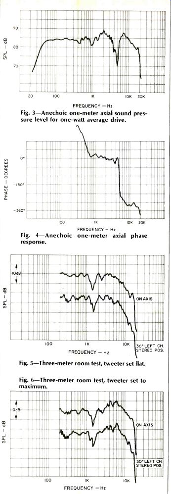 Fig. 4-Anechoic response, one-meter axial phase Fig. 5-Three-meter room test, tweeter set flat. Fig. 6-Three-meter room test, tweeter set to maximum. Speaker connection is made to well-marked terminals placed in a recessed cavity on the rear of the enclosure. Also mounted in this cavity is a system fuse holder for overload protection and a tweeter balance L-pad. A red dot is placed on the tweeter control place to indicate the position for flattest response, each speaker being individually calibrated. Plastic angle brackets hold the upper grille in place and serve as edge trim on the upper front and sides. These brackets are cut off flat, leaving edges at the corners. In typical Laurel and Hardy fashion, I cut myself on one of the brackets when I grasped the enclosure to move it. My lack of grace notwithstanding, I hope that Duntech will smooth or remove these edges on subsequent units. Duntech supplies a very thorough and readable instruction manual with each speaker. This covers both technical details and helpful suggestions on room placement for best sound. The DL-15 loudspeaker system carries a five-year, transferrable, full warranty against manufacturing defects. Technical Measurements The measured magnitude of loudspeaker impedance is shown in Fig. 1, and the corresponding complex plot is given in Fig. 2. The rear-mounted tweeter control was left in the factory preset flat position for both of these measurements. Impedance variations are quite small and remain predominately resistive for frequencies above the characteristic bass resonance peak. This speaker should present no load problems to any quality power amplifier. The one-meter axial anechoic frequency response at one watt average drive is shown in Fig. 3 for the amplitude of the sound pressure and in Fig. 4 for the phase. The tweeter control was set to the indicated flat position for these measurements. Bass response extends down to around 45 Hz, then rolls off smoothly. The unusual dip in response at 5 kHz, and its attendant phase change, warrants some discussion, particularly in view of the fact that Duntech measures the frequency response of each unit prior to shipment. Duntech's claim for their low frequency response is based on using a two-boundary measuring condition (wall and floor), which they believe more nearly approximates normal home listening conditions. Audio measures the response directly on the geometric center line of the speakers, with no "preferred" positions, and everybody gets the same treatment. It just happens that this is about the worst position for the Duntech. Moving the microphone a bit up to be aligned with the tweeter or down to be in front of the woofer substantially smooths the measured response, but the response shown in Figs. 3 and 4 is what the center-line measurement yields. The acoustic transition between midrange and tweeter accounts for the dip in response at 4 to 5 kHz and nearly 360 degree shift in phase. The phase measurement was made with a time delay offset corresponding to the air path delay from midrange driver to microphone. The phase shift below 600 Hz is due to the woofer, which has an acoustic position behind the midrange driver and hence a longer time delay. With the exception of the phase changes around 600 Hz and 5 kHz, the Duntech DL-15 is principally minimum phase. Figure 5 shows the measured three-meter room response. The DL-15 was placed on a carpeted floor and against a wall, as recommended by Duntech. A microphone position three meters from the front of the enclosure and one meter above the floor is used to simulate a normal listening position. The tweeter control was set to its indicated flat position. Two measurements are shown, one directly in front of the enclosure and the other angled 30 degrees for the Duntech in a normal left-channel stereo position; the plots are displaced 10 dB for clarity. The response is quite smooth throughout the frequency range but begins to drop above 7 kHz, though it extends smoothly to 18 kHz. (Editor's note: This high end drop, says Duntech, with distance was intentional. It is based on their contention that the same drop is evident with most musical instruments and the human voice due to a reduction in angular dispersion at frequencies higher than about 4 or 5 kHz.) In order to check the top end drop, the measurement was rerun with the tweeter control in its maximum position, with the results shown in Fig. 6. It appears that the tweeter control should be left in its flat position as a 6-kHz peak occurs when the control is placed in its maximum position. If you want to pull the top end up for a more uniform direct source sound, an equalizer should be used which pre emphasizes the frequencies above 5 kHz. An octave band equalizer may do it, but a normal pre-amplifier tone control will not and should be left in the flat position. The polar energy response is shown in Fig. 7 for horizontal dispersion and in Fig. 8 for vertical dispersion. This is a measurement of the total sound energy density for all frequencies equally weighted from 20 Hz to 20 kHz. The three curves are for the rear-mounted tweeter control in its minimum, flat, and maximum position. ![]() Fig. 7-Horizontal polar energy. Fig. 8-Vertical polar energy. Fig. 9-Harmonic distortion for musical tones E1 (41.2 Hz), A2 (110 Hz), and A4 (440 Hz). Fig. 10-Harmonic distortion for the tones of 1 kHz and 2.4 kHz. The horizontal polar pattern is quite symmetric with almost no left or right dominance of sound. The vertical polar pattern, particularly in the flat position, shows a mild upward dominance of launch angle for sound with a minor notch on axis. This verifies the axial frequency response measurement difficulty we encountered in the anechoic test. The room tests, shown in Figs. 5 and 6, have a microphone position above the enclosure's geometric axis and thus are made in the major vertical lobe of Fig. 8. This is why the 5-kHz notch did not show for an average room listening p