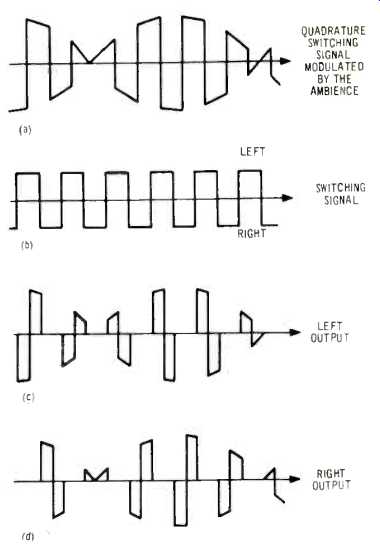 by MICHAEL GERZON ![]() THERE SEEMS TO BE no doubt that in the long run, multi -channel stereo will become the standard for Hi-Fi. The real problem to be solved is how multi -channel sound can be recorded or broadcast cheaply and efficiently. The original Vanguard quadraphonic tapes cost $14.00 each for the usual LP length--which is too much. (Prices will come down with a rush when the demand increases). RCA have just announced that they will release a number of 4-channel tapes in August using the standard 8 track cassette but no prices are available as we go to press. Much work is going on behind the scenes to develop disk and tape systems which will be inexpensive and compatible and just what system will be finally adopted is anyone's guess at the moment. One proposal involves the addition of two coded signals at 72 kHz and 92 kHz. ![]() Fig. 1a--Stereo transmission. Fig. 1b--Stereo receiver The main objections to this method are a rather low modulation level on all channels and a high noise level, poor frequency response (up to only 9 kHz) on the rear channels plus the difficulty of avoiding high -frequency chatter distortion. It seems to have been overlooked that there is sufficient room in the ordinary FM multiplex system to squeeze in a third or fourth channel without affecting the performance of present-day receivers. It is well known that the present method of broadcasting stereo does not allow audio frequencies above 19 kHz to be transmitted. Thus, the combined frequency range theoretically required by both left and right channels should be 2x38 kHz. However, stereo multiplexing uses up a range of 3 x 19...57 kHz for each half of the spectrum. (In the U.S., the figures would be 53 kHz+53 kHz-ignoring SCA requirements, Ed.) It is in this 'surplus' 19 kHz that a third or fourth channel can be squeezed. The writer of this article has taken out a patent on such a system which is called QUART-meaning Quadrature Ambience with Reference Tone for 3 or 4 channels. First let us see how a 3 channel QUART is squeezed into a 'pint pot.' In order to transmit two channels with a single transmitter (i.e., ordinary stereo ), a rapidly operating electronic switch--switches the left channel, then the right, then the left and so on, into the transmitter. See Fig. la. This switch operates at a very high rate (4 times 19,000, or 76,000 times per second) so that if the left- and right -channel electrical signals are as in Figs. 2a and 2b, then the switched signal fed into the transmitter might look like Fig. 2d. This is called the stereo multiplex signal. Figure 2c shows a square waveform which represents the way the switch is operating at each moment of time-the switching signal. As the switch in the transmitter functions at a high speed a listener picking up the broadcast with an ordinary mono receiver just hears the average of the two channels--a good mono signal. But in a stereo receiver there is a switch operating exactly in step with the one in the transmitter that switches the left and right signals into the two channels. How does the receiver switch keep in step? This is obviously very important and it is accomplished by a 19-kHz sine wave called the pilot tone which is transmitted by the station and the circuit is so arranged that the pilot tone keeps the switch synchronized (like an electric clock) . The QUART system adds a third channel using a system called "quadrature modulation" because it involves an additional switch operating exactly one quarter of a cycle out of step with the switch just described. A similar technique is used to convey color information in some TV systems. Consider a third rear channel audio signal which we will call the "ambience" signal as in Fig. 3a. Let the switching signal for stereo multiplex be represented by Fig. 3b. Now consider a second switching signal in quadrature with the first, i.e., a quarter of a cycle out of step with switching signal number one as shown in Fig. 3c. At the transmitter end, the ambience signal is made to modulate the quadrature switching signal; in other words at each moment we give the quadrature switching signal an amplitude proportional to the value of the ambience signal. If the ambience signal happens to be negative (as at time T in Fig. 3a) we then reverse the polarity (or the sign) of the quadrature switching signal also. By this means, we obtain a quadrature switching signal modulated by the ambience signal as shown in Fig. 3d. Figure 6 shows the usual stereo signal plus the ambience-modulated quadrature switching signal as transmitted. To see how a receiver reacts to this complicated signal, consider a stereo receiver picking up a quadrature signal modulated by the ambience as in Fig. 6a. The switch in the receiver operates in step with the usual switching signal of Fig. 6b and the outputs of the left and right channels will be as shown in Figs. 6c and 6d. It will be seen that both these outputs are of a high frequency and will therefore contain no audio frequencies. Thus an ordinary stereo receiver picking up a QUART transmission will ignore the modulated quadrature switching signal and will respond only to the normal stereo signals. A three -channel receiver using the QUART system will be similar to a conventional stereo receiver-plus a device to recover the ambience channel. The detector for the third channel will use switching similar to the switching used for stereo, except that it will take place in quadrature ( i.e. a quarter of a switching cycle out of step) with the stereo switching (see Fig. 5). As before, a pilot tone of 19 kHz is also transmitted to synchronize the receiver's switches with those at the transmitter. In the QUART system a low-level signal of 38 kHz in step with the stereo switching signal is also transmitted. This is called the reference tone and it helps in the synchronizing process as well as providing a signal to switch on a light for 3 -channel indication. While the QUART system is a little com