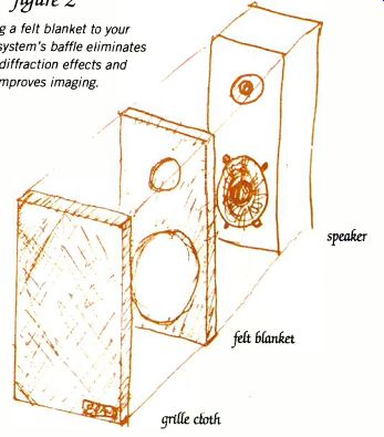 It's a converted sun porch that runs the length of the house. It's nearly 11 feet wide, and about three times that in length. What makes the space acoustically difficult is the glass windows that run the length of one long wall. They reflect every sound, creating the same overly bright effect I had been struggling with. On the positive side, the length of the room helps sustain an illusion of spatial depth to the sound reproduction that I have seldom heard on other systems. "What would you like to hear?" the Critic asks. The problem will more likely be that he has misplaced and can't find our selection, than that he doesn't have it. The walls are lined with CDs, many with Japanese and German labels. Low shelves under the windows hold hundreds of vinyl records. We listen and listen: Vivaldi and Bach; Rolling Stones; Cajun Zydeco, and religious choral works. Somewhere in all this music I remember to get technical and pry the grilles off his speakers. I carefully place and position the foam around the tweeter, forming a ring. We continue to listen. The Critic is showing off rare and unusual polycarbonate (that's what CDs are made of) he has collected in his travels. We try a few vinyl records, too, then switch back to CDs. Reluctantly, for I am enjoying just listening, I steer the conversation back to the sound quality: Specifically what improvement the foam tweeter rings have made. "I think it's better," the Critic demurs. "Have you tried felt?" "Felt?" I wonder. "Felt" says the Critic. "Cover the baffle with carpet felt. It will eliminate much of the baffle acoustically. Write about that, too, and I think you've got an article." We listen some more, and talk about food and houses and children and running and knee injuries, and promise to get together sooner rather than later, then say goodbye. On the way to the dinner party my wife insists on stopping at a mall, where she buys a couple of hundred dollars worth of CDs. She is looking for something the Critic played for us, a European issue of some Viennese choral group, not likely available in this country. She looks anyway, and keeps finding other recordings she wants. I help her and surreptitiously add a few boxes to the pile she has already put in my arms. FELT The next weekend I ask the man at the local carpet store for a yard of scrap carpet felt. He finds a left over piece. I offer to pay for it, but he gives it to me when I tell him it's for a magazine article on improving stereo equipment. I do have to give him advice on buying equipment. He already knows what he wants, and I reassure him he is making the right choice. There is enough felt for several speakers. This is a good thing, be cause it is not obvious to me how to fit the felt to the speakers or how to attach it or cut speaker holes of the right size in the right places: A false start or two seems likely. The material is about % inch thick with an embossed pattern on one side and loosely pressed-together fibers on the other. It shifts shape slightly as it is handled, so it isn't easy to work with. Through careful measuring I somehow get the holes in the right place on the first try. I've had the fore sight to cut the sides slightly large and the holes slightly small so I can trim for an exact fit. (See Fig. 2.) The next problem is attaching the felt to the speaker baffle. I double up heavy-duty masking tape, stick it to the baffle, and then .press the felt on. Before I can listen, the felt begins to sag. I don't want to use glue because the result would be irrevocable. I notice the speaker grilles are made from an elastic cloth stretched over a wooden frame. Perhaps if the felt were trimmed to fit within the frame, pressure from the cloth fabric would hold the felt in place? It works. I trim the felt for the other speaker, then sit down to listen. I expect the results to be exactly the same as with the foam rings-but no. The precise imaging is there, as are the clear but not harsh highs. To de scribe the effect in terms of perceived sensation rather than by measurements, it seems the sound is slightly smoother, not so harsh in the upper midrange. Perhaps calling it a liquid clarity, rather than a dry clarity, conveys the sensation. In any case, the improvement is subtle but obvious, offers everything the foam rings did, plus a little more. (The felt is still on my speakers. It sagged after several weeks, covering the tweeter and destroying the highs. I 'affixed it to the grille frame with two pieces of Mylar strapping tape at the top. Hanging in this fashion, it has held its shape ever since.) WHY IT WORKS A search of literature turned up several articles in the Journal of the Audio Engineering Society concerning imaging in speakers, as well as distortion caused by cabinet shape and interference between adjacent drivers. For clear stereo imaging, the frequency response of a pair of speakers must be precisely the same, differing by no more than half a decibel. Unless a speaker has properly mitered or rounded corners and edges, there will be a waver in the frequency response curve. Instead of a straight line, the response becomes a line of peaks and valleys. The location of these peaks and valleys varies with listening angle, and this is sufficient to interfere with a speaker pair's imaging capabilities. Another source of response irregularities is the cavity of the woofer's cone. A second requirement for precise imaging is that a speaker's off-axis response match its on-axis response. The Snells I purchased have an 8-inch woofer and a 1-inch dome tweeter. The crossover is at 2.7 kHz and is very sharp. The immutable Laws of Physics dictate that an 8-inch speaker with a 2.7 kHz input signal, where the wave length of sound is less than two inches, will beam its sound forward, whereas a 1-inch tweeter will diffuse its sound in all directions. Clearly, the on- and off-axis response of this or any other two way speaker system will not be the same in the vicinity of the crossover p