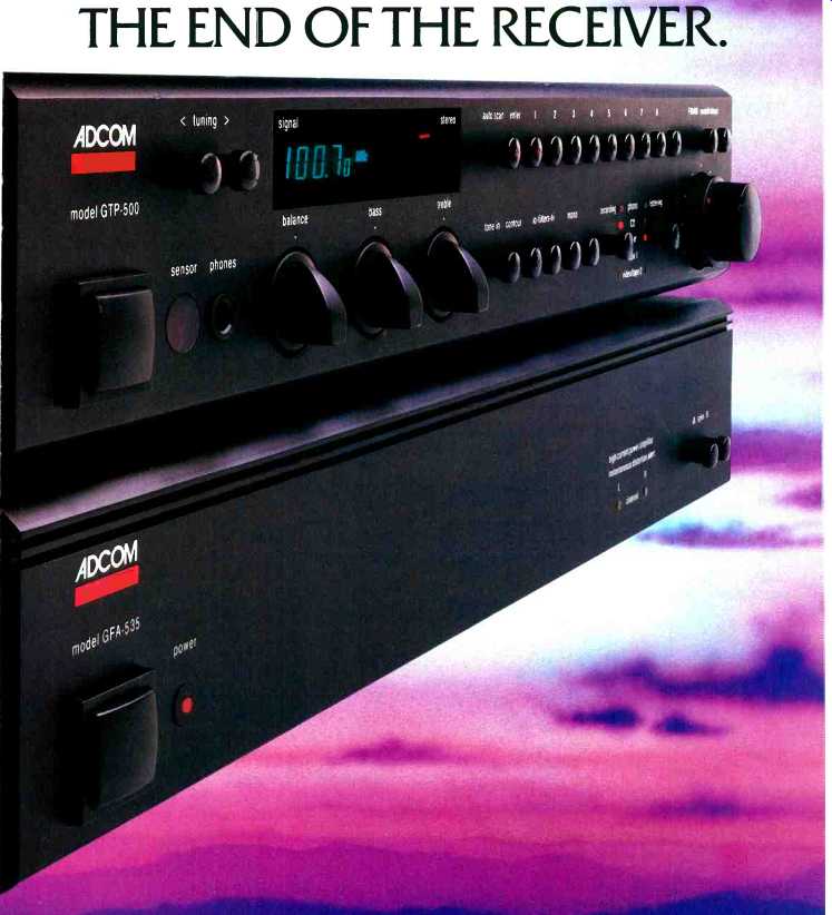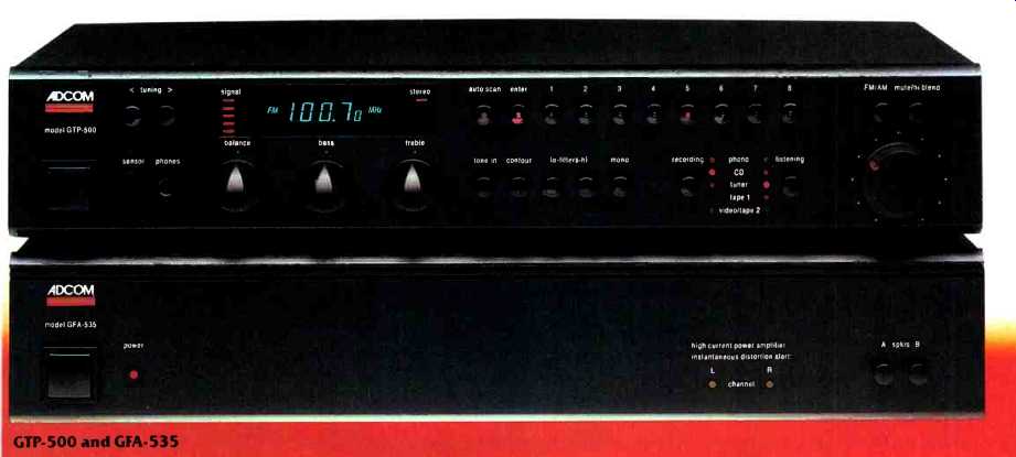 The primary objective: musicality. But tuning ease and accuracy under adverse reception conditions were only part of the design considerations. Even though the technical aspects of tuner design are certainly important, we consider optimum musical quality most important of all. We never forget that all high fidelity components are primarily a means to musical enjoyment. Our main design objective-to optimize sonic performance-is reflected only partially by the measured specifications. For example, the frequency-generating circuitry associated with digital synthesis tuning tends to raise the background noise and distortion level of a tuner. To avoid this problem, we adopted computer shielding techniques--including ribbon wire--to prevent the synthesized digital pulses from leaking into the high-gain front end of the tuner. Many operating and convenience features: In our concern for providing you with the best possible stereo reception, we haven't lost sight of ease and convenience. You can program up to sixteen stations into memory--eight each, FM and AM--for instant retrieval at the touch of a button. And the large, clear fluorescent frequency display can be read from across the room. (A built-in lithium battery preserves station memory during lengthy power outages.) A five-stage LED signal-strength display enables you to orient your antenna for optimum reception. If the signal from a favorite station is just too weak to be entirely noise-free, the switchable "high blend" circuit reduces high frequency noise to preserve listenability. And under extreme conditions where noise-free stereo signals can't be received at all, you have a stereo/mono switch for a practical compromise. Finally, as you can see at a glance, we've also taken care to present all this simply and attractively. And like most of our components, you have a choice of either all black, or a white or silver front panel. Please write for literature and reviews of other fine Adcom products. We will reply promptly. SPECIFICATIONS: FM Section: IHF sensitivity, mono: 9.5 dBf (1 6 uV) Signal strength for 50 dB quieting: Mono: 12.5 dBf Stereo: 36.5 dBf Capture ratio: 1.5 dB AM suppression: 70 dB Alternate channel selectivity: 80dB Separation at 1kHz: 52 dB Total harmonic distortion-stereo: 1 kHz: 0.05% 6 kHz: 0.09% Intermodulation distortion (SMPTE 4:1 ratio): 0.08% up to 100% modulation Maximum signal-to-noise ratio: Mono: 85 dB Stereo: 75 dB Frequency response: 30 Hz-15 kHz Antenna impedance: 75 or 300 ohms Line voltage: 120V/60Hz (available in 220V/50Hz on special order) Dimensions: (432mm x 83mmx 330mm D) Weight: 14 lbs. (6.4 kg) Optional accessory: Model RM-3 rack mount adapters. Available on special order with white front panel with white buttons, or silver panel with black buttons.