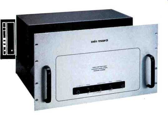 Operational Features Front-panel replaceable line and screen voltage fuses, with LED indicators. Two integral, low-noise fans for cooler operation, longer tube life. Front-panel switch allows "Hi" and "Lo" speeds. "Standby" switch for lower power consumption and less heat during warm-up periods or telephone interruptions. Automatic muting circuit provides silent shutdown upon power shut-off or interruption. No "thump" from speakers. Gold-plated input connectors connect "ground" before "hot". 1, 2, 4, and 8-ohm output taps. Front and rear handles for easier handling. M300: Preliminary Specifications (Power line stabilized at 120V.) POWER OUTPUT: 300 watts minimum continuous at 8 ohms from 16Hz to 25kHz with less than 0.5% total harmonic distortion (typically below .005% at 1 watt). Approximate actual power available at "clipping": 330W watts (1kHz). (Note that actual power output is dependent upon both line voltage and "condition," ie: if power line has high distortion, maximum power will be affected adversely, although from a listening standpoint this is not very critical.) POWER BANDWIDTH: (-3dB Points) 10Hz to 60kHz. INPUT SENSITIVITY: 1.5V RMS for rated output. INPUT IMPEDANCE: 60K ohms, nominal. OUTPUT REGULATION: Approximately 0.3dB, 8 ohm load to open circuit (Damping factor approximately 30) NEGATIVE FEEDBACK: 20dB. SLEW RATE: 25 volts/microsecond. RISE TIME: 3 microseconds. HUM & NOISE: Less than 2mV RMS 90dB below rated output (broad bandwidth unweighted, inputs shorted). POWER SUPPLY ENERGY STORAGE: Approximately 350 joules. POWER REQUIREMENTS: 105-125VAC 60Hz (210-250VAC 50Hz) 900 watts at rated output. 450 watts at "idle" 130 watts at "standby". DIMENSIONS: 19" (48 cm) W (standard rack panel) x 10.5 " (27 cm) H x 16" (41 cm) D (front panel back). Handles extend 1 5/8" (4.1 cm) forward of the front panel. Output connectors extend 1" behind rear panel. WEIGHT: 110 lbs. (50 kg) Net; 126 lbs. (57 kg) Shipping. TUBES REQUIRED: 8 x 6550 Power Output (Matched pairs will yield marginally better performance.). --------- SP9 STEREO PREAMPLIFIER The SP9 Hybrid Stereo Preamplifier represents a further evolution of the innovative electronic design first embodied in the widely acclaimed Audio Research SP11 Stereo Preamplifier. The SP9 is not a "stripped-down" version of the SP11, but rather represents an adaptation of some of the SP11's patented hybrid technology to a simpler, more economical single-chassis format. Using just two 6DJ8 vacuum tubes (one in the phono section and one in the high-level stage) in intermediary gain stages, the SP9 expresses the musicality and natural "rightness' vacuum-tube preamplifiers have been noted for, yet it does so with the quickness and dynamic vigor of the best solid-state designs. STEREO PREAMPLIFIER Because its two vacuum tubes are used so conservatively, the SP9 will undoubtedly prove to be one of the most reliable and low maintenance Audio Research preamps ever up to 10,000 hours of service life are possible before replacement of these tubes might be necessary. And, replacement tubes are not required to be select, low-noise (and expensive) types. Audio Research brand vacuum tubes obtained from your authorized dealer will provide the best performance and reliability. Although the SP9 contains an on-board power supply (as opposed to the SP11's isolated supply), it is a highly advanced, tightly regulated design employing a shielded toroidal power transformer to minimize any potential problems of mechanical noise or hum. Location of this transformer in relation to special low-hum input circuitry has been optimized within the SP9 chassis layout to virtually eliminate transformer-related noise. (Note that while outboard power supplies have become a popular design trend among high-end audio manufacturers, simply isolating the power supply from the main chassis has little benefit if the basic design of the supply itself is second-rate. In such cases, outboard isolation may be little more than a cosmetic cure for more serious deficiencies.) While the SP9 is designed to provide superb playback from phono records, its high-level circuits have also been optimized for other popular input sources, including compact discs. In this respect, the SP9 is virtually overload proof, insuring maximum enjoyment of today's most dynamic program material. And, with two tape monitor loops, the SP9 offers the tape dubbing flexibility so many listeners want but seldom find in an audiophile-grade preamplifier. Of course, all controls and switches used in the SP9 have been carefully specified and selected to insure minimal sonic degradation as have the other active and passive components used in the construction of the SP9. While the SP9 is more affordable than some other Audio Research preamplifiers, its more modest price was not achieved at the sacrifice of component quality. Careful, elegant design, structural simplicity and efficient manufacturing techniques have all contributed to a standard of physical integrity and musical accuracy never before achieved in this price class. To audition the SP9 Stereo Preamplifier, visit your authorized Audio Research dealer. Black front panel available at additional cost. Call or write for literature on the complete line of Audio Research products. Operational Features Automatic muting circuit for warmup, powerline voltage drop or interruption; plus manual (switchable) muting of main preamplifier outputs. Full tape functions: two inputs, two outputs, plus two-position tape monitor switching. Gold-plated input/output jacks selected for sonic purity. These connect “ground" before "hot," disconnect "hot" before "ground" for protection of other components. Shielded, toroidal power transformer for minimal mechanical noise and "hum." Phono section impedance internally adjustable for precise matching to moving-coil or moving-magnet phono cartridges. Tube complement: two 6DJ8 vacuum tubes (one in phono stage, one in line stage). Low noise (78dB 