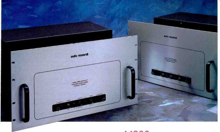 Audio Research Corporation--HIGH-DEFINITION MUSIC REPRODUCTION EQUIPMENT An unusual hybrid design with greater output efficiency from patented Audio Research circuitry. M300 HYBRID MONAURAL POWER AMPLIFIER Recently, Audio Research Corporation developed and patented (pending) new circuitry allowing hybrid utilization of Field Effect Transistors (FETs) with vacuum tubes in ways which can bring out the best in both devices. This circuitry is used in the relatively new, but already widely-acclaimed SP11 Preamplifier. Drawing from this technology, Audio Research has designed a new hybrid power amplifier, designated the M300 a monaural unit rated at 300 watts. M300 HYBRID MONAURAL POWER AMPLIFIER Most hybrid power amplifier designs use small signal-input vacuum tubes, then rely on FETs for the output stage. Audio Research has chosen instead to eliminate these low-level input tubes--tubes which can be prone to problems with hum, noise, microphonics, drift and, of course, require periodic replacement. The new FET "front end" is combined with Audio Research's long-famous, patented cross-coupled circuit to provide a design offering exemplary stability, reliability (low maintenance), and superior performance. These design advances have been coupled with yet another Audio Research patent: an output stage utilizing vacuum tubes, and partially cathode-coupled (as all previous Audio Research vacuum tube amplifiers have been), but with the screen (or accelerating) grids operating with a signal voltage precisely in phase with the cathode voltage. True "pentode" operation and efficiency is thereby achieved; however, all the advantages of partial cathode coupling are maintained. Advantages include: Efficiency up to 60% and above. (Class "A" designs achieve 25% to 50%, typically 30% to 35%.) Inherently better cross-coupling. Output transformer with lower "turns" and "impedance" ratios, resulting in greater bandwidth. Partial cancellation of saturation effects of the "DC" in the output transformer's core. Switching transients essentially eliminated, rendering the question of class of operation ("A," "AB," etc.) irrelevant. The virtues of Class "A" operation without the usual drawbacks. Bias adjustment is essentially non-critical. Output tubes need not be matched, although slightly better performance will result if they are. Lower internal impedance improves handling of complex speaker loads. To audition the M300 Monaural Power Amplifiers, visit your authorized Audio Research dealer. Black front panels available at additional cost. Call or write for literature on the complete line of Audio Research products.