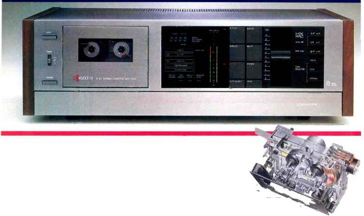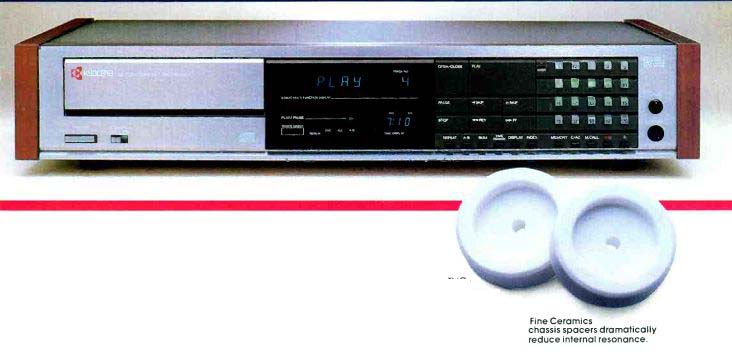 In May of 1983, Kyocera introduced a CD player with true 16-bit digital filters. Today, the competition's calling this circuit "the latest thing.' Years ago we had four-times oversampling. This year every high-end player worth mentioning has a similar design. In September, 1984 Kyocera raised some eyebrows with the world's first Fine Ceramics anti-resonant CD chassis. Now the stores are full of flimsy imitations. How did all these innovations happen to come from Kyocera, and not some household name? Perhaps because Kyocera's knowledge of digital circuitry comes from years of building computers for some of the best-known names in electronics. Perhaps because Kyocera is a world leader in Fine Ceramics, the technology used to house circuitry in aerospace, computers and other advanced systems. Or perhaps because some top-rated CD players from other brands were actually built by Kyocera. Now Kyocera has four world-beating Compact Disc Players. Each boasts technology so advanced, it's a preview of what the competition will be selling in 1989. After all, history does repeat itself. SOLVING THE PROBLEM OF RESONANCE Because the CD's track of pits is microscopically narrow, vibration can cause mistracking and its consequent data errors. In fact, controlled tests performed for Kyocera by an independent research laboratory confirm that a non-resonant Fine Ceramics chassis incurred significantly fewer data errors than a conventional chassis of similar design. That's why three of these new CD players feature Fine Ceramics spacers strategically located in the chassis. They isolate the laser transport and printed circuit boards from external vibration. In addition, dual zirconia-ceramic guide shafts, developed by the Kyocera Gamou Works, assure smoother travel of the laser transport for superior tracking stability. THE KYOCERA DA-310CX. Compatible with the Kyocera Full System Remote Control network Zirconia-ceramic laser guide shafts for smoother laser travel, longer life 16-bit double oversampling digital filters for maximum noise suppression 3rd-order bessel-derived analog filters for minimum phase shift Rigid metal chassis construction Floating laser subchassis Three beam laser tracking for superior tracking stability Gold-plated output jacks Skip forward and Back Two-way repeat (disc and track) 16-selection programmability "Dedicated" wireless remote control supplied Multi-function fluorescent display Headphone output with volume control Wood side panels. THE KYOCERA DA-410CX. ALL THE FEATURES OF THE DA-310CX, PLUS: Anti-resonant construction with Fine Ceramics chassis spacers for fewer data errors, lower distortion DC analog amplifier with left/right phase compensation for improved stereo imaging Direct random track selection with 10-key pad Timer playback capability. THE KYOCERA DA-510CX. ALL THE FEATURES OF THE DA-410CX, PLUS: Digital filtering with four-times oversampling at 176.4 kHz to minimize aliasing noise Dual digital-to-analog converters eliminate interchannel phase delay Optically coupled digital signal routing to eliminate internal interference Direct digital output for connection to other digital components Digital Subcode Output port for disc information output Three way repeat: disc, track and phrase Direct random track selection with 20-key pad Intro Scan plays a ten-second sample of each track on the disc Background Music function plays songs on the disc in random sequence. THE KYOCERA DA-710CX. ALL THE FEATURES OF THE DA-510CX, PLUS: Separate digital and analog power supplies minimize interference Dual monaural audio circuit maintains high separation 100% discrete components in the analog output stage for minimum distortion Low-noise LC-OFC wiring 99-track direct access. --------Fine Ceramics chassis spacers dramatically reduce internal resonance. CASSETTE DECKS: Two heads can be better than three. For years, cassette deck manufacturers have touted the three-head feature. Again and again, we are told that three heads are the only way to achieve frequency response to 20 kHz. So many brands have devoted so much attention to this argument that it seems heretical to suggest there's a better way. In fact, doing three heads properly is an extremely expensive proposition. And doing it poorly is a sure way to sacrifice performance. Proponents of three-head design like to gloss over the fact that any three-head deck with pretentions to high performance must come to grips with the problem of azimuth error. Azimuth error occurs when the playback head gap does not line up precisely with the signals laid down by the record head gap. This kind of error can never occur on two-head decks, where the record and playback gaps are exactly the same. Less than one degree of azimuth error can cause significant loss of response above 15 kHz. And that's ironic, because extended highs were supposed to be the strength of the three-head design in the first place. Some manufacturers try to reduce azimuth error by placing the record and playback heads close together-often squeezing them through the cassette's central window. Others try to conquer azimuth error through elaborate mechanics and electronics. To be fair, the more elaborate systems do work, but only at incredible cost to the consumer. And the simpler systems? If the response falls short of 20 kHz on Type II tape, then the azimuth error correction is not completely successful. Kyocera has a fresh approach. We maintain that a properly designed two-head deck can give you exemplary frequency response. And our decks prove it. Instead of spending money on elaborate azimuth error correction, we consciously spent the money on reducing wow & flutter. A TRANSPORT OF DELIGHT. The most audible shortcoming of today's decks is wow & flutter. That's why Kyocera concentrated on improving the transport. On the D-811, we used two capstans, isolated by a closed-loop belt, for minimum modulation noise. We gave the takeup capstan direct drive. We supplied a separate hig