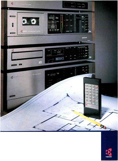 How to carry a 100-Watt MOS FET Receiver, a Dolby HX Pro Cassette Deck, and an anti-resonant Compact Disc Player around the house. Kyocera puts one high-end audio system in many rooms. The finer your audio system, the more you should enjoy it. So why confine your listening pleasure to just one room? Imagine having beautiful music throughout your house. In the bedroom as you get dressed. In the family room as you relax. In the Riving room as you entertain. Now imagine all this music coming from a single audio system of consummate fidelity. Not long ago, this kind of flexibility was just a dream. It would have taken several separate hi-fi systems to accomplish this feat-with tremendous expense and duplication of components. But the tiny remote sensor of Kyocera's new Full System Remote Control network has changed all that For the cost of separate systems of marginal quality, you can assemble a single Kyocera system of audiophile quality--and enjoy that system in several rooms. If you want to make your audio system the centerpiece of your living room, you'll be happy to know that Kyocera components are as beautiful as any on the market. But if you'd rather tuck your Kyocera components discreetly away, you can still enjoy them-and operate them via wireless remote control, CD PLAYERS: Kyocera presents the features they'll be copying next. ![]() ![]()
