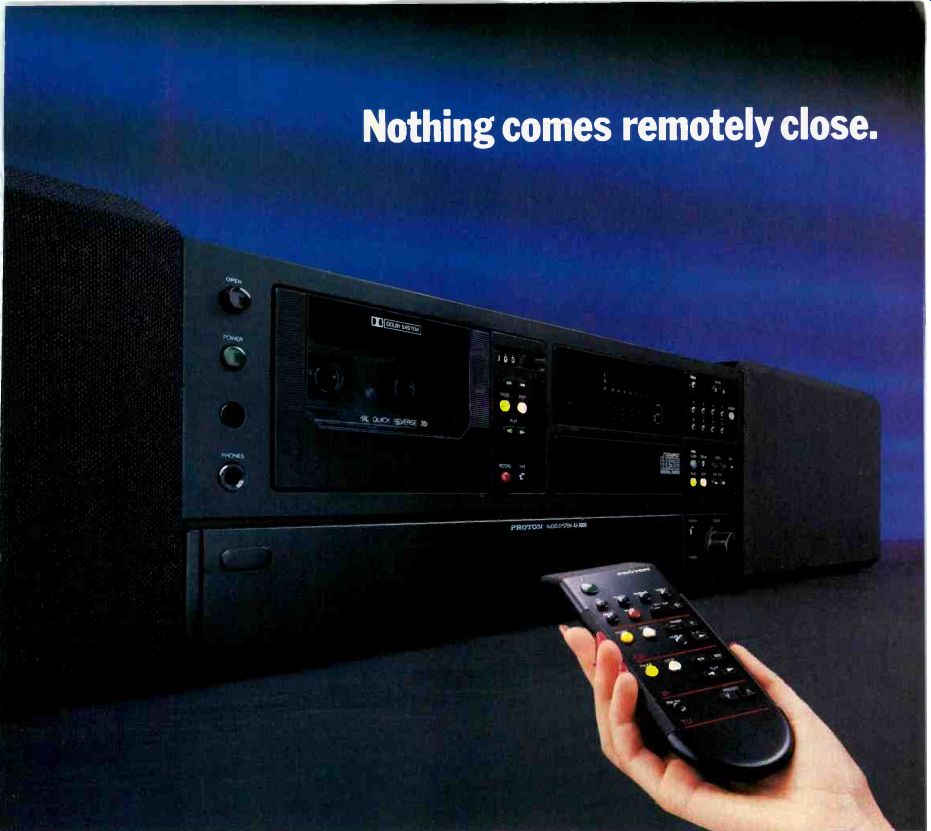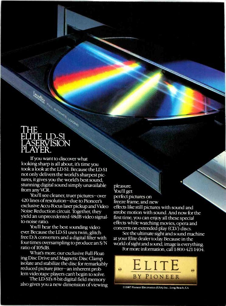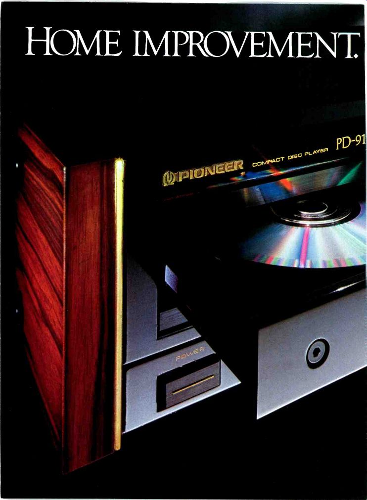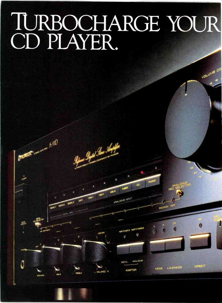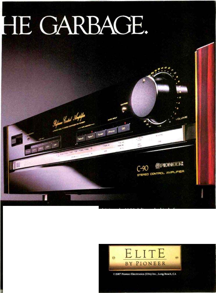 ![]() Pioneer HOME IMPROVEMENT THE ELITE PD-91 FULL 18-BIT CD PLAYER. If you're still not completely satisfied with CD sound, if you have the nagging feeling something's still missing...you're right. 14-bit, 16-bit or even "floating" 18-bit CD players simply can't deliver all the rich potential of compact disc sound. It's time for a little Home Improvement a brilliant improvement at that. Meet the Elite'" SeriesPD-91. The compact disc player that lets you hear CD sound in its fullest glory. The PD-91 employs 8-times oversampling and full 18-bit linear twin D/A converters to yield an amazing 16-fold improvement in retrieval of ambient cues, harmonic detail and "air" around instruments and vocalists. It's an improvement so dramatic your ears will perk up instantly. To build a player this superior demanded inexeclible attention to detail. Example The PD-91's analogue circuitry is pure Class A for lowest distortion and highest musicality. Inside, you'd see four separate power supplies and eleven voltage regulators-to keep critical small-signal audio information fire from interference lb additionally minimize electrical interaction, portions of the PD-91'E circuitry are defeat able-like front panel illumination, headphone amplifier and the analogue output section when digital outputs are being used. ![]() The PD-91 incorporates an outboard power transformer, Pioneer's exclusive copper-plated honeycomb chassis and special ceramic components to combat extraneous vibrations that can destroy signal integrity. The PD-91's special linear motor delivers the world's fastest track access (1/2-second). You also get flexible seven-way pr g, full random play, and, of course, full remote control. Optical as well as coaxial outputs make the PD-91 future-perfect as well. Want instant Home Improvement in your music system? Then come treat your ears to the PD-91. For your nearest Elite dealer, call 1-800-421-1404. 01988 Pioneer Electronics. ( USA) Inc., Long Beach, CA ![]() THE ELITE LD-S1 LASERVISION PLAYER. If you want to discover what looking sharp is all about, it's time you took a look at the LD-S1. Because the LD-S1 not only delivers the world's sharpest pictures, it gives you the world's best sound, stunning digital sound simply unavailable from any VCR. You'll see cleaner, truer pictures-over 420 lines of resolution-due to Pioneer's exclusive Accu-Focus laser pickup and Video Noise Reduction circuit. Together, they yield an unprecedented 48dB video signal to-noise ratio. You'll hear the best sounding video ever. Because the LD-S1 uses twin, glitch-free D/A converters and a digital filter with bur-times oversampling to produce an S/N ratio of 105dB. What's more, our exclusive Full-Floating Disc Drive and Magnetic Disc Clamp isolate and stabilize the disc far remarkably reduced picture jitter-an inherent problem videotape players can't begin to solve. The LD-S1's 8-bit digital field memory also gives you a new dimension of viewing pleasure. You'll get perfect pictures on freeze frame, and new effects like still pictures with sound and strobe motion with sound. And now for the first time, you can enjoy all these special-effects while watching movies, opera and concerts on extended-play (CLV) discs. See the ultimate sight and sound machine at your Elite dealer today. Because in the world of sight and sound, image is everything. For more information, call1-800-421-1404. 1987 Pioneer Electronics ( USA) Inc., Long Beach, CA ![]() THE ELITE A-91D INTEGRATED AMPLIFIER. Now that the compact disc has taken the world by storm, ordinary amplifiers are failing their driving test. Because ordinary amplifiers simply can't handle the dynamic range and purer signal that digital sound delivers. Fortunately, the A-91D is far from ordinary. Because the A-91D is built with one thought in mind-to maximize the performance of digital sound. With 170 watts per channel into 4 ohm speaker loads, and 120 watts into 8 ohms, the A-91D unleashes digital's full dynamic range. Extra-large capacitors and huge finned cast-iron enclosed transformers further contribute to the A-91D's high current capacity and stability into speaker loads as low as 2 ohms. Along with all this power comes unprecedented purity. You can plug the latest CD players with optical outputs directly into the /91D, and reap the rewards of independent digital conversion circuitry with twin, glitch-free D/A converters, a digital filter with four-times oversampling, and an analog lowpass filter made 1h from quality discrete parts. The A-91D also uses Pioneer's exclusive Non-Switching-Type III amplifier circuit to totally eliminate switching distortion. What's more, critical signal paths are kept extraordinarily short for less electronic interference and cleaner sound. When it comes to digital sound, there's no such thing as good vibrations. That's why the A-91D uses a special anti-vibration honeycomb design in the chassis frame. In isolation barriers between electronic sections. Even in all five insulator feet. A large aluminum volume control knob with a specially balanced brass shaft also absorbs distortion-causing vibration, and printed circuit boards are mounted in rubber for the same reason. The A-91D is not only ready for digital, it's ready for the future. With six digital inputs (2 optical), and three digital outputs (1 optical). So if you want your digital sound to drive you to new heights, you need to drive your digital components with the Elite A-91D. For more information, call 1-800-421-1404. ELITE BY PIONEER. 01987 Pioneer Electronics (LISA) Inc., Long Beach, CA ![]() THE ELITE M-90 AND C-90 REFERENCE COMPONENTS Hum, hiss, crosstalk, vibration: distortion in your audio signal. Graininess, specks, flecks, litter: extraneous noise in your video image. Take out the Garbage The Elite C-90 pre-amp and M-90 power amp are no-compromise components designed to get rid of it. By keeping critical signal paths as short as possible By offering you direct CD connection. B