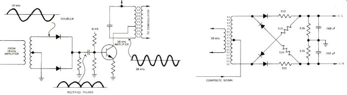 by LEONARD FELDMAN A Modern Switching-Circuit Decoder HAVING previously considered the way in which a so-called "Time Division" or "switching" stereo-multiplex decoder works, it would be well to examine in detail a latter-day circuit embodying these principles. Starting with the basic concepts described last month, many manufacturers have embellished their circuits to such an extent it is often difficult to "pick out" the elements of the decoding process. Usually, the refinements are present for two very good reasons-first, to improve performance specifications, such as separation at all frequencies, adequate residual 38- and 19-kHz rejection following demodulation and so on, and secondly, to incorporate such convenience features as automatic switching of mode (from monophonic to stereo FM) , stereo indicator lights, and the like. A straightforward and clean design is to be found in the MPX decoder section of the Sony STR-6120 Receiver and, with the kind permission of that company, we shall use elements of that design to describe the "decoding" process in terms of an actual, currently marketed, design. Since this particular receiver is in a fairly high-priced category, its designers incorporated just about every feature that can be found in modern stereo FM circuitry, and it will therefore serve well for these illustrative purposes. A block diagram of the circuit is shown in Fig. 1. The input signal, taken from the output of the ratio detector and without any de-emphasis applied, is first amplified by a composite amplifier stage. Outputs are taken from both the collector and the emitter of this transistor amplifier. The collector is followed by a tuned circuit, adjusted to resonate at 19 kHz (the pilot-signal frequency) which, together with a transformer tuned to the same frequency, eliminates everything in the composite signal but the desired 19 kHz and couples this signal to a 19-kHz amplifier. The 19-kHz signal developed at the collector of this stage is transformer coupled to a full-wave rectifier consisting of a pair of diodes. This portion of the circuit is shown schematically in Fig. 2. Since the pulses produced by the pair of rectifiers are not filtered, two such pulses are produced for each cycle of 19 kHz, as shown in the figure. It is these non-sinusoidal, but fairly large-amplitude pulses which are used to trigger the mono-stereo mode switch shown at the lower left of the block diagram of Fig.. 1, and about which we shall have more to say later. The collector circuit of the next stage (38-kHz amplifier) is tuned to 38 kHz by means of a resonant tank circuit. The resulting sinusoidal 38-kHz signal is transformer coupled to a bridge-type demodulator circuit, which differs from the simple, two-diode demodulator previously analyzed, as shown in Fig. 3. Referring back to the composite amplifier of Fig. 1, the signal derived from the emitter of that stage contains all the frequencies of the composite signal--i.e. main-channel frequencies from 50 Hz to 15,000 Hz, the 19-kHz pilot signal, stereo sideband signals in the range from 23 to 53 kHz and, if SCA (Background Music Subscriber Service) is transmitted, the frequency-modulated 67-kHz subcarrier as well. The entire composite signal is first passed through a 19-kHz band-elimination filter, to remove that component, and then through a 67-kHz filter to eliminate frequencies associated with any possible SCA transmission. The resultant composite signal is applied to the center tap of the secondary winding of the demodulator transformer shown in Fig. 3. By employing four diodes in a balanced-bridge arrangement, the system cancels most of the residual 38-kHz products which would otherwise be present in the simpler two-diode arrangement. Alternate conduction of upper and lower diodes (as alternate polarities of 38 kHz are applied to each end of the secondary winding) results in the detection, or sampling, of the L and R signals at their respective output lines. Note that in the block diagram of Fig. 1 we have labeled these outputs as L and .^'R, the wiggly symbol being a mathematical term meaning "approximately" --that is, approximately L only and approximately R only. For many reasons, beginning way back in the i.f. system or at the output of the main channel ratio-detector, the "mix" between main-channel program content and sub-channel sidebands may have become unbalanced in both amplitude and phase. Unless this "mix" is in precisely the correct proportions, there will be some R in the L line and some L in the R line. How Sony compensates for this "impure" separation will be shown shortly. --------- ![]() Fig. 1--Block diagram of the Sony STR-6120 stereo FM decoder circuit. ![]() Fig. 2--Full-wave rectifier followed by tuned amplifier "doubles" the 19-kHz pilot signal to 38 kHz. Fig. 3--Balanced-bridge demodulator circuit used to recover L and R signals. --------- You will recall that up to this point, no de-emphasis has been applied to the signal, since to have done so previously would have resulted in nearly total attenuation or elimination of the vital super-audible frequencies which are a part of the composite signal prior to stereo demodulation. That process is accomplished now, after demodulation, and because two distinct signals now exist, a de-emphasis network is required for each. The networks themselves consist of nothing more than the usual R-C network to "roll off" the high frequencies in a prescribed manner (75-microsecond time constant, just as in monophonic FM). At this point in the circuit, Sony introduces a HIGH BLEND switch which, by means of a small capacitor connected between the L and R circuits, permits the mixing together of the higher audio frequencies. Since this, in effect, ruins separation at these high frequencies, you might wonder why such a "partial stereo defeat switch" would be introduced. It can be shown that the high-frequency noise associated with stereo FM, in the presence of a weak signal, appears in