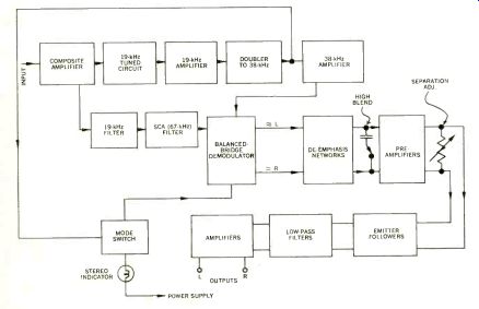 Only careful initial design can take care of these phase-response differences between channels and between main- and sub-channel components, so that a separation figure of 40 dB at all frequencies is rarely achieved in a practical design. A separation of 40 dB at mid -frequencies, however, is realizeable and has been noted for several of the better stereo receivers and tuners currently available. Interestingly, the FCC requires only approximately 30 dB of separation at all frequencies in the transmission process and most popular phono cartridges don't even do that well on stereo discs (though stereo tapes can do a lot better). Following the separation adjustment, the two signals are fed through a pair of emitter followers to provide a low source impedance for the low pass filters which follow. These filters remove any residual 19 kHz, 38 kHz, 57 kHz,. and 76 kHz (the latter two being harmonics of the first two) which might still be present. One or more of these frequencies, though inaudible by themselves, might beat with the local bias oscillators of tape recorders you might use to record "off the -air" stereo FM, creating unexpected whistles and squeals in your valued recordings. Accordingly, the designers of this circuit have added extra filtering to remove the last vestiges of these unwanted frequencies. Finally, the signals are passed through a pair of conventional voltage amplifier stages, very likely to raise the signal level to match other signal inputs to this particular receiver. -------------- (Audio magazine, 11/1969) Also see: How Disc Masters Are Made Today = = = = |